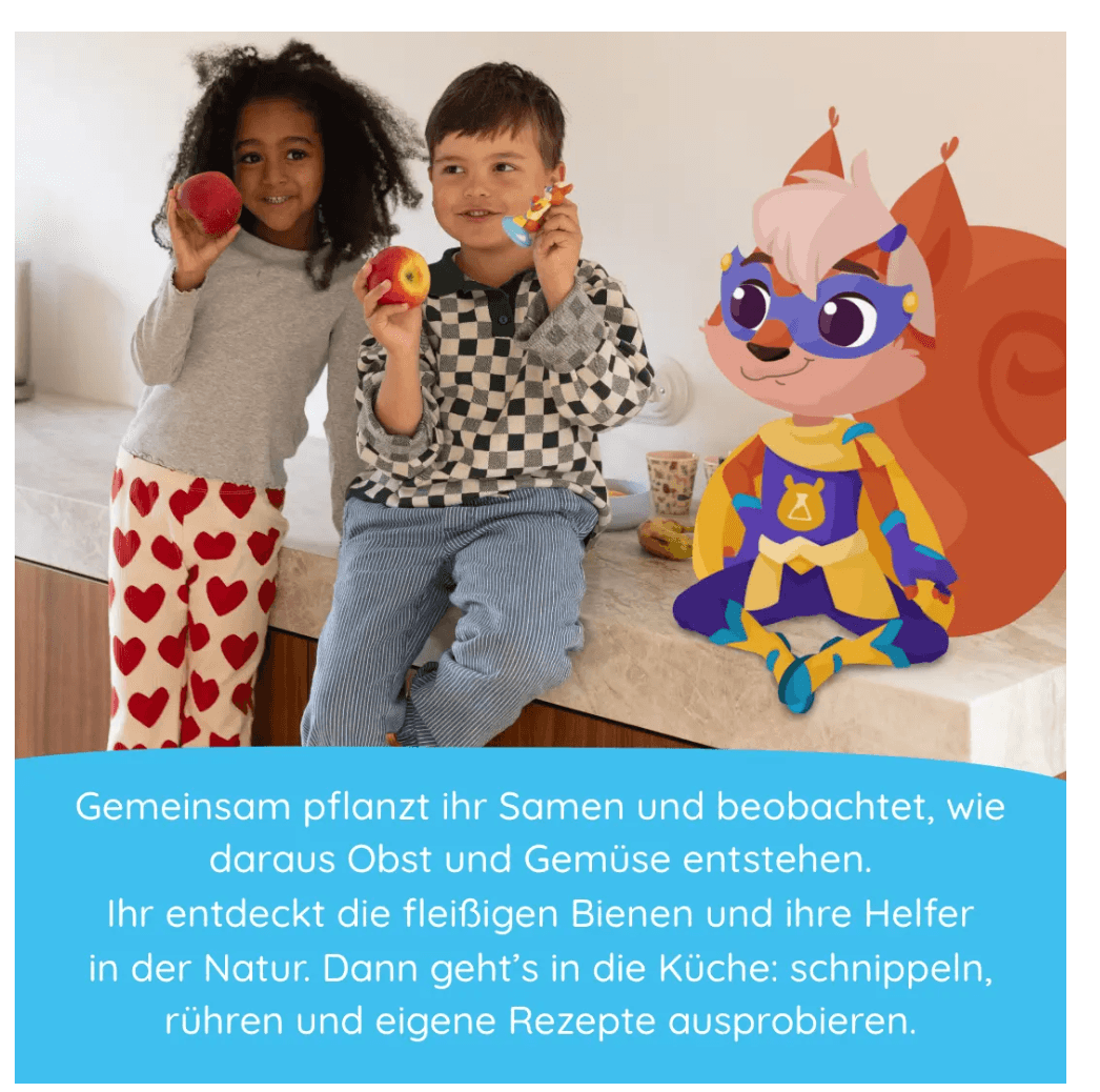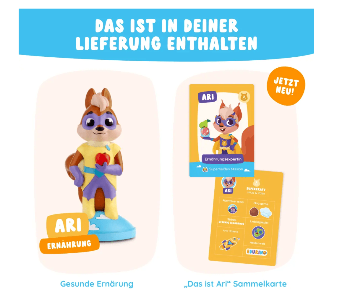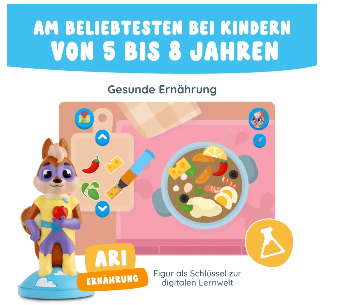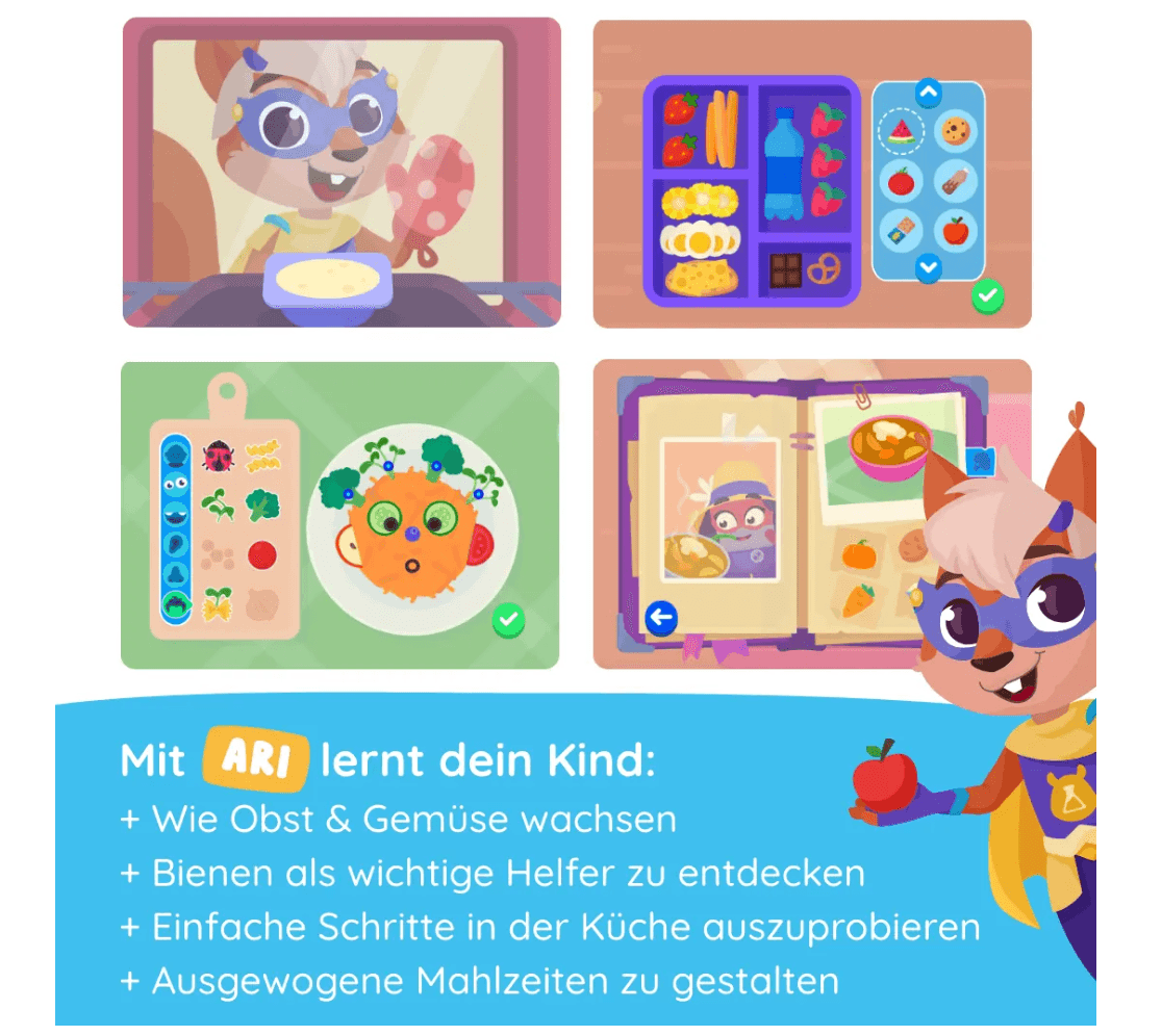 Mit der interaktiven Lernfigur Ari entdecken Kinder im Alter von 5–8 Jahren spielerisch die Welt der gesunden Ernährung. Die Figur schaltet spannende Inhalte in der EDURINO-App frei: Vom Anbau von Obst und Gemüse über einfache Küchenfähigkeiten bis hin zu wichtigen Hygieneregeln. Kinder lernen, ausgewogene Mahlzeiten zuzubereiten, Lebensmittelgruppen zu verstehen und Verantwortung in der Küche zu übernehmen.