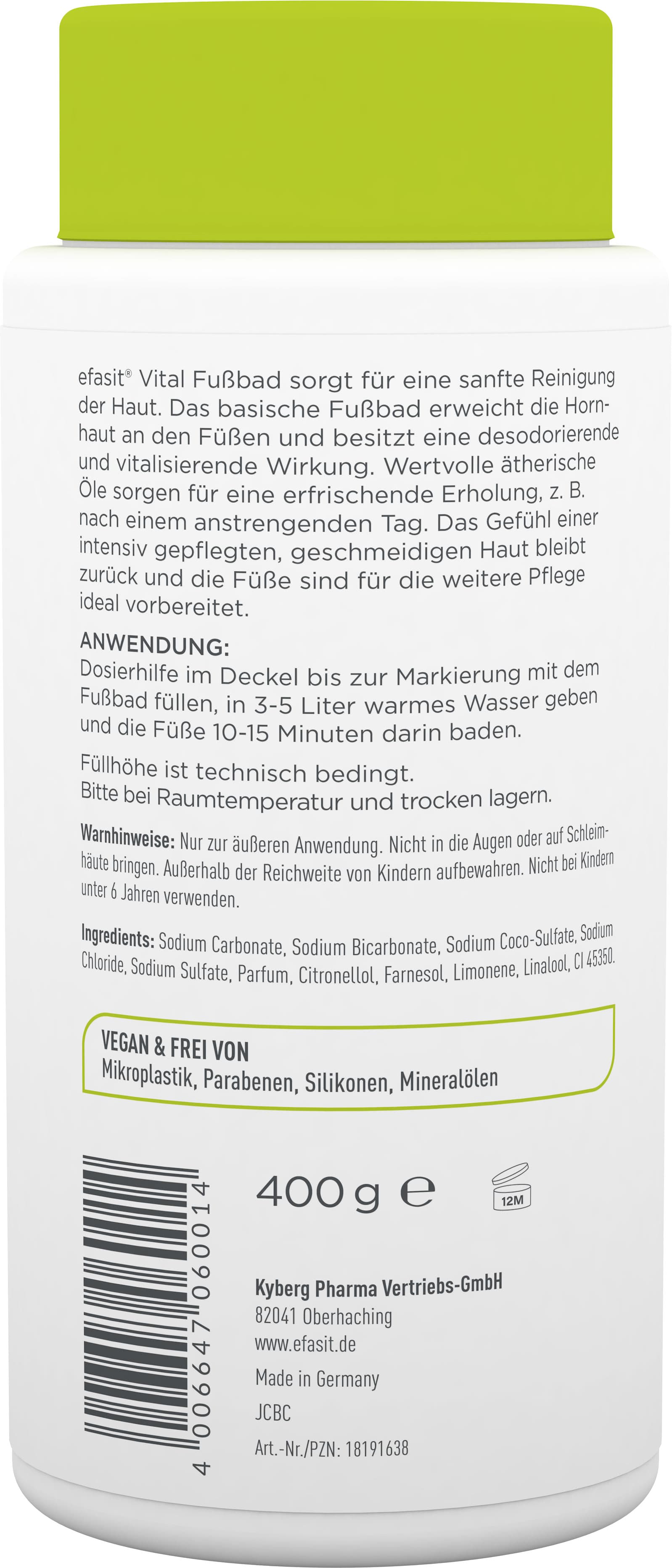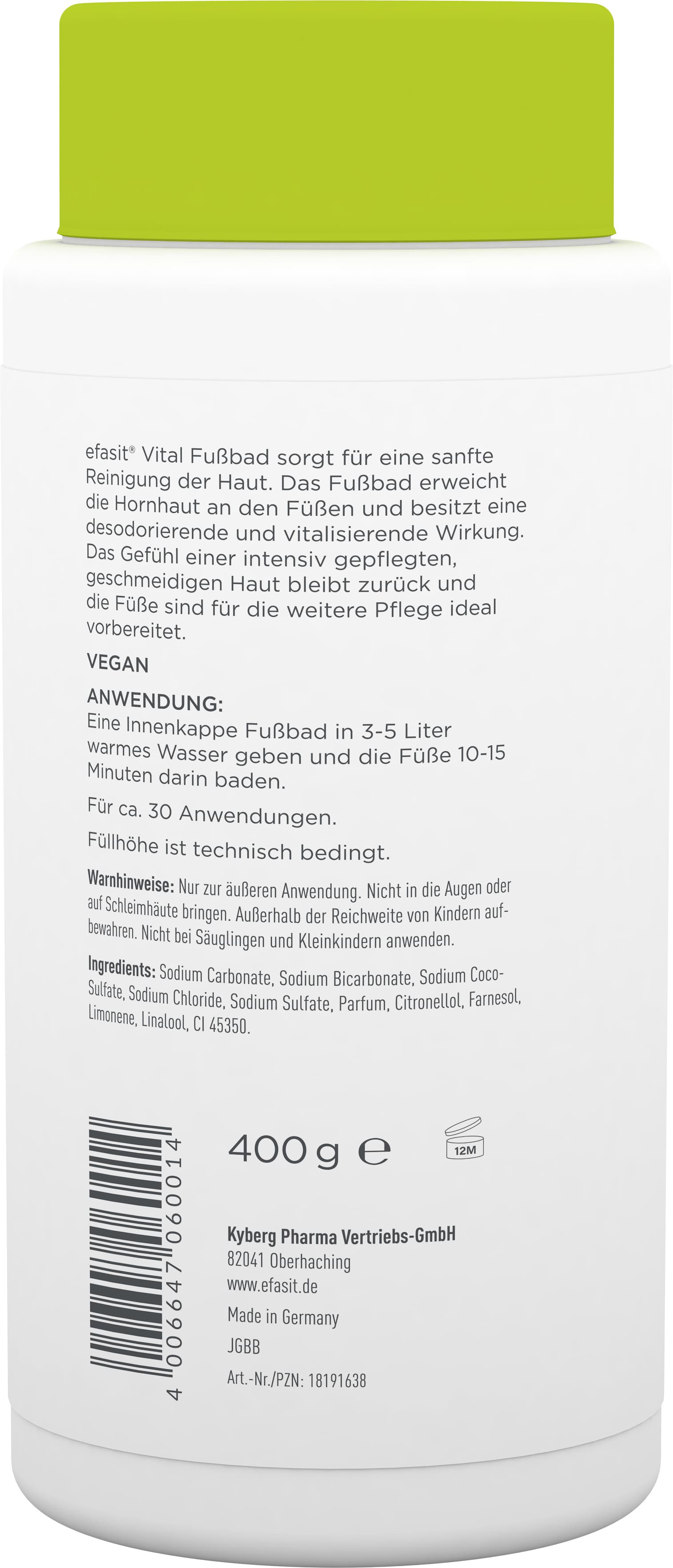 efasit Vital Fußbad sorgt für eine sanfte Reinigung der Haut. Das Fußbad erweicht die Hornhaut an den Füßen und besitzt eine desodorierende und