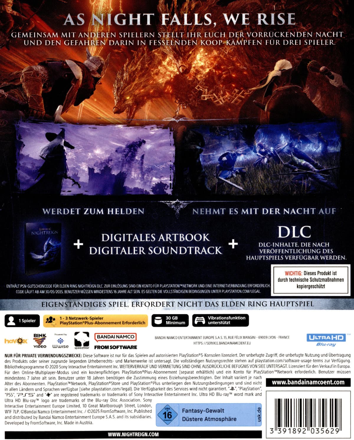 As Night Falls, We Rise. ELDEN RING NIGHTREIGN ist ein eigenständiges Abenteuer im ELDEN RING-Universum, das eine neue Spielerfahrung bietet, indem es das Kerndesign des Spiels neu erfindet. Ein unabhängiges Spin-Off, für das ihr Elden Ring weder besitzen, noch gespielt haben müsst. Auch die Story hängt nicht zusammen, da Night Reign in einem Paralleluniversum angesiedelt ist. STEIGT ZUSAMMEN AUF Gemeinsam mit anderen Spielern stellt Ihr Euch der vorrückenden Nacht und den Gefahren darin in fesselnden Koop-Kämpfen für drei Spieler. WERDET ZUM HELDEN Übernehmt das Kommando über Helden mit unvergleichlichen Begabungen, eigenen Talenten und einzigartigem Design. Auch allein sind sie nicht zu unterschätzen, aber ihre wahre Stärke entfaltet sich erst, wenn sie sich zusammentun und ihre Talente kombinieren, um mächtige Synergien auszunutzen. NEHMT ES MIT DER NACHT AUF Überwindet eine unaufhaltsame Umweltgefahr, die ein Land heimsucht, das sich zwischen jeder Spielsitzung wandelt, und besiegt den furchtsamen Fürsten jener Nacht! ELDEN RING NIGHTREIGN ist ein eigenständiges Abenteuer im ELDEN RING-Universum, das eine neue Spielerfahrung bietet, indem es das Kerndesign des Spiels neu erfindet. Das Basisspiel Elden Ring ist zum Spielen nicht erforderlich. Die Seekers Edition enthält: • Das Basisspiel auf CD • Zusätzliche DLC's (kostenloser DLC's bei Neukauf enthalten, einmalig verwendbar) • SteelBook Hülle - Premium-Metallhülle mit vollfarbiger Illustration des Wylder • Digitales Artbook - Exklusive Informationen über die Entwicklung in Form von Illustrationen und Konzeptzeichnungen (kostenloser DLC's bei Neukauf enthalten, einmalig verwendbar) • Mini Digital Soundtrack - Eine Auswahl von Orchesterstücken als Erinnerung an Limveld (kostenloser DLC's bei Neukauf enthalten, einmalig verwendbar) Der Einzelspieler-Modus benötigt, unabhängig von der Plattform, keinen Onlinezugang oder ein Online Service Abonnement.