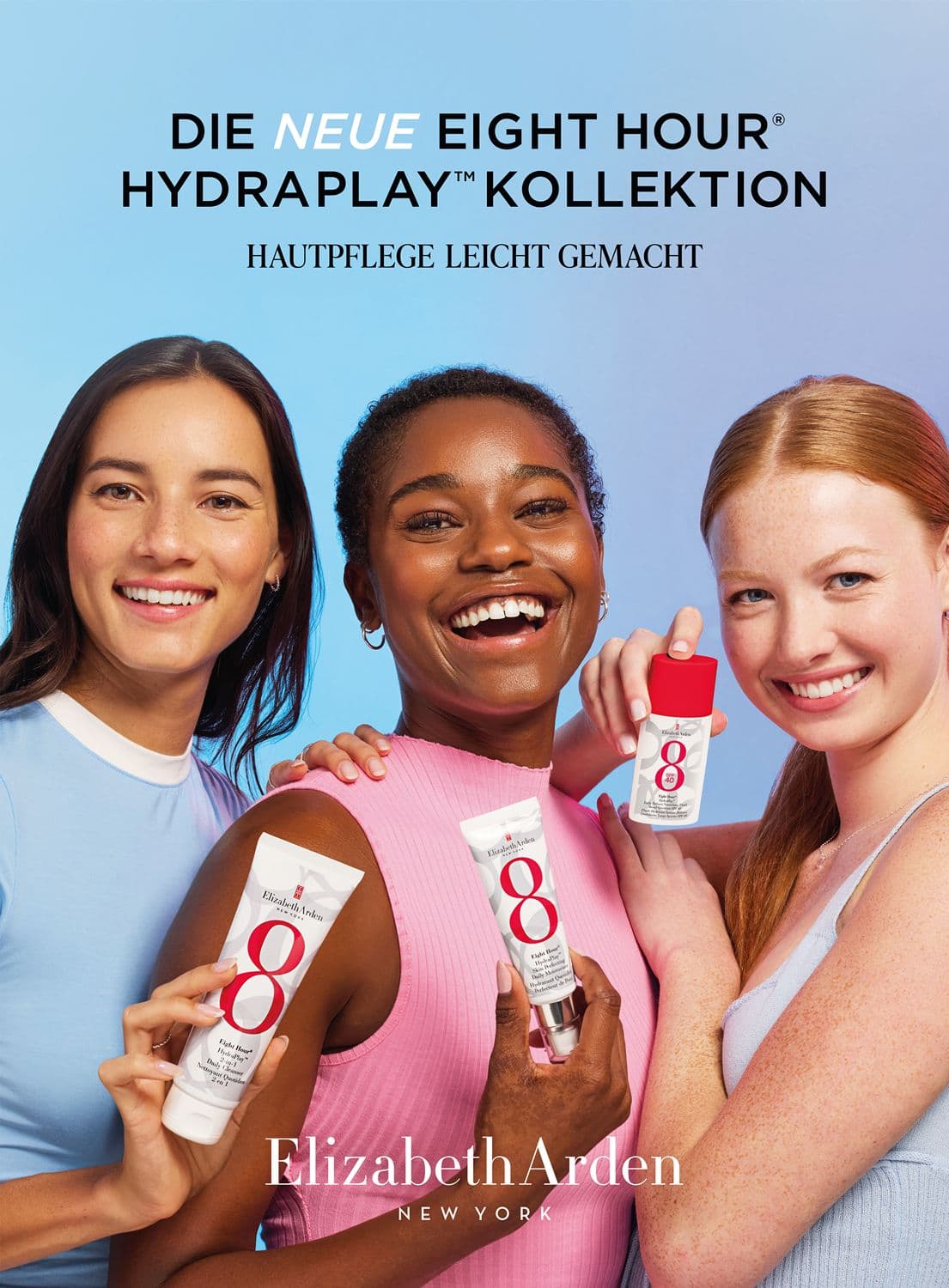 NEU von der ikonischen Eight Hour® Cream, HydraPlay™, das 8-in-1-Multitasking-Feuchtigkeitswunder. Ein unverzichtbarer Retter der Haut, der schnell einzieht und Ihre Pflegeroutine vereinfacht. Es spendet Feuchtigkeit, hellt auf, kontrolliert Öl, verfeinert die Poren und macht die Haut perfekt. Nach 2 Wochen sieht die Haut heller aus, fühlt sich glatter an, die Poren sind verfeinert und die Klarheit ist verbessert (1). Unmittelbar nach dem Auftragen sorgt es für eine gleichmäßige Grundlage für das Make-up (2) und nach 1 Monat ist der Hautton gleichmäßiger (3). Die Formulierung enthält 95 % natürlich gewonnene Wirkstoffe*: Glycerin und Hyaluronsäure versorgen die Haut mit Feuchtigkeit und lassen sie praller aussehen, aus Zuckerrohr gewonnenes Squalan stärkt die Feuchtigkeitsbarriere der Haut und ein botanischer Unschärfekomplex kontrolliert überschüssiges Öl und verwischt sichtbare Unregelmäßigkeiten für ein mattes Finish. Sanft genug für alle Hauttypen, auch für empfindliche Haut**. Nicht komedogen. Vegan. (1) Basierend auf einer Verbraucherstudie mit 64 Proband*innen, nach 2 Wochen, einschließlich selbst empfindlicher Haut. (2) Basierend auf einer Verbraucherstudie mit 64 Proband*innen, unmittelbar nach dem Auftragen von Make-up. (3) Basierend auf einer Verbraucherstudie mit 64 Proband*innen nach 4 Wochen, einschließlich selbst wahrgenommener empfindlicher Haut. *Basierend auf dem Gehalt an Rohstoffen natürlichen Ursprungs. **Selbstwahrnehmung.