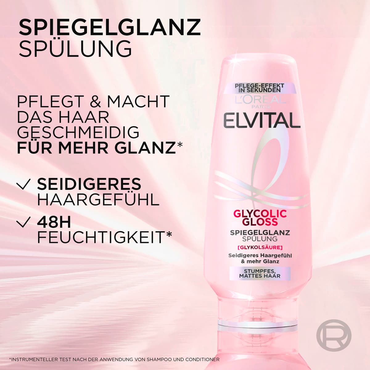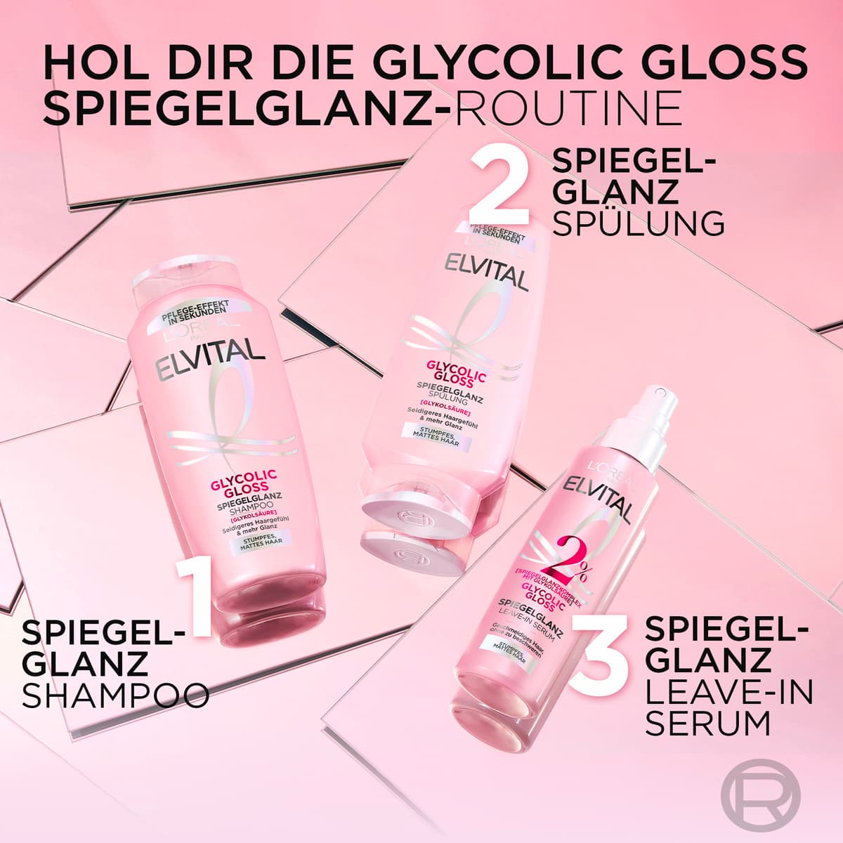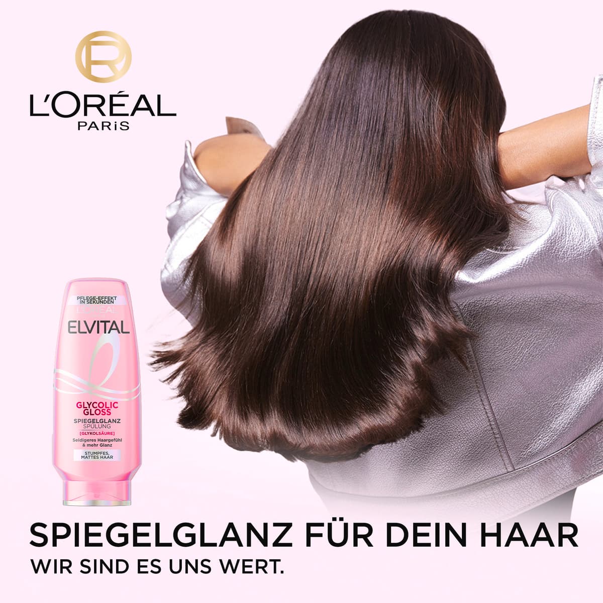 - Die L'Oréal Paris Elvital Glycolic Gloss Spülung verleiht dem Haar echten Spiegelglanz