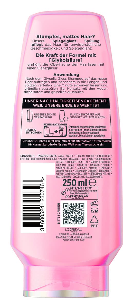 | Anwendungshinweis | Die Elvital Glycolic Gloss Spülung von L’Oréal Paris nach der Haarwäsche mit dem Elvital Glycolic Gloss Shampoo in Längen und Spitzen auftragen und gleichmäßig verteilen. Eine Anwendung am Haaransatz sowie direkt auf der Kopfhaut sollte vermieden werden, um das Haar nicht zu beschweren. Den Conditioner anschließend eine Minute einwirken lassen und danach gründlich mit klarem Wasser ausspülen, bis keine Rückstände mehr im Haar vorhanden sind. |
