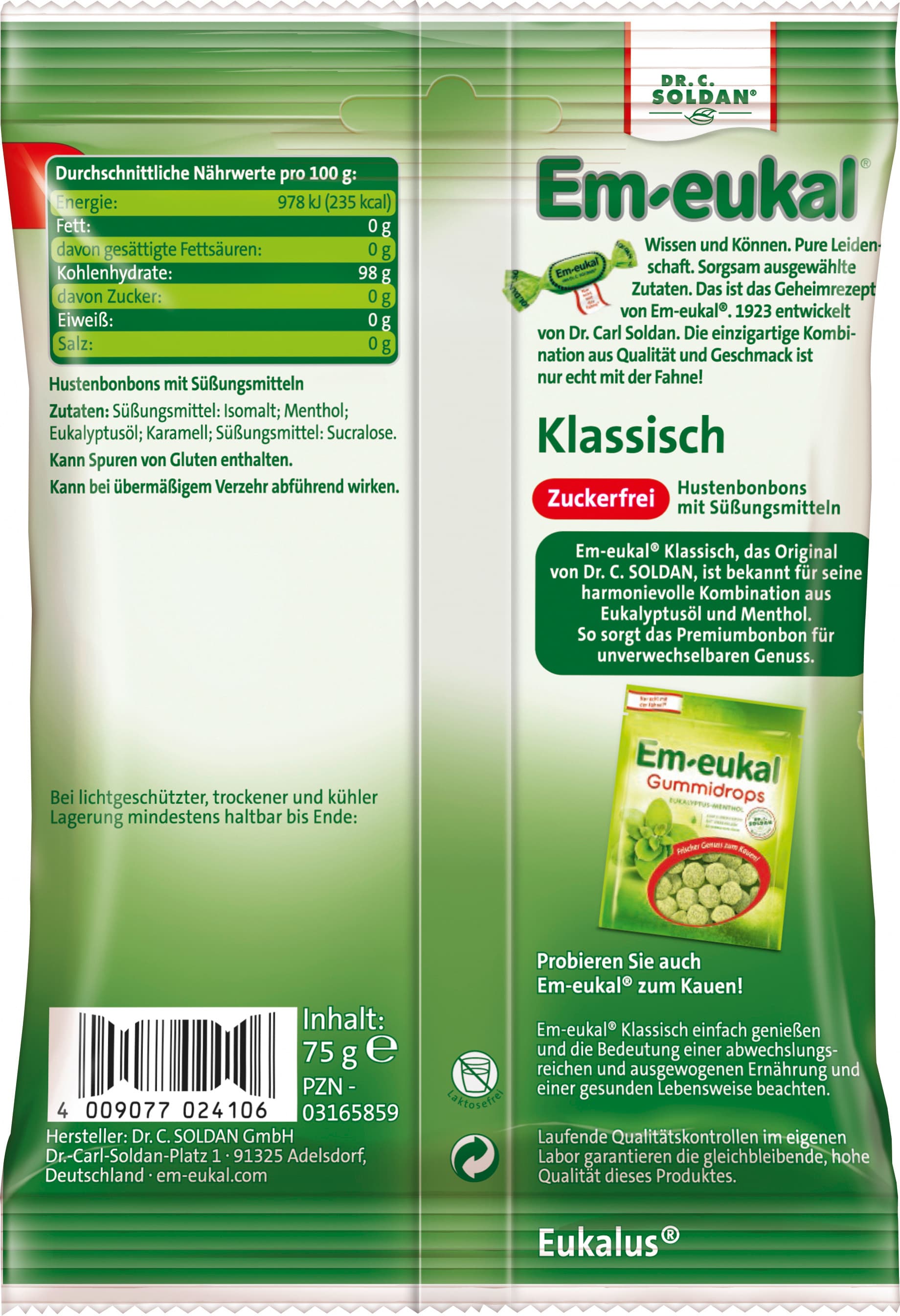 Grün. Stark. Das Original.Der zuckerfreie Klassiker von Em-eukal ist berühmt für seine starke Kombination aus Eukalyptusöl und Menthol. Und sorgt so immer und überall für Wohlbefinden. Nach dem Originalrezept von Dr. Carl Soldan aus dem Jahr 1923.- Hustenbonbons mit Süßungsmitteln- zuckerfrei- „Nur echt mit der Fahne“® – Garant für höchste Premiumqualität und Bonbonkochkunst