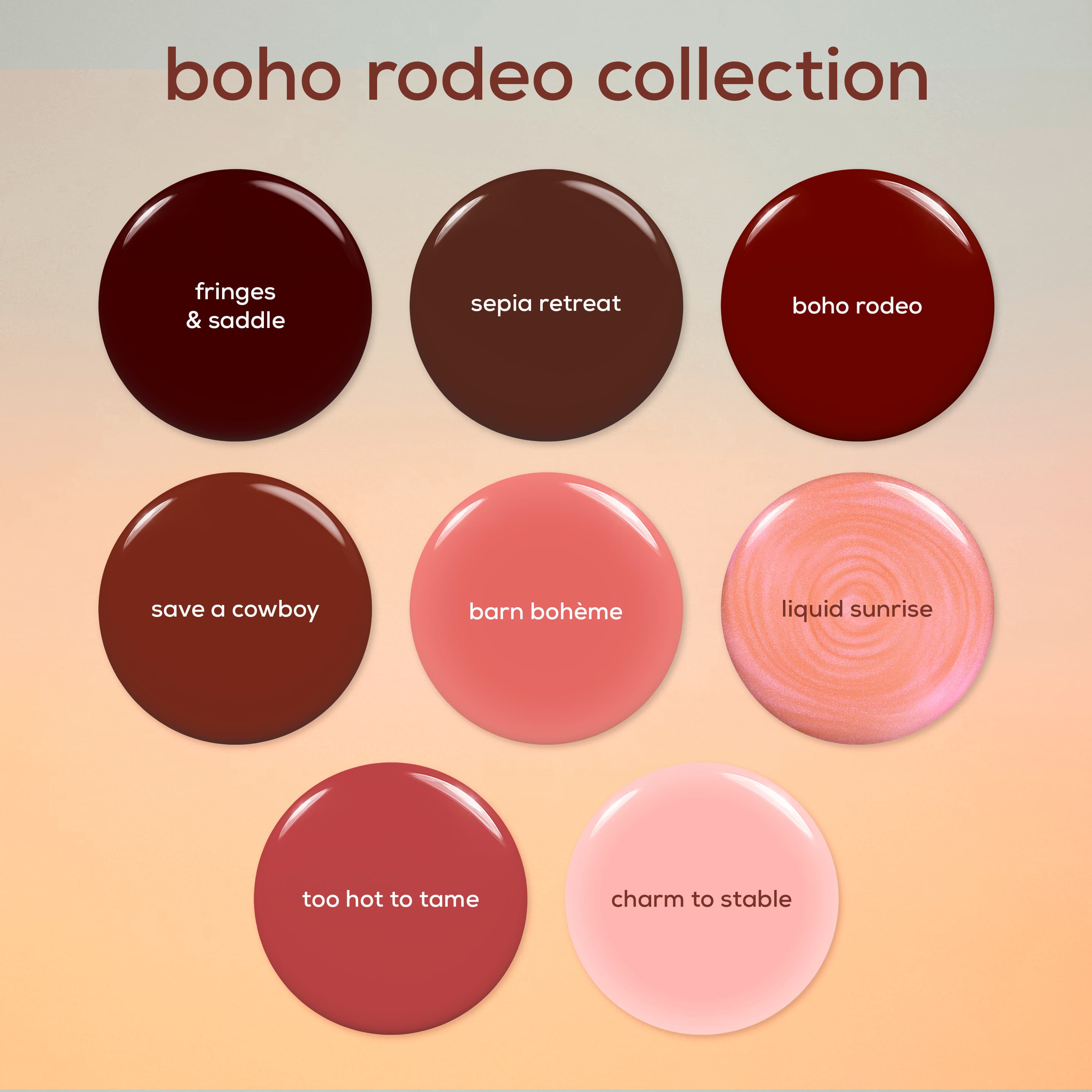Die Weite der Prärie mitsamt ihren warmen Canyons, strahlenden Sonnenuntergängen und dem Geruch nach Leder liegt in der Luft mit der limitierten boho rodeo-Kollektion von essie. Diese zeigt sich von neutralen Erdtönen inspiriert, lässt Boho auf Rodeo treffen und versprüht ein Gefühl von Freiheit. Die cremige Formel lässt sich dank des speziellen Pinsels schnell und einfach auftragen und hinterlässt haltbare und ultra-starke Nägel für eine Maniküre wie vom Profi.