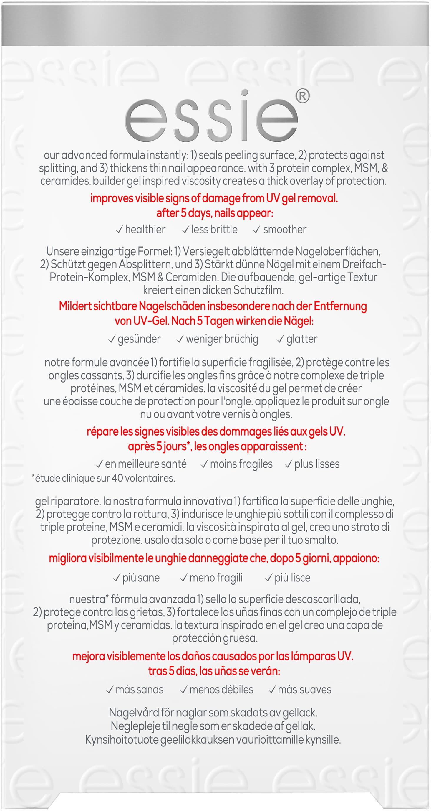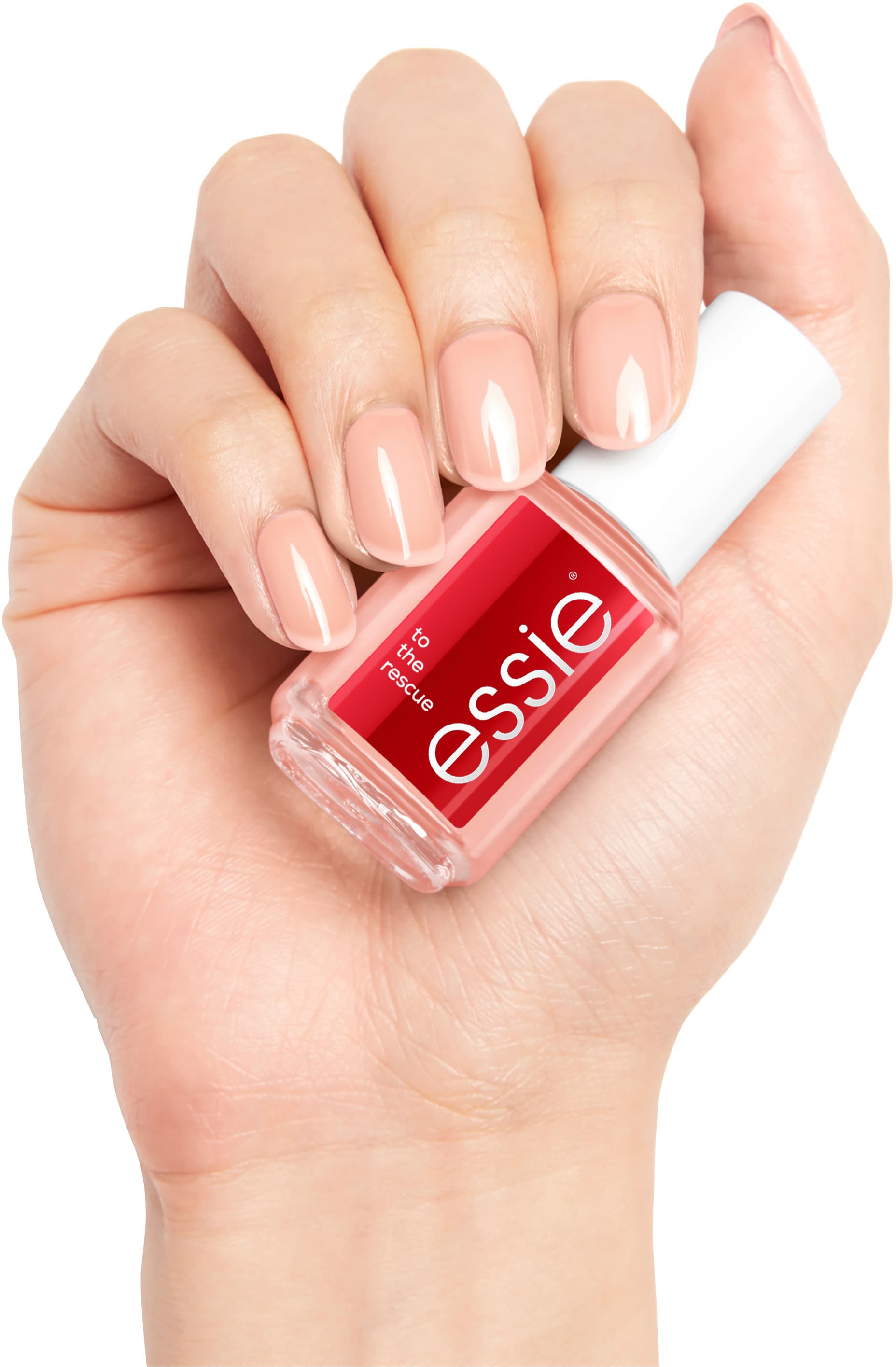 Schnelle und effektive Hilfe gegen rissige und brüchige Nägel! Die innovative Formel mit dreifachem Proteinkomplex und stärkenden Ceramiden hilft bei der Regenerierung beschädigter Nägel – in nur 5 Tagen. Die gelartige Textur des to the rescue nail repair von essie überzeugt mit einer leichten, natürlich aussehenden Abdeckung und gläzendem Finish für einen dezenten und natürlichen Look. Der pflegende Nagellack besteht aus veganen Inhaltsstoffen und kommt ganz ohne Formaldehyd aus, legt sich wie ein Schutzschild auf die Nägel und schützt sie vor dem Absplittern und versiegelt abblätternde Oberflächen langfristig. Dünne, von z.B. Acrylnägeln oder von der UV-Gel Entfernung beschädigte Nägel werden in kürzester Zeit aufgebaut und repariert.