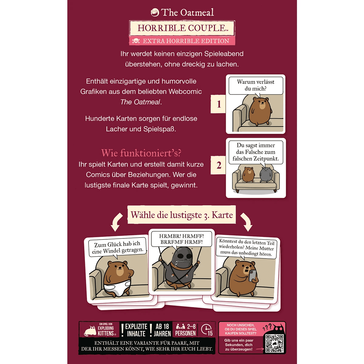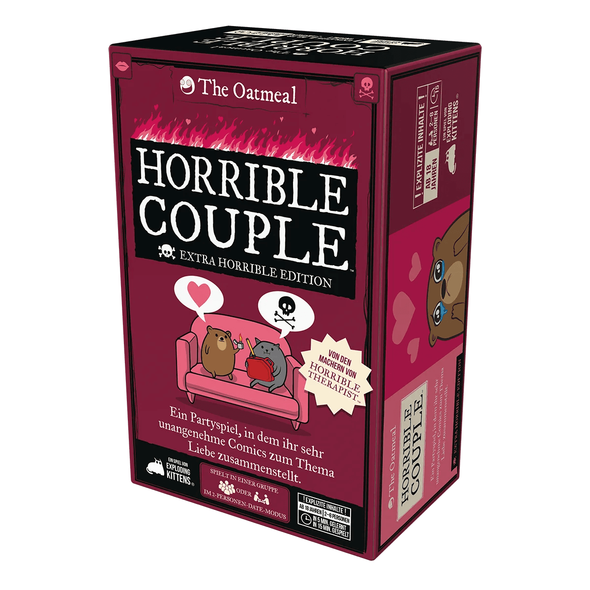 Tauche ein in die Welt des schwarzen Humors mit Horrible Couple – Extra Horrible Edition! Dieses Partyspiel für Erwachsene bringt euch zum Lachen, Staunen und manchmal auch zum Kopfschütteln. Perfekt für Spieleabende mit Freunden oder als witziges Geschenk für Paare, die keine Tabus kennen.