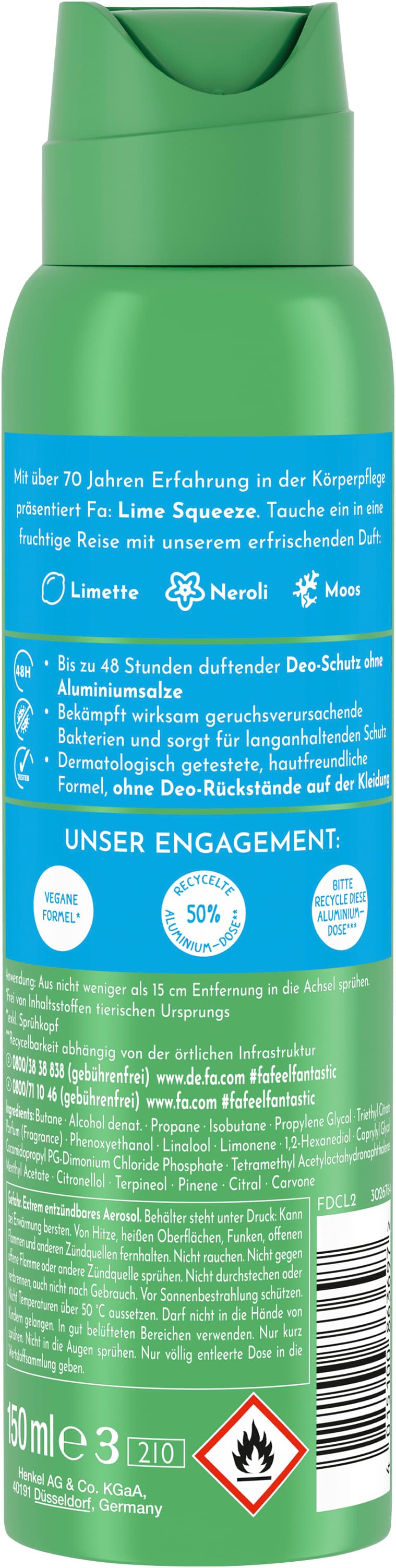 Fa Deospray Lime Squeeze – Deodorant mit dem erfrischenden Duft von Limette Tauche ein in die Welt von Fa und erlebe mit dem Fa Deo den erfrischenden Duft nach Limette. Das Deospray kämpft effektiv gegen geruchsauslösende Bakterien und sorgt für 48 h Deo-Schutz ohne Aluminiumsalze. Zudem ist die Formel vegan*, dermatologisch getestet, hautfreundlich und hinterlässt keine Deo-Rückstände auf der Kleidung. Die Produktvorteile im Detail: Deo Spray für bis zu 48 h Deo-Schutz Frischer Limetten-Duft Ohne Aluminiumsalze Antibakteriell Dermatologisch getestete, hautfreundliche Formel Hinterlässt keine Deo-Rückstände auf der Kleidung Vegane Formel* *frei von Inhaltsstoffen tierischen Ursprungs