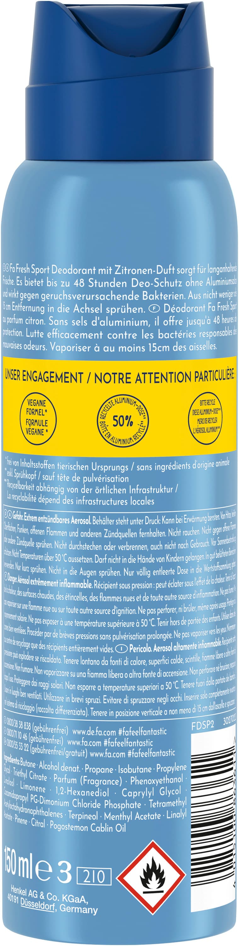 Fa Deospray Fresh Sport – Deodorant mit dem erfrischenden Duft von Zitrone Tauche ein in die Welt von Fa und erlebe mit dem Fa Deo den frischen Duft von Zitrone. Das Deospray kämpft effektiv gegen geruchsauslösende Bakterien und sorgt für 48 h Deo-Schutz ohne Aluminiumsalze. Zudem ist die Formel vegan*, dermatologisch getestet, hautfreundlich und hinterlässt keine Deo-Rückstände auf der Kleidung. Die Produktvorteile im Detail: Deo Spray für bis zu 48 h Deo-Schutz Frischer Zitronen-Duft Ohne Aluminiumsalze Antibakteriell Dermatologisch getestete, hautfreundliche Formel Hinterlässt keine Deo-Rückstände auf der Kleidung Vegane Formel* *frei von Inhaltsstoffen tierischen Ursprungs