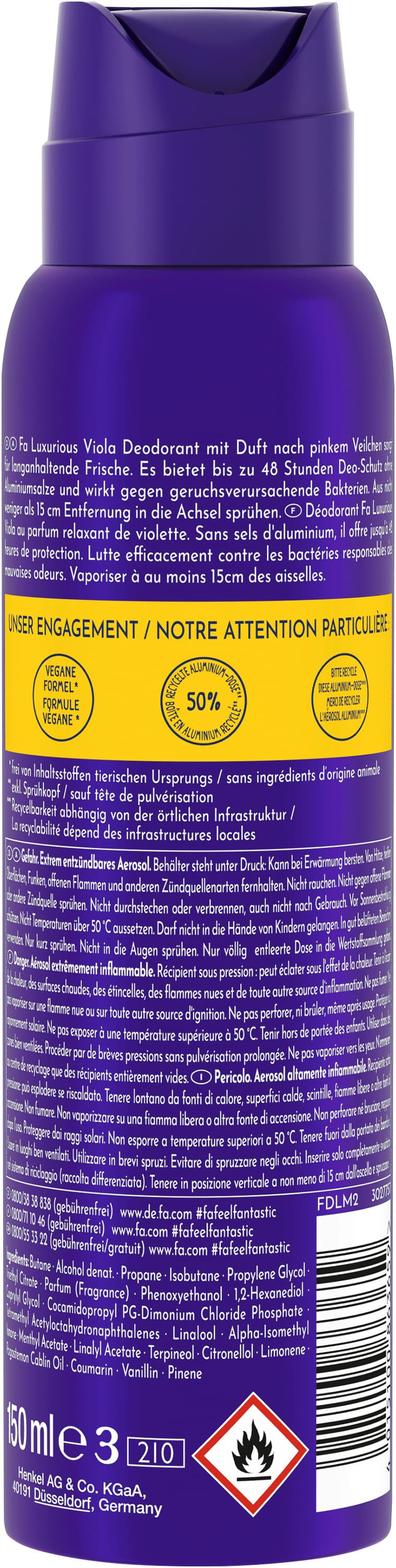Fa Deospray Luxurious Viola – Deodorant mit dem beruhigenden Duft von pinkem Veilchen Tauche ein in die Welt von Fa und erlebe mit dem Fa Deo den beruhigenden Duft von pinkem Veilchen. Das Deospray kämpft effektiv gegen geruchsauslösende Bakterien und sorgt für 48 h Deo-Schutz ohne Aluminiumsalze. Zudem ist die Formel vegan*, dermatologisch getestet, hautfreundlich und hinterlässt keine Deo-Rückstände auf der Kleidung. Die Produktvorteile im Detail: Deo Spray für bis zu 48 h Deo-Schutz Pinker Veilchen Duft Ohne Aluminiumsalze Antibakteriell Dermatologisch getestete, hautfreundliche Formel Hinterlässt keine Deo-Rückstände auf der Kleidung Vegane Formel* *frei von Inhaltsstoffen tierischen Ursprungs
