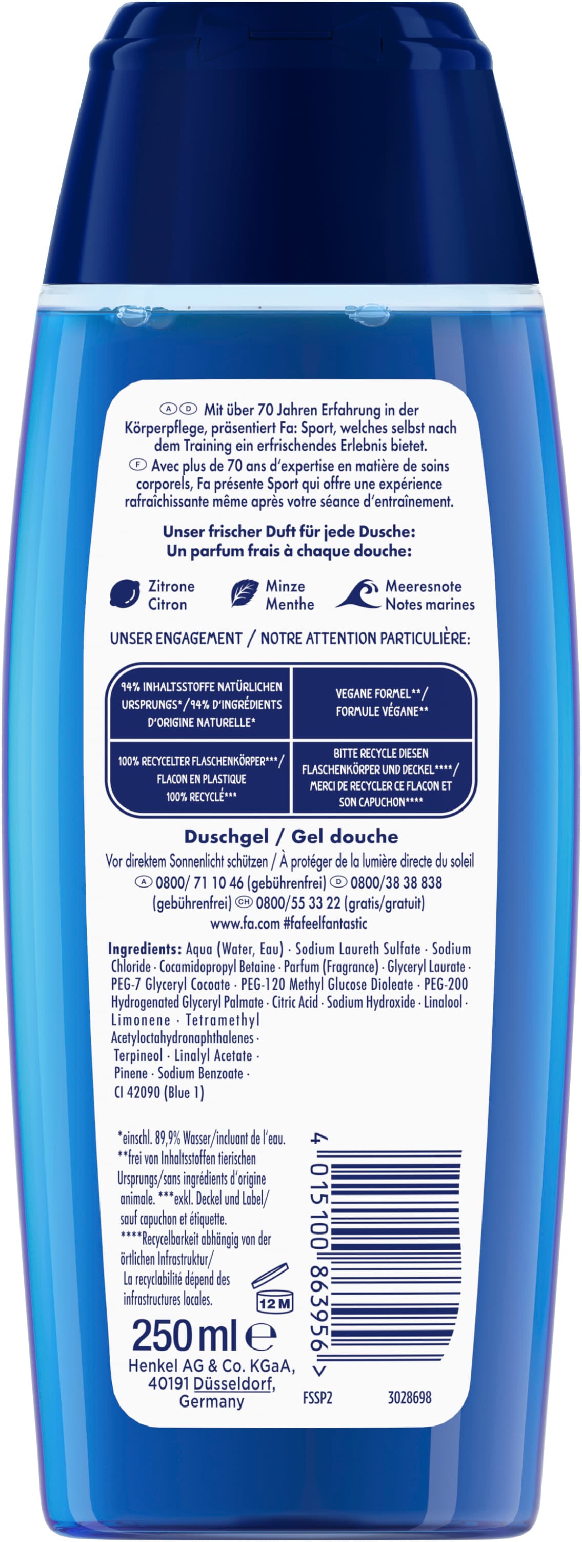 FA Duschgel Fresh Sport – Vegane Duschcreme mit erfrischendem DuftMit mehr als 70 Jahren Erfahrung in der Körperpflege präsentiert FA die Fresh Sport Duschcreme, die selbst nach dem Training ein erfrischendes Erlebnis bietet. Das Duschgel für Frauen ist sanft zur Haut und hat einen frischen Duft nach Zitrone, Minze und Meeresnote, der dich besonders energetisiert und erfrischt fühlen lässt.Gut für dich & den Planeten: Das FA Duschbad enthält 94 % Inhaltsstoffe natürlichen Ursprungs¹, hat eine vegane Formel², einen 100 % recycelten Flaschenkörper³ und ist recycelbar⁴. Die Produktvorteile im Detail: Erfrischende Duschcreme Energetisierender Duft Sanft zur Haut 94 % Inhaltsstoffe natürlichen Ursprungs¹ Vegane Formel² 100 % recycelter Flaschenkörper³ Recycelbare Verpackung⁴ ¹ inkl. Wasser² frei von Inhaltsstoffen tierischen Ursprungs³ ohne Label und Etikett⁴ exkl. Etikett, Recyclingfähigkeit abhängig von der lokalen Infrastruktur