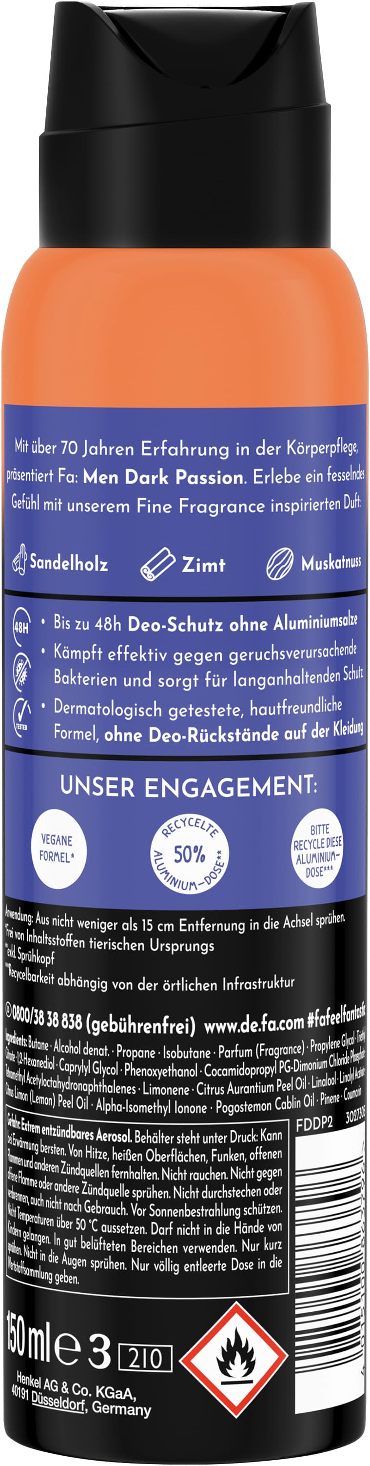 Fa Deospray Dark Passion - Tauche ein in die Welt von Fa! Schicke deine Sinne jeden Tag auf eine abenteuerliche Reise und genieße den sinnlich-frischen Duft.Zuverlässiger Schutz - erlebe bis zu 48h Deo-Schutz ohne Aluminiumsalze - kämpft effektiv gegen geruchsauslösende Bakterien und sorgt für langanhaltenden Schutz - dermatologisch getestete, hautfreundliche Formel, ohne Deo-Rückstände auf der Kleidung.