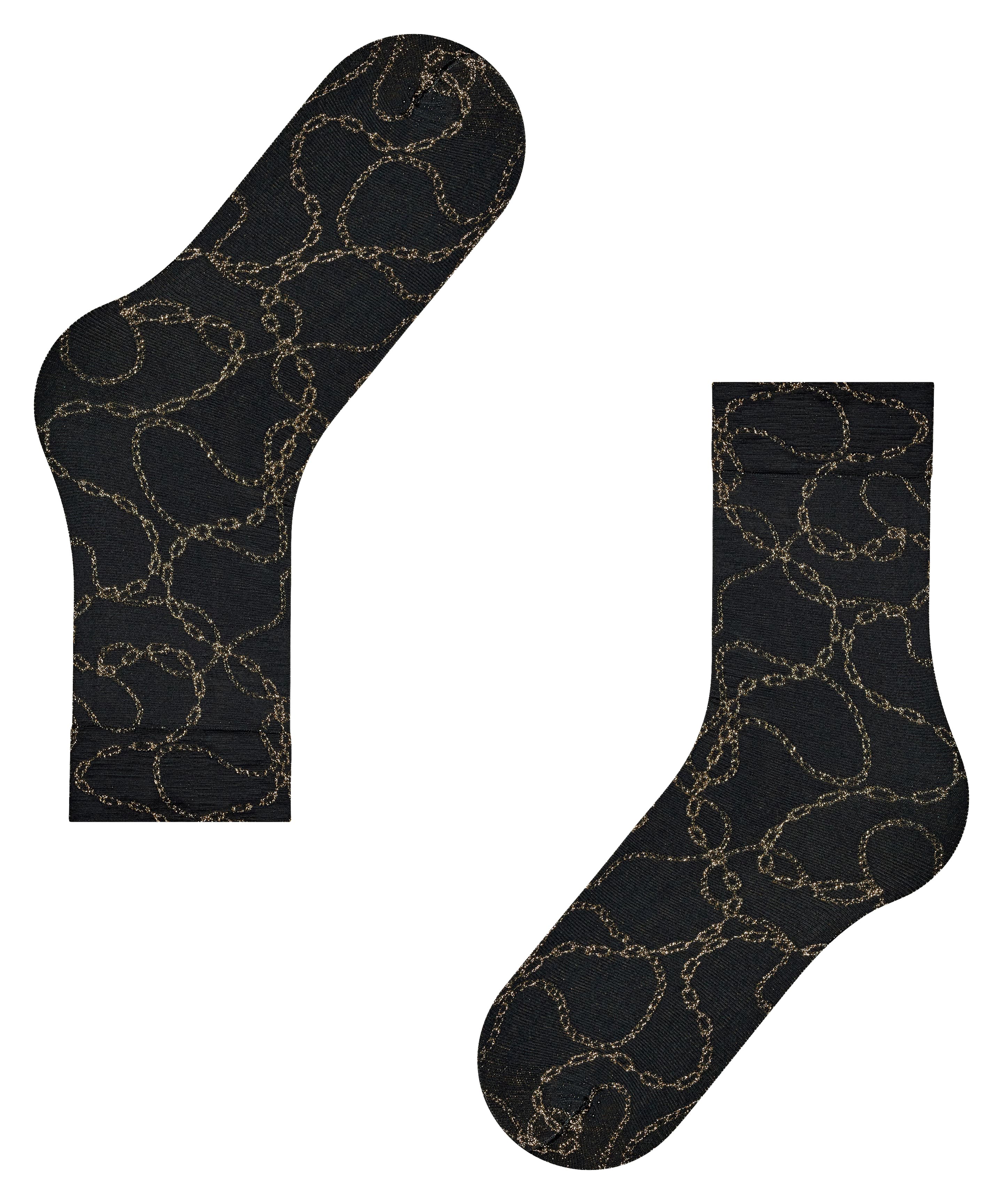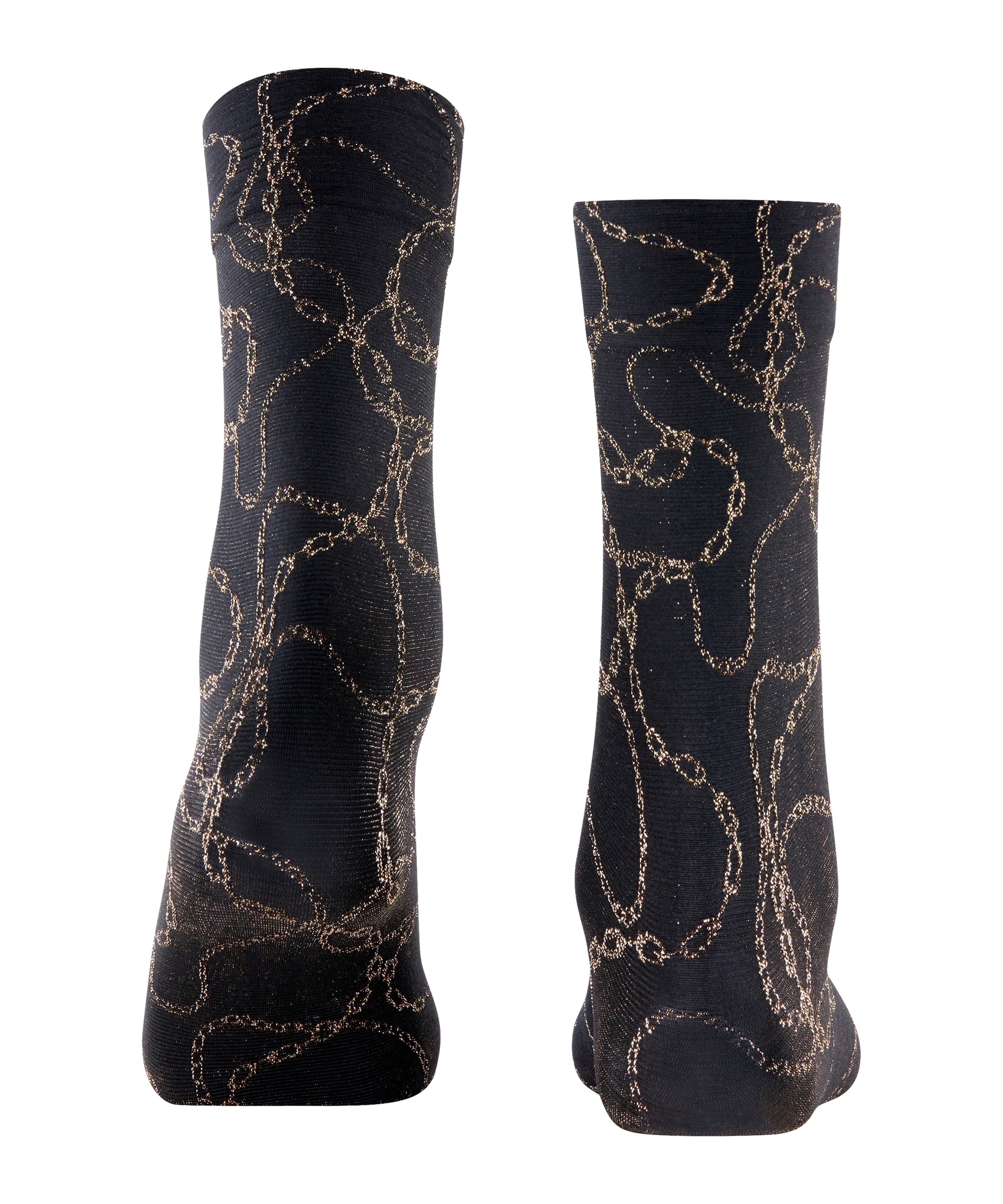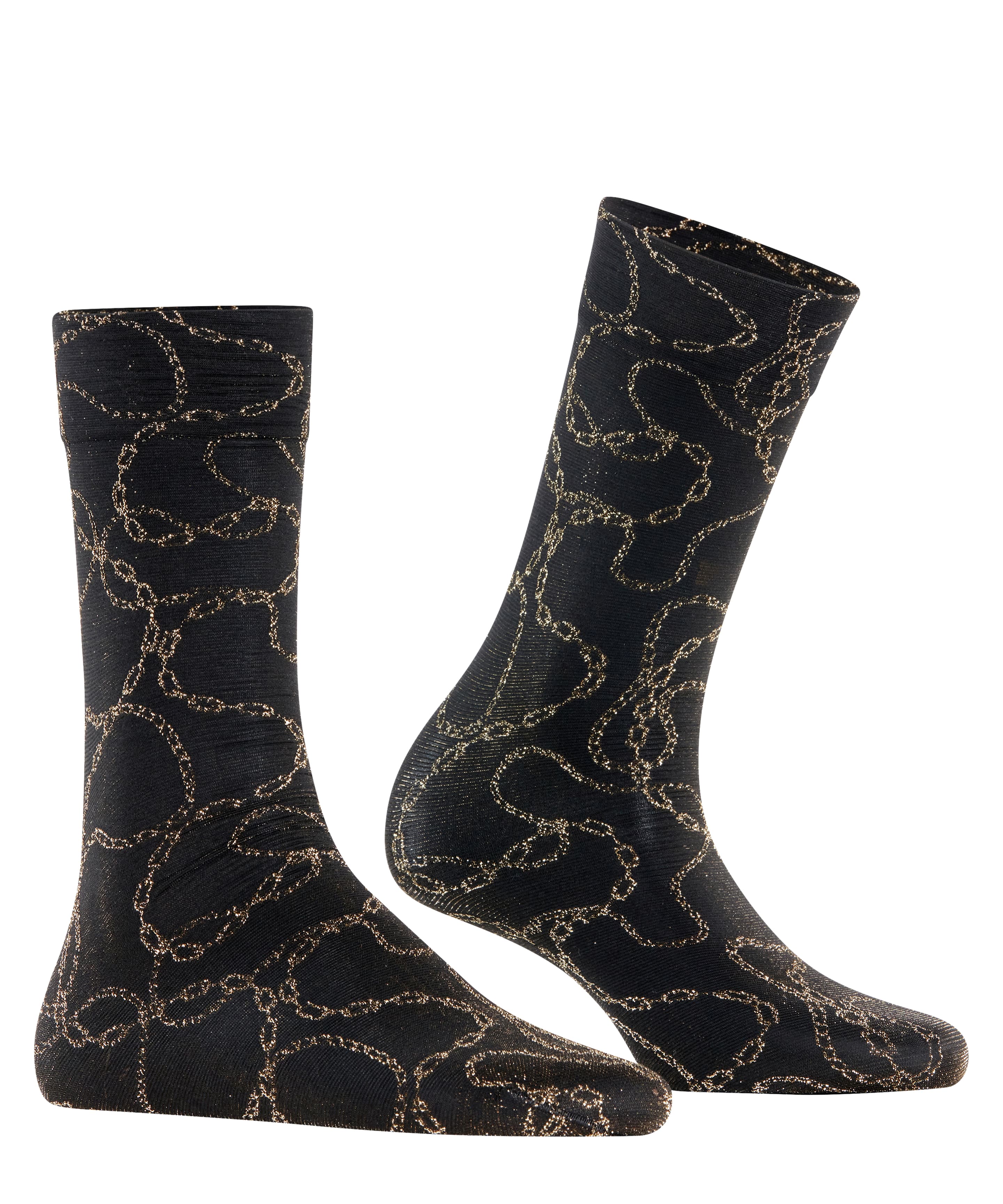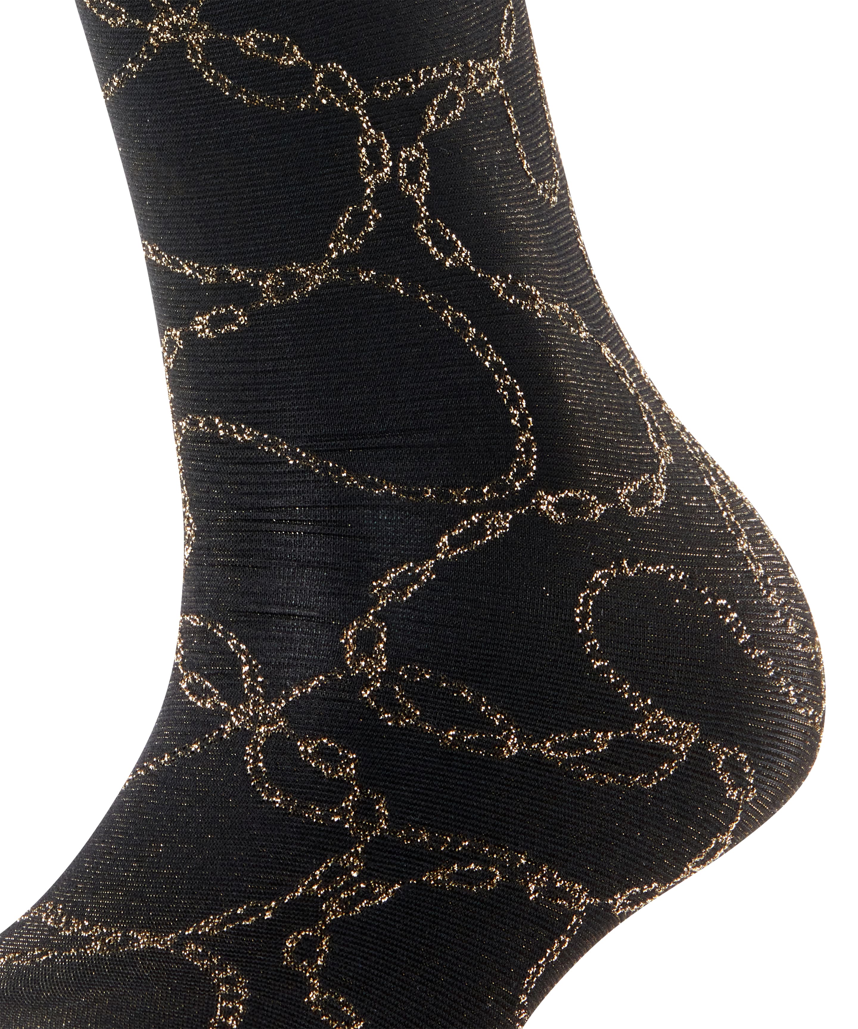 Dieses besonders elegante Feinsöckchen überzeugt mit einem Allover-Design von klassischen Goldketten. Das Motiv erinnert an eine reich gefüllte Schmuckschatulle. Die feminine Optik mit Lurex-Akzenten zusammen mit der perfekten FALKE-Passform machen den Strumpf zu einem modischen Must-Have.
