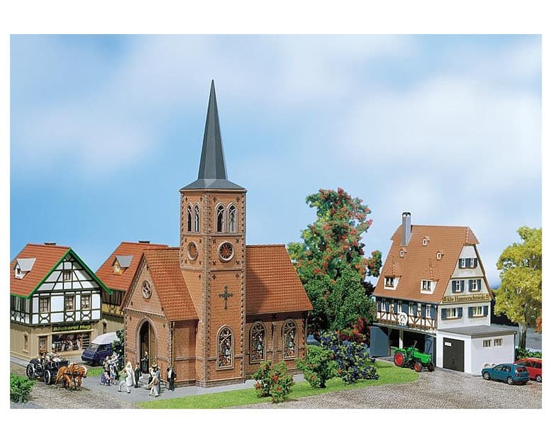 In 2-farbiger Klinkerbauweise, bunten Kirchenfenstern, schmaler Spitzhaube, großem Steinrelief an der Rückseite und diversen Ätzteilen zur Ausschmückung. Eine typische nordische Bauweise.Dieser Bausatz enthält: 50 Einzelteile in 5 Farben, Fensterfolie, 1 Gardinenmaske und 1 Bauanleitung.Verwenden Sie zum Basteln FALLER - Plastikkleber.