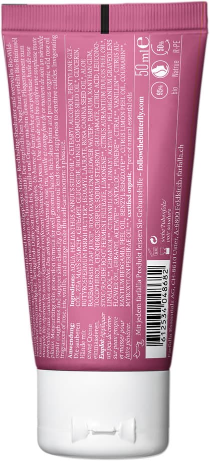 Die Hippie Rose Happiness Handcreme von FARFALLA ist eine wohltuende Pflege für die Hände, die ein angenehmes Hautgefühl hinterlässt.