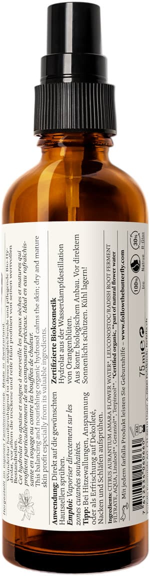 | Inhaltsstoffe | CITRUS AURANTIUM AMARA FLOWER WATER*, LEUCONOSTOC/RADISH ROOT FERMENT FILTRATE, AQUA, LINALOOL**, GERANIOL**. *certified organic/**part of natural flower water. |