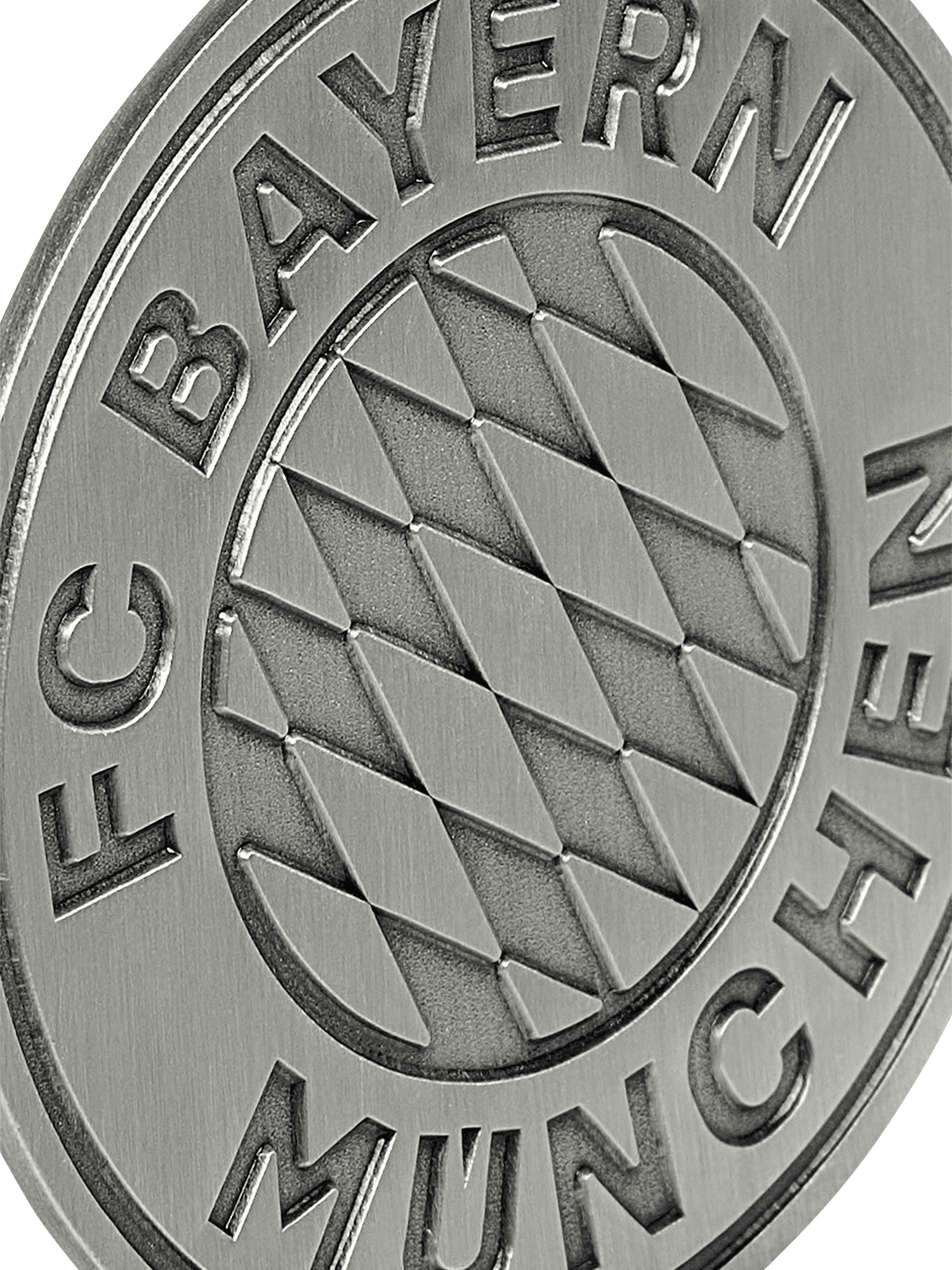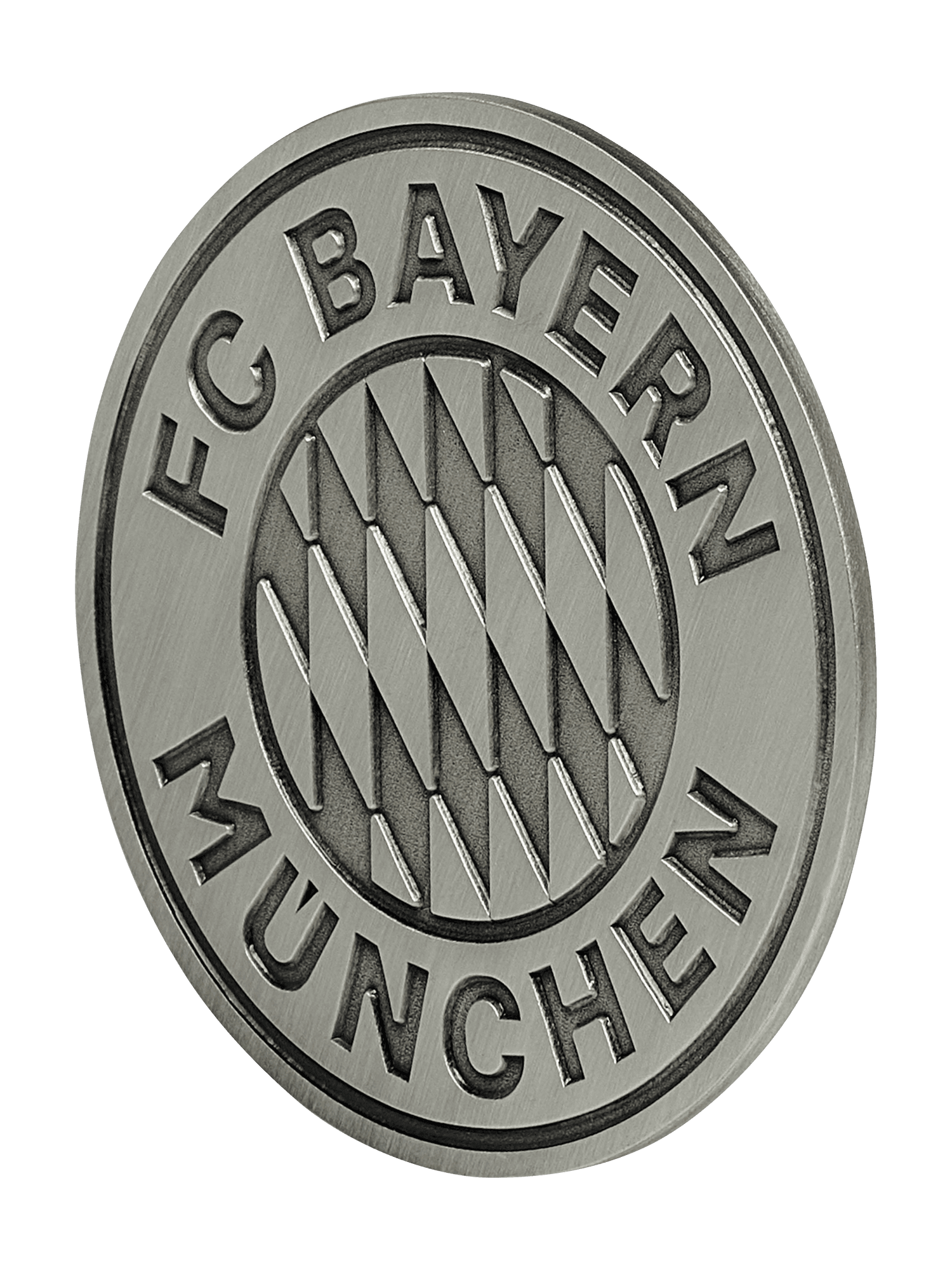 Silberfarbener Magnet mit dem FC Bayern Logo.