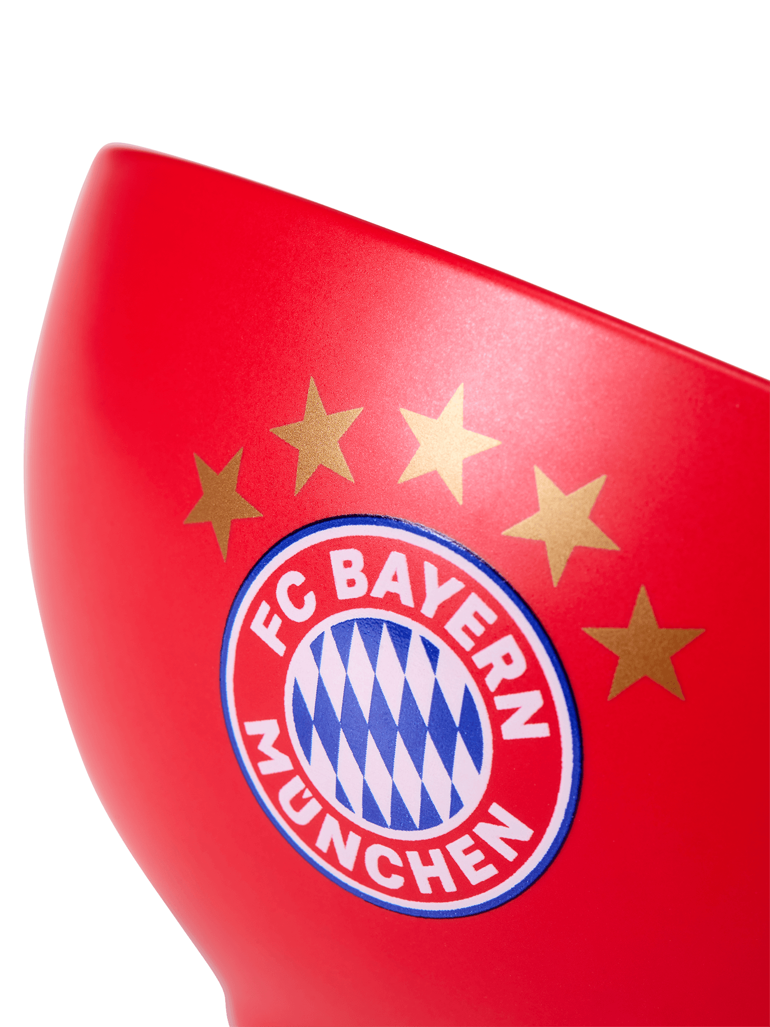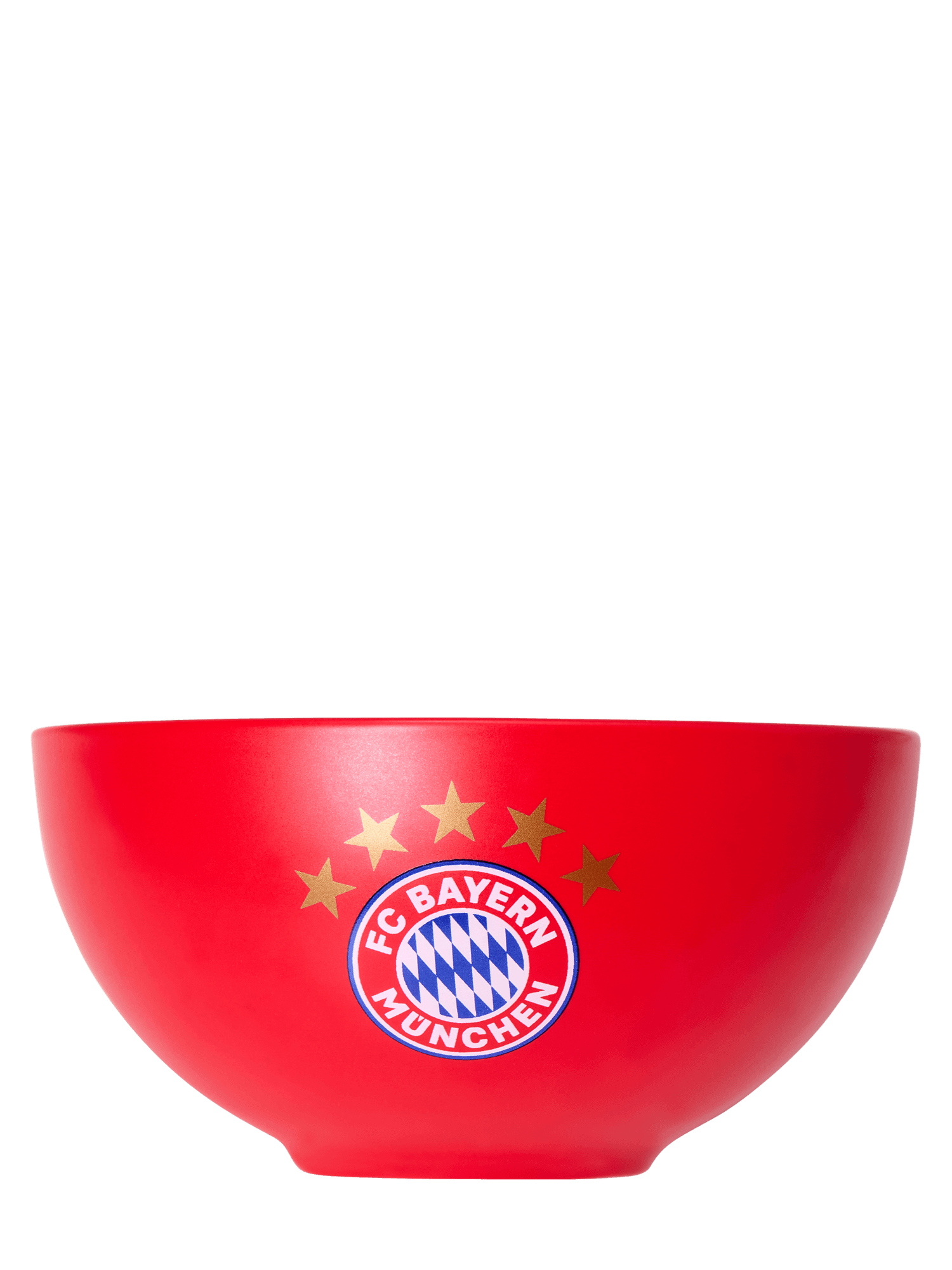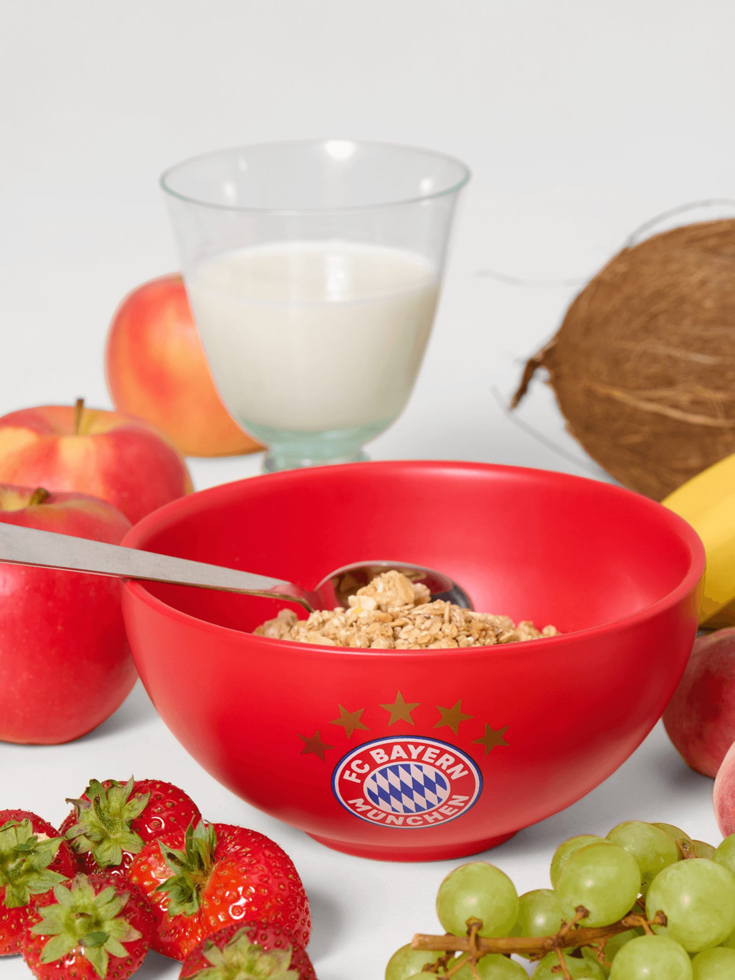 Rote Müslischüssel aus Keramik mit FC Bayern München Logo.