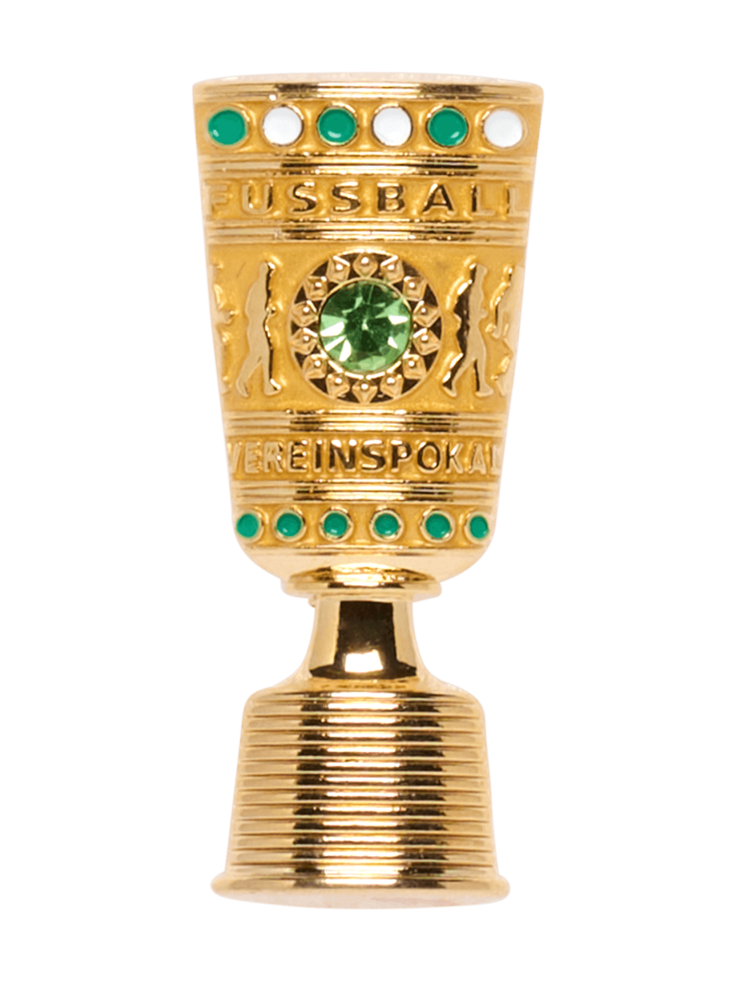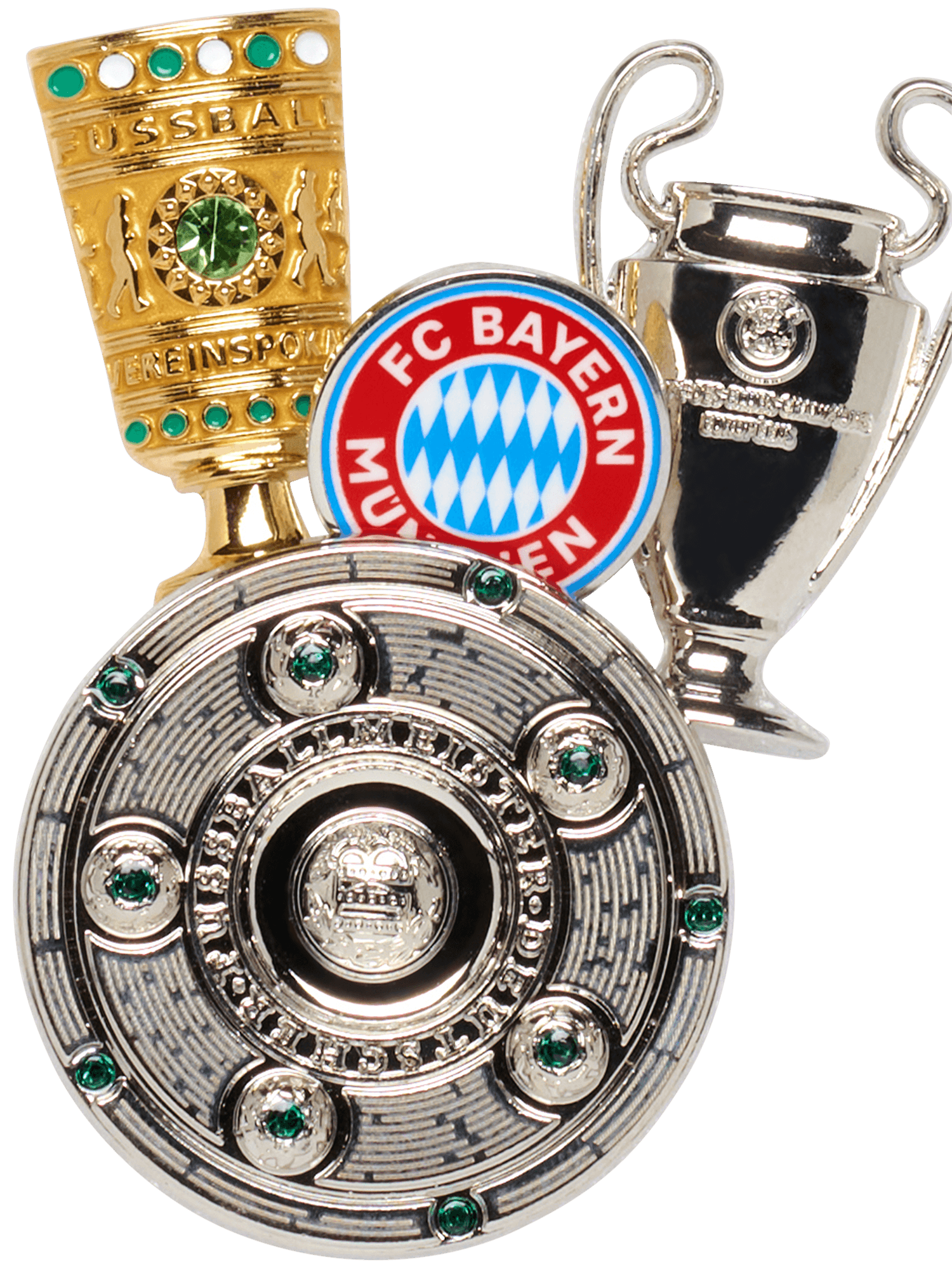 Pin Erfolge 4er-Set, bestehend aus Meisterschale, DFB Pokal, UCL Pokal und FC Bayern Logo.