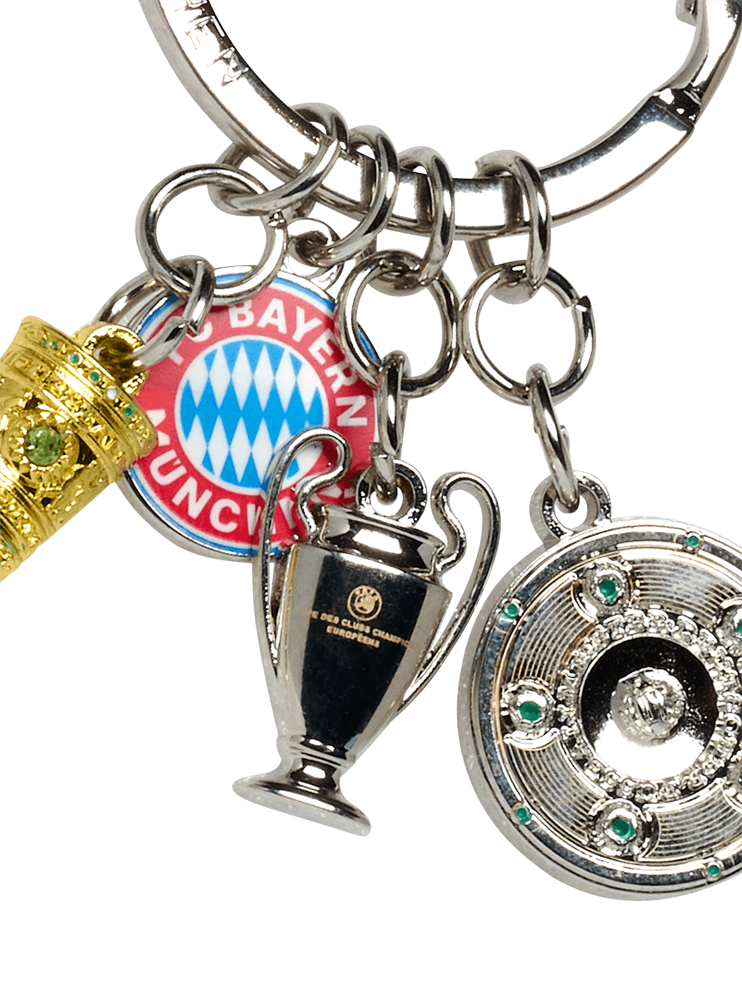 Schlüsselanhänger mit Meisterschale, CL-Pokal und DFB-Pokal.