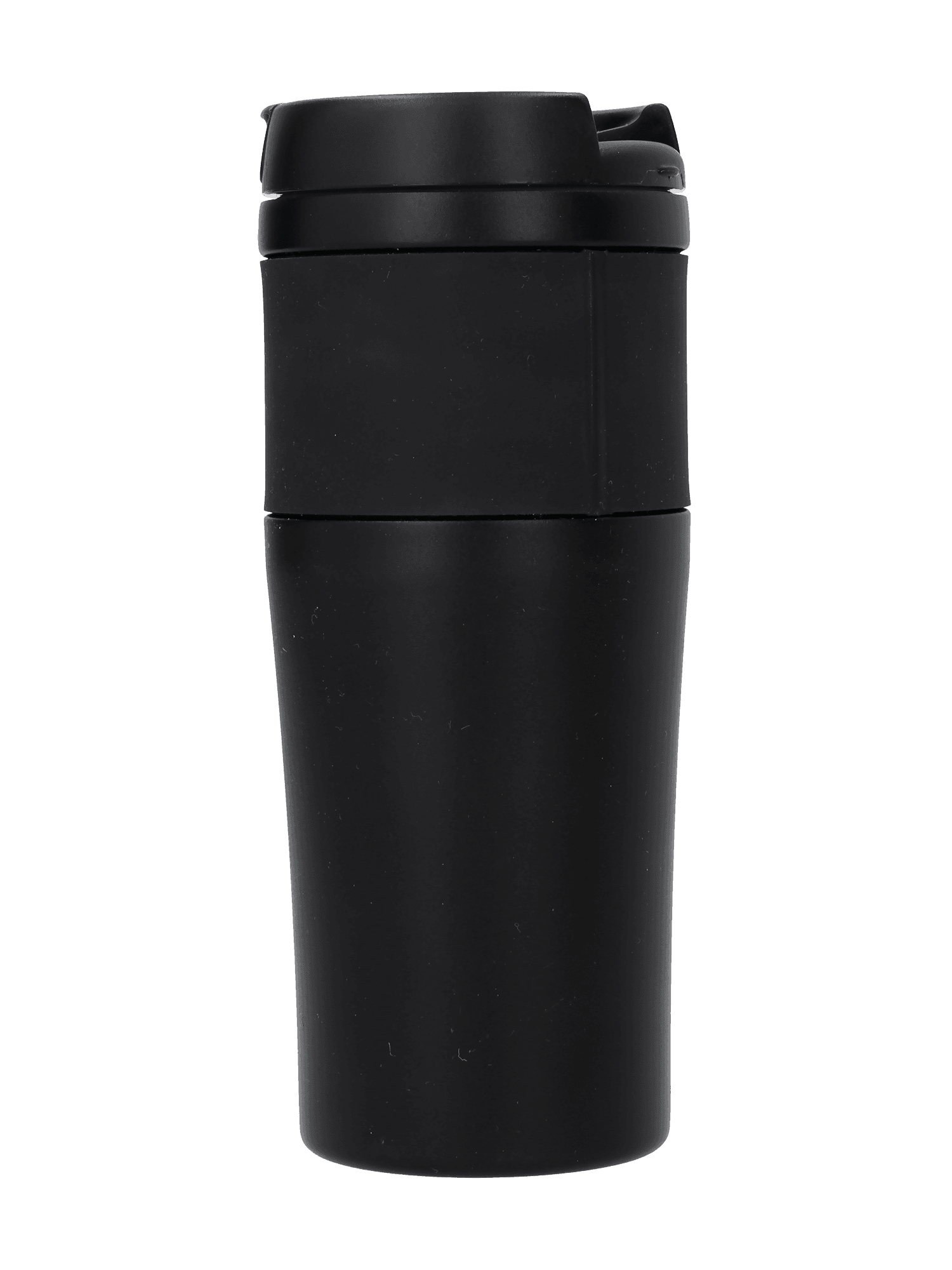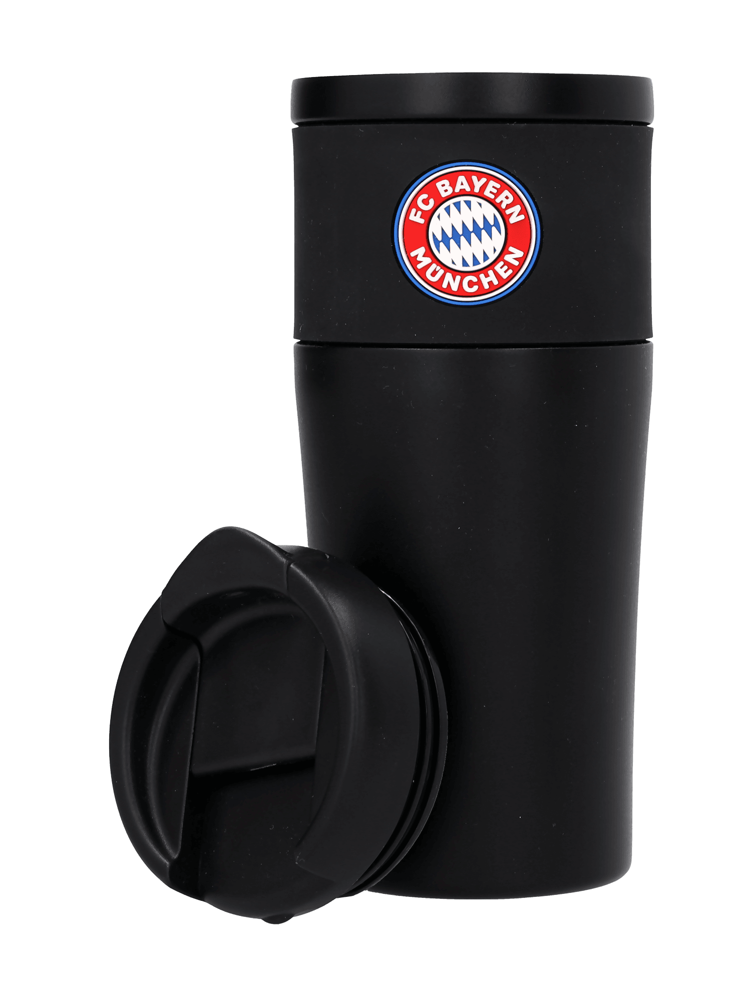 Schwarzer Thermobecher aus Edelstahl mit FC Bayern München Logo.