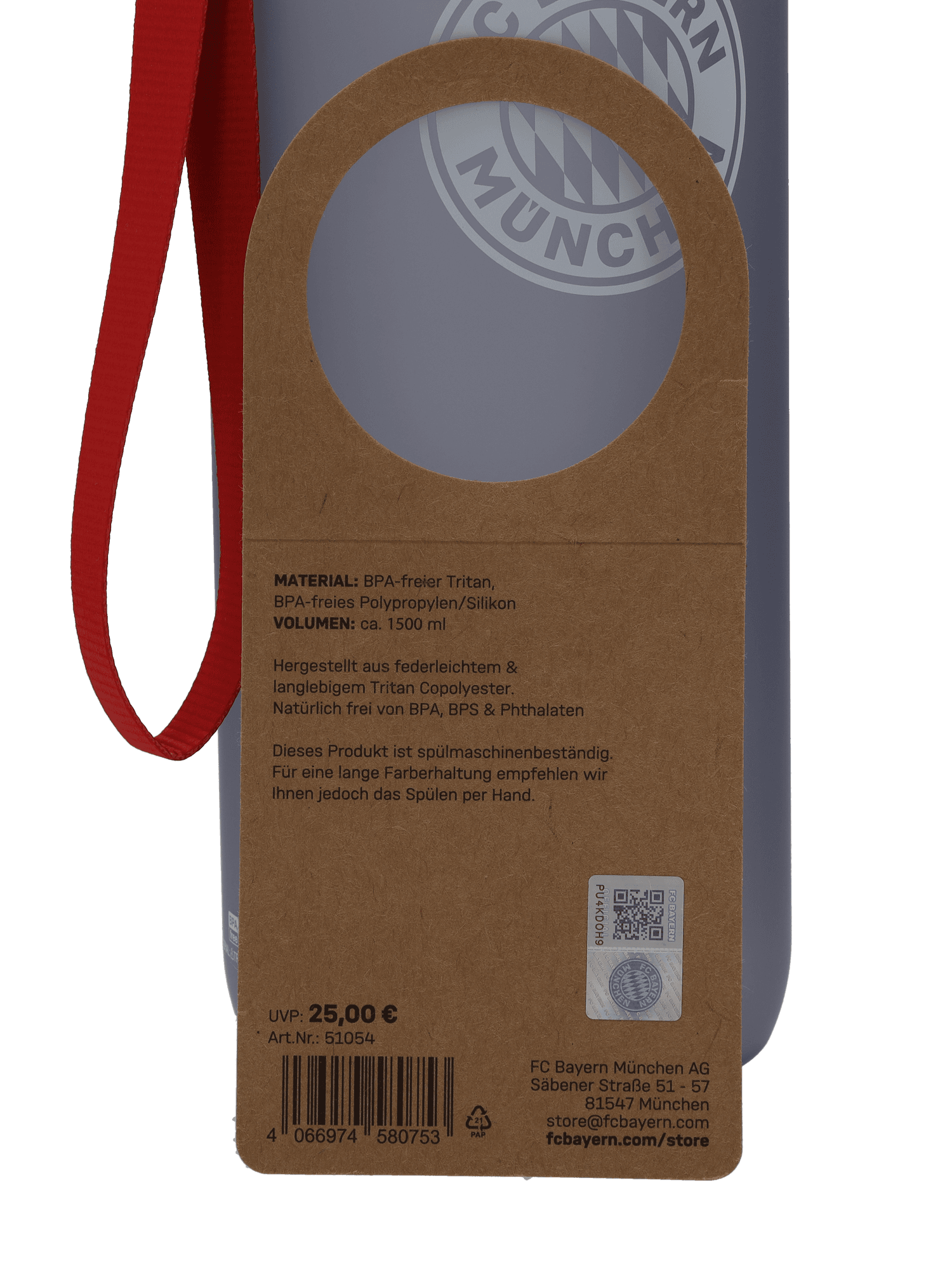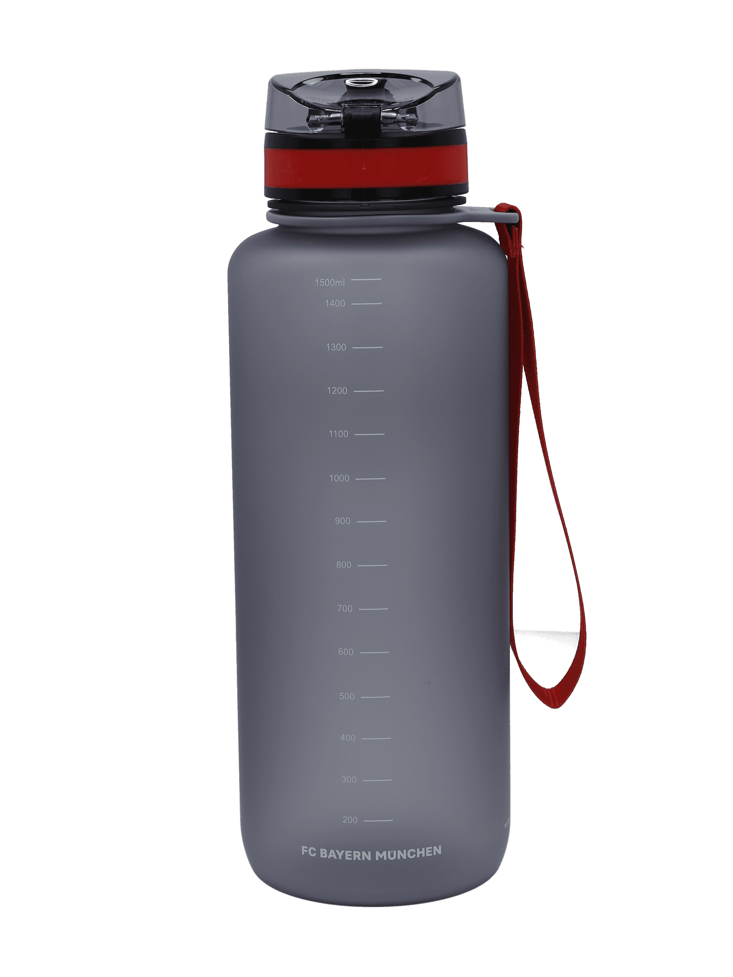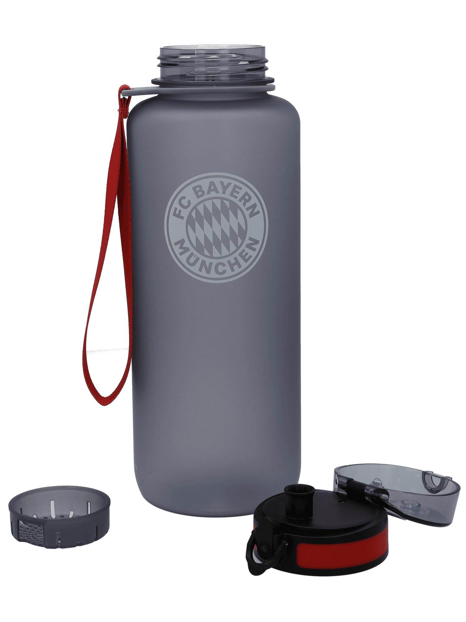 Graue Trinkflasche aus Polypropylen und Tritan, mit weißem FC Bayern München Logo.