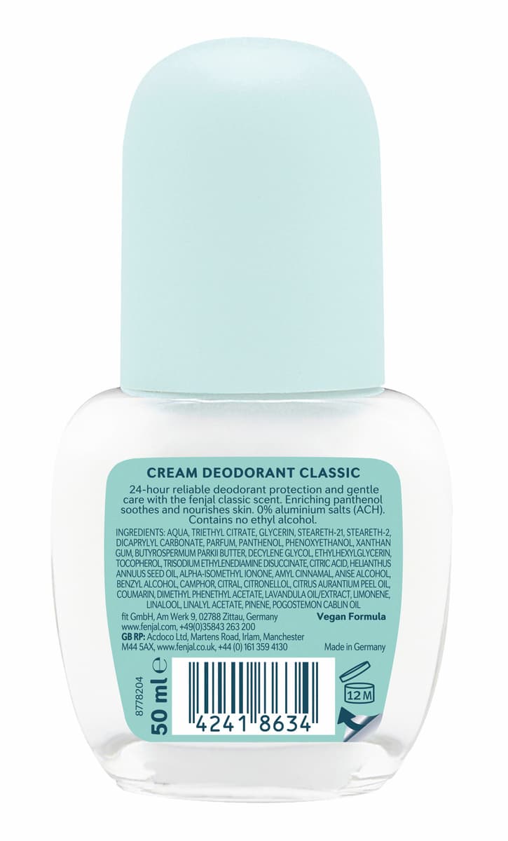 Cream Deodorant Classic. 24h zuverlässiger Schutz, sanfte Pflege, klassischer Fenjal-Duft, 0% Aluminiumsalze, ohne Alkohol.