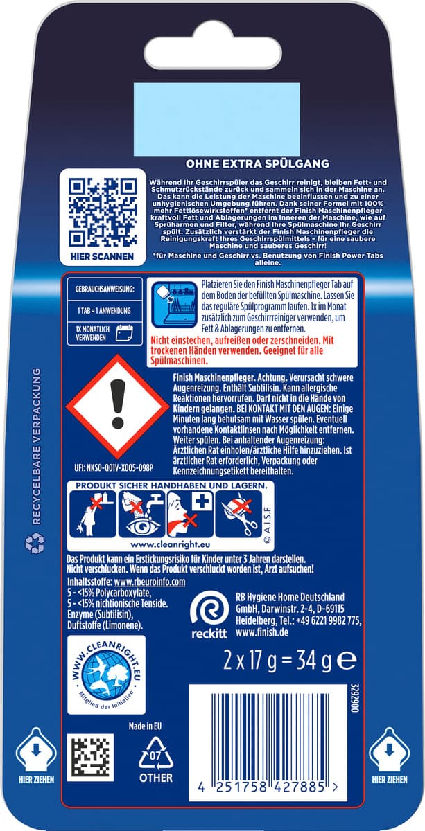 | Anwendungshinweis | Platzieren Sie den Finish Maschinenpfleger Tab auf dem Boden der befüllten Spülmaschine. Lassen Sie das reguläre Spülprogramm laufen. 1x im Monat zusätzlich zum Geschirrreiniger verwenden, um Fett & Ablagerungen zu entfernen. Nicht einstechen, aufreißen oder zerschneiden. Nur mit trockenen Händen verwenden. |