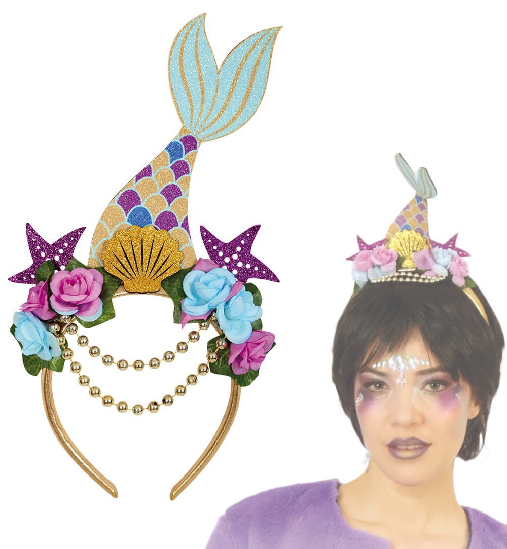 Ein schicker Haarschmuck für alle Meerjungfrauen ist dieser Haarreif. Er zaubert reichlich Glitzer und Glamour ins Haar mit goldenen Perlen, bunten Blüten und glitzernden Meeresfrüchten. Damit können sich Nixen auf Landgang wirklich sehen lassen!