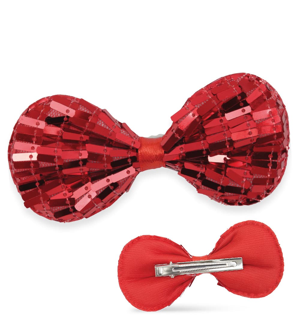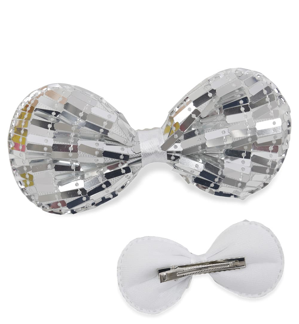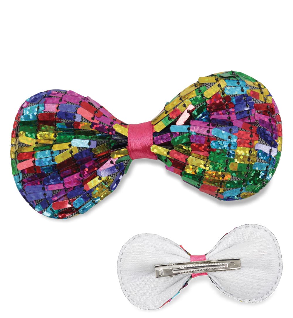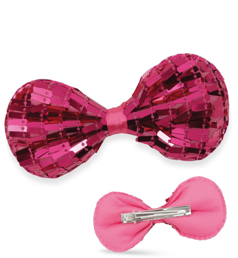 Glitzer, Glanz und Glamour bietet diese tolle Schleife aus Paillettenstoff! In Silber, Rot, Pink oder gleich Multicolour, jede Variante ist ein effektvoller Hingucker. Mit der Spange an der Rückseite kann die Schleife perfekt im Haar, aber auch an der Kleidung, an Taschen oder ähnlichem festgeklemmt werden.