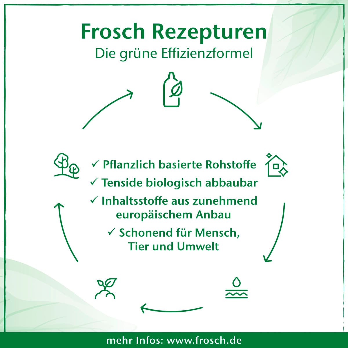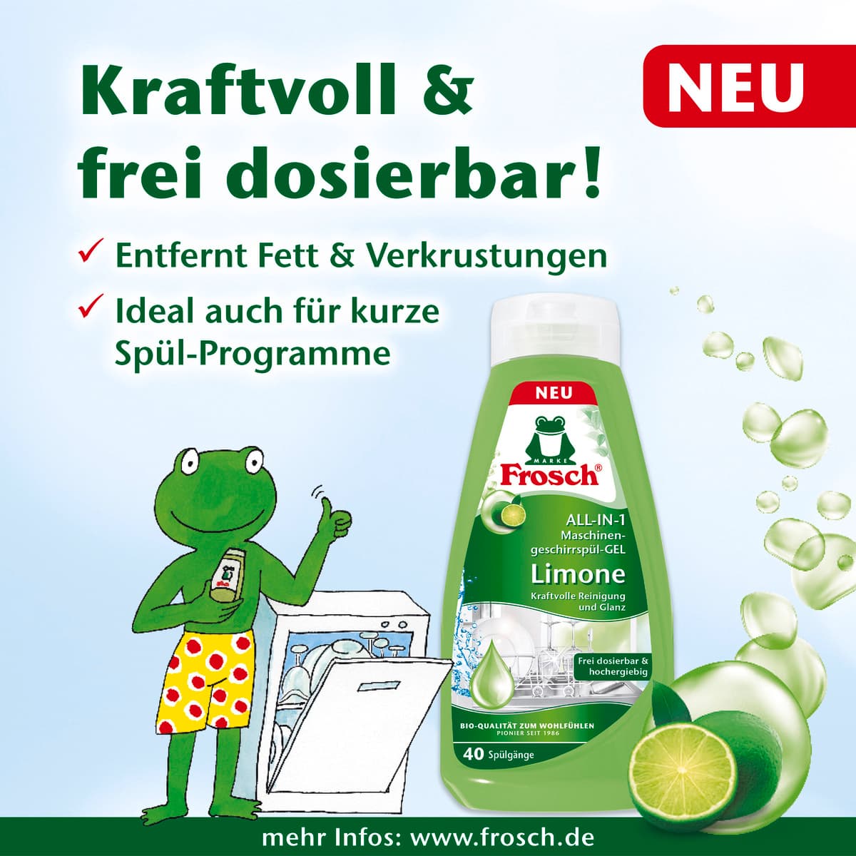 Das Frosch Limonen Geschirrspül-Gel reinigen Geschirr, Töpfe und Pfannen strahlend sauber. Die kraftvolle Rezeptur mit Limonenauszügen entfernt Fett, Tee- oder Kaffeeflecken und hartnäckige Verkrustungen und hinterlässt einen angenehm frischen Limonenduft. Die Rezeptur mit der All-in-One-Funktion vereint: REINIGUNG: kraftvolle Reinigung von Fett, Eingebranntem und eingetrockneten Speiseresten. Auch für Babyfläschchen geeignet. KLARSPÜLER: strahlender Glanz für Geschirr und Gläser ohne Wasserflecken. SALZFUNKTION: verhindert zuverlässig Kalkablagerungen. Die Tabs sind sofort aktiv und wirken auch bei niedrigen Temperaturen.