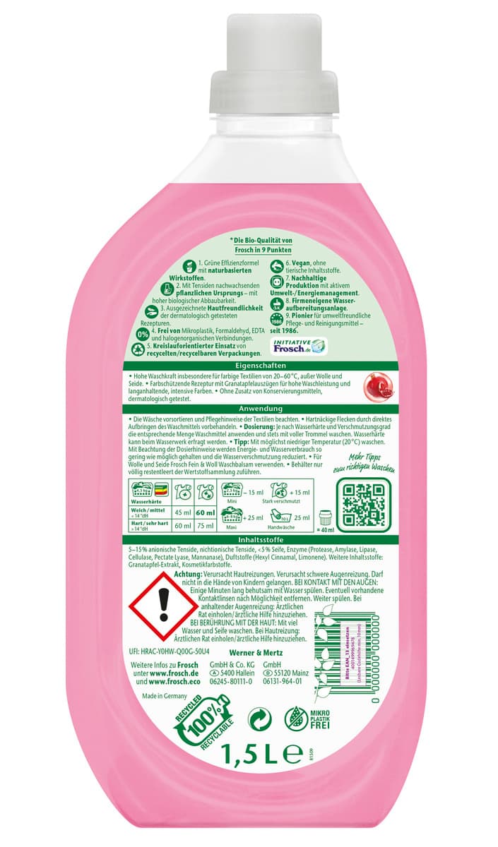 Das Frosch Granatapfel Bunt-Waschmittel eignet sich für alle Textilien, außer Wolle und Seide. Die Rezeptur mit Granatapfelauszügen pflegt die Textilfasern und sorgt bei Temperaturen von 20° bis 60° C für weiche, strahlend reine und angenehm duftende Wäsche. Der spezielle Langzeit-Farbschutz schützt farbige Textilien vor Verblassen und Verfärbung. Das dermatologisch bestätigte Waschmittel ist frei von Farbstoffen und Konservierungsmitteln. Beutel zu 100% recycelbar. Reicht für 25 Waschladungen.