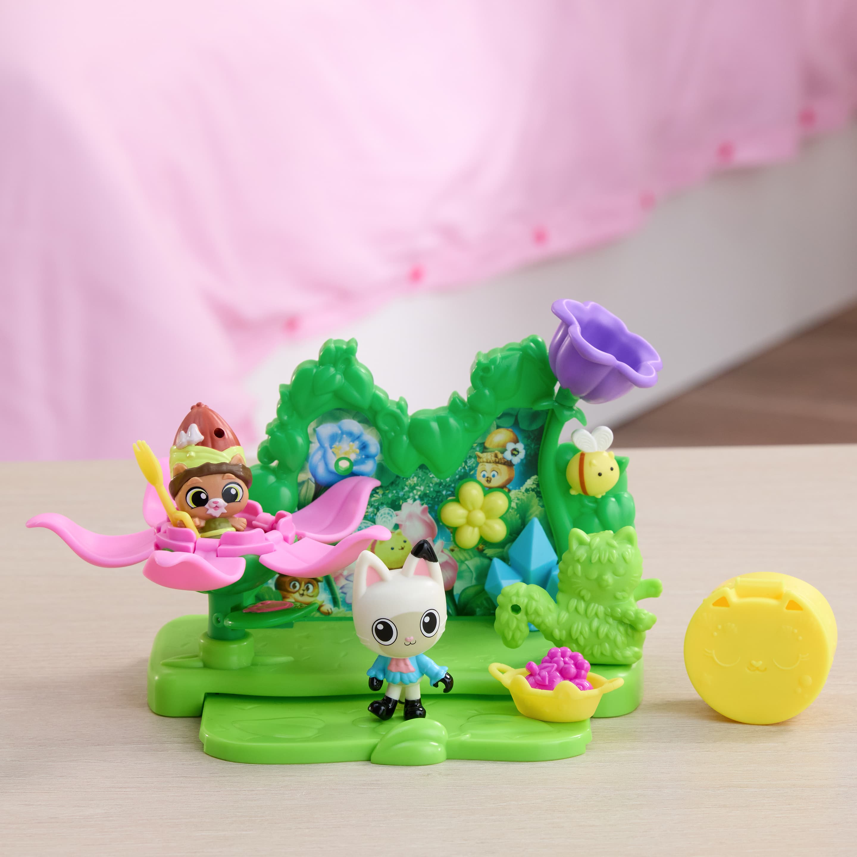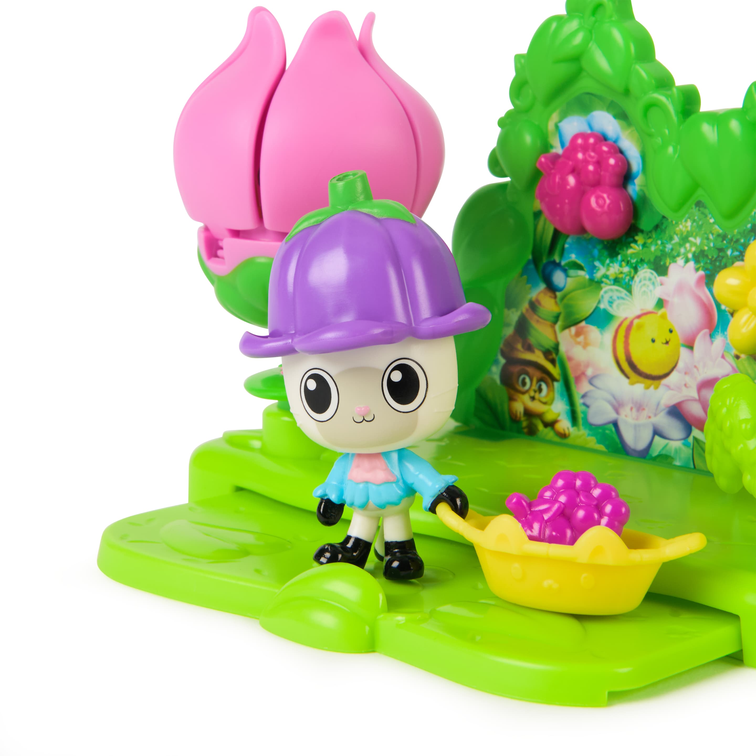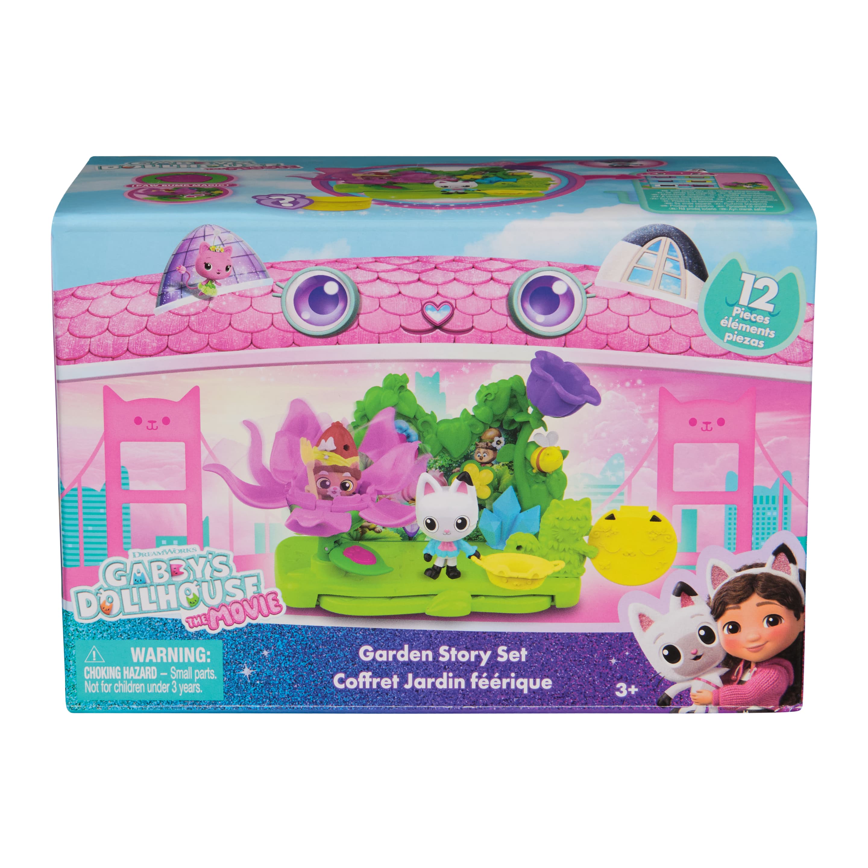 Willkommen im katz-tastischen Garten von Gabby’s Dollhouse: Der Film! Mit dem liebevoll gestalteten Garten Story Set erleben kleine Fans zauberhafte Abenteuer im Grünen. Das 12-teilige Spielset steckt voller liebevoller Details und Spielmöglichkeiten: Die große Blume öffnet sich auf Knopfdruck dank Paw Bump Magic, und die ausziehbare Plattform lädt zum Picknick mit Panda Pfötchen (EN: Pandy Paws) ein. Besonders süß: Pandys abnehmbarer Blumenhut sowie Zubehör wie eine summende Kitty-Biene und leckere Beeren! Kinder können wie Gabby in der Serie eine Dollhouse Delivery auspacken und eine Überraschung entdecken – mit QR-Code für ein digitales Extra in der kostenlosen Gabby’s Dollhouse App (für iOS & Android). Dieses Set fördert kreatives Rollenspiel und entführt Kinder ab 3 Jahren in fantasievolle Gartenabenteuer mit ihren liebsten Gabby-Charakteren. Perfekt zum Kombinieren mit weiteren Spielsets, Figuren und Zubehör aus der miau-tastischen Welt von Gabby’s Dollhouse!