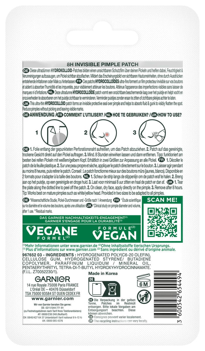 Anwendungshinweis1. Das Gesicht gründlich reinigen und sanft abtrocknen. 2. Die Folie entlang der Perforationsnaht aufreißen und ein Pickel Patch von der Folie abziehen. 3. Pimple Patch auf das gereinigte, trockene Gesicht auf den Pickel auftragen. 4. Mindestens 8H einwirken lassen und dann entfernen. 5. Tipp: Besonders gut funktionieren die Garnier Pickel Patches bei reifen Pickeln mit gelben/weißen Kopf.