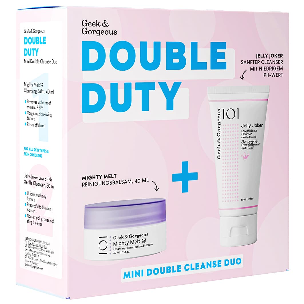 Das Geek & Gorgeous Double Duty Duo ist das perfekte Set für eine gründliche, aber sanfte Reinigung – auch unterwegs! Es kombiniert die Mini-Versionen des beliebten Jelly Joker und des Mighty Melt und bietet so eine mühelose Double-Cleansing-Routine, die sich für alle Hauttypen eignet. Die Formulierungen reinigen die Haut porentief, ohne sie auszutrocknen, entfernen Make-up und überschüssigen Talg effektiv und hinterlassen ein frisches, gepflegtes Hautgefühl.
