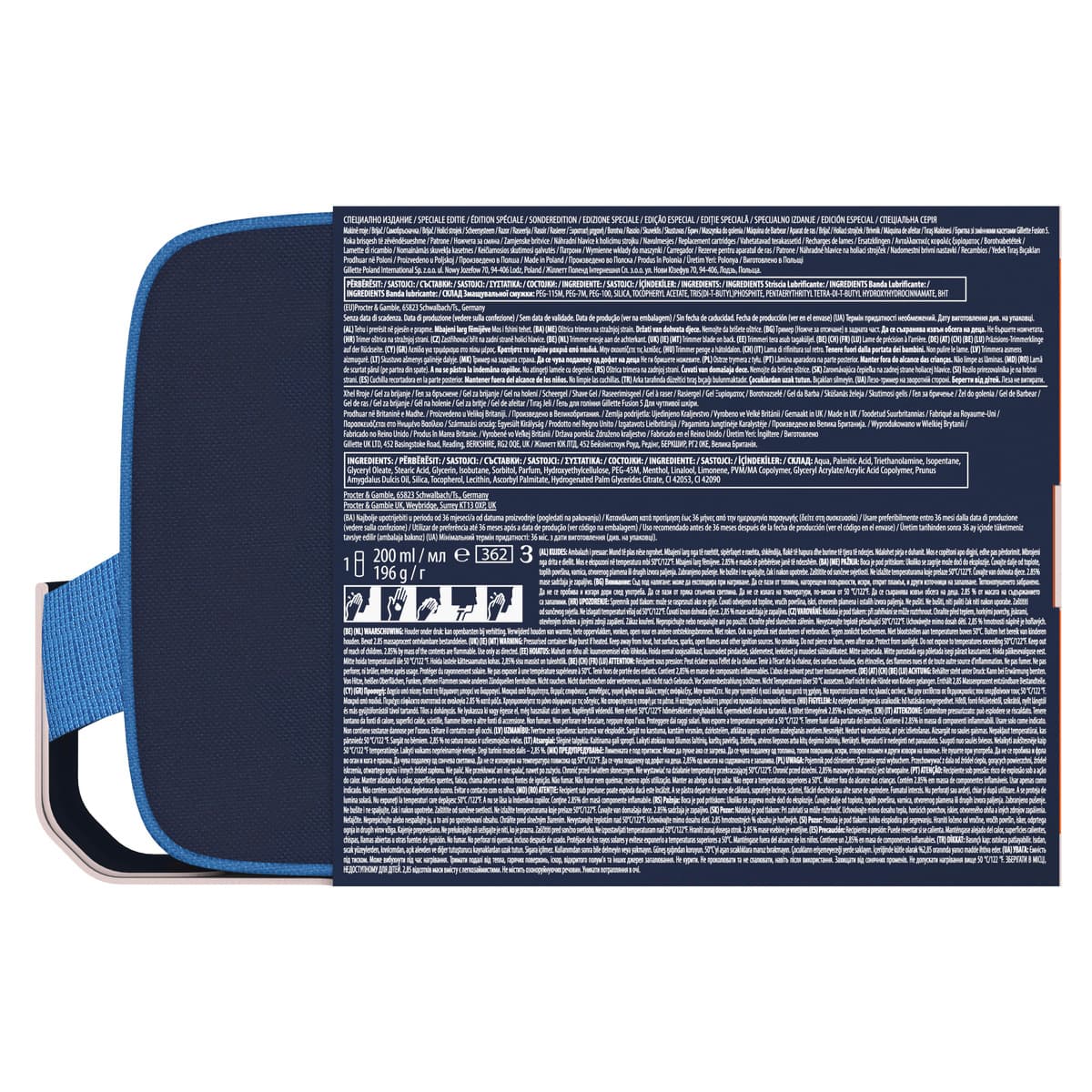 | Inhaltsstoffe | Rasierer: PEG-115M, PEG-7M, PEG-100, Silica, Tocopheryl Acetate, Tris(Di-T-Butyl)Phosphite, Pentaerythrityl Tetra-Di-T-Butyl Hydroxyhydrocinnamate, BHT, Rasiergel: Aqua, Palmitic Acid, Triethanolamine, Isopentane, Glyceryl Oleate, Stearic Acid, Glycerin, Isobutane, Sorbitol, Parfum, Hydroxyethylcellulose, PEG-45M, Menthol, Linalool, Limonene, PVM/MA Copolymer, Glyceryl Acrylate/Acrylic Acid Copolymer, Prunus Amygdalus Dulcis Oil, Silica, Tocopherol, Lecithin, Ascorbyl Palmitate, Hydrogenated Palm Glycerides Citrate, CI 42053, CI 42090 |