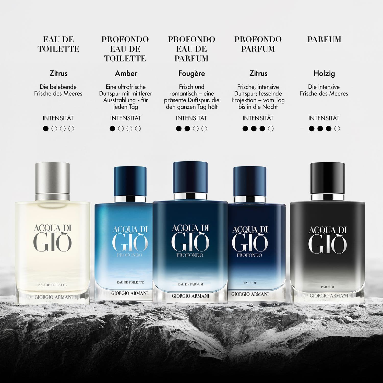 Acqua di Giò Profondo von GIORGIO ARMANI ist ein Eau de Parfum, das die tiefgründige Intensität des Meeres einfängt. Diese Komposition verkörpert eine maskuline Aura und lädt zu einem Sprung in kühles, tiefblaues Wasser ein.