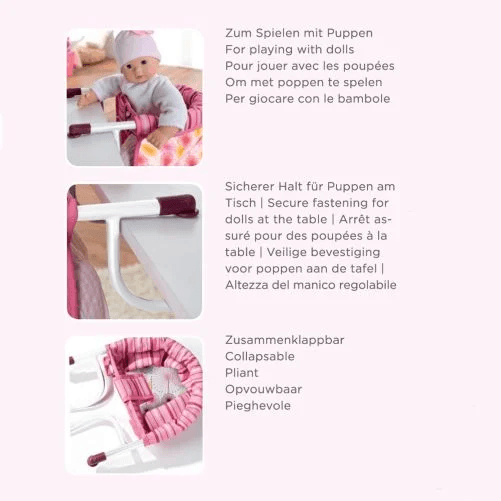 Endlich ist auch für deine Puppe Platz am Tisch. Sie möchte gefüttert werden und dabei sein, wenn die Familie zusammen am Tisch sitzt.Praktischer Tischsitz mit den Maßen 41 × 15 × 20 cmIdeal für Babypuppen bis 48 cm.Die Tischplatte sollte nicht stärker sein als 40 mm