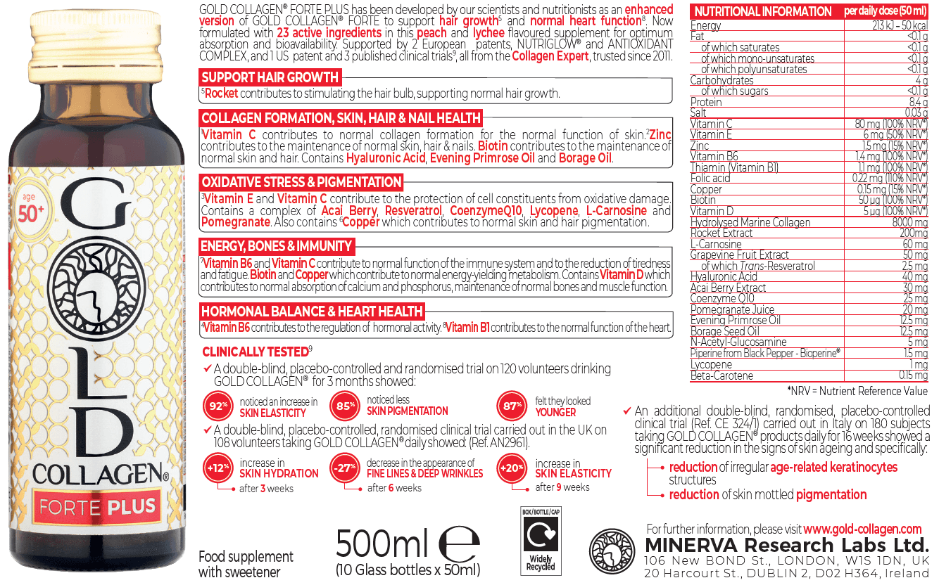 GOLD COLLAGEN® FORTE PLUS ist ein hochwertiges flüssiges Nahrungsergänzungsmittel, das in Japan nach einer patentierten Formel hergestellt wird und sich in drei klinischen Studien bewährt hat. Es wurde speziell für Frauen über 50 entwickelt und zielt auf fortgeschrittene Zeichen der Hautalterung ab. Jede Tagesportion von 50 ml enthält 8.000 mg hydrolysiertes Meereskollagen sowie 22 weitere Wirkstoffe, darunter Hyaluronsäure, Resveratrol, Coenzym Q10, Biotin, essentielle Vitamine, Mineralien und Pflanzenextrakte. Zusammen trägt diese einzigartige Mischung dazu bei, die Feuchtigkeitsversorgung, Festigkeit und Elastizität der Haut zu verbessern, das Auftreten von Falten und Pigmentflecken zu reduzieren und gesundes Haar, gesunde Nägel, den Hormonhaushalt, die Herzgesundheit und den antioxidativen Schutz zu unterstützen – für umfassende Schönheit und Wohlbefinden von innen heraus.