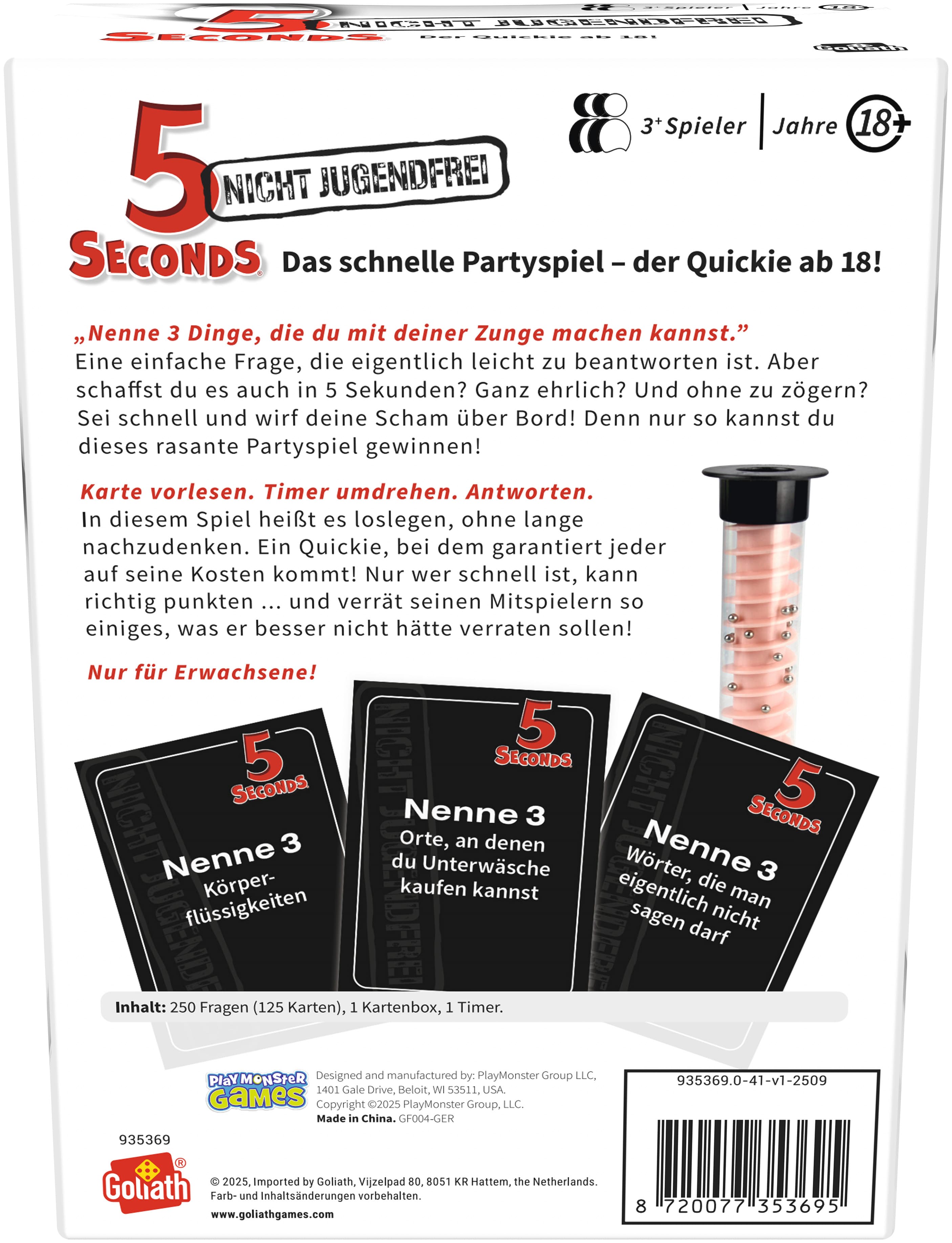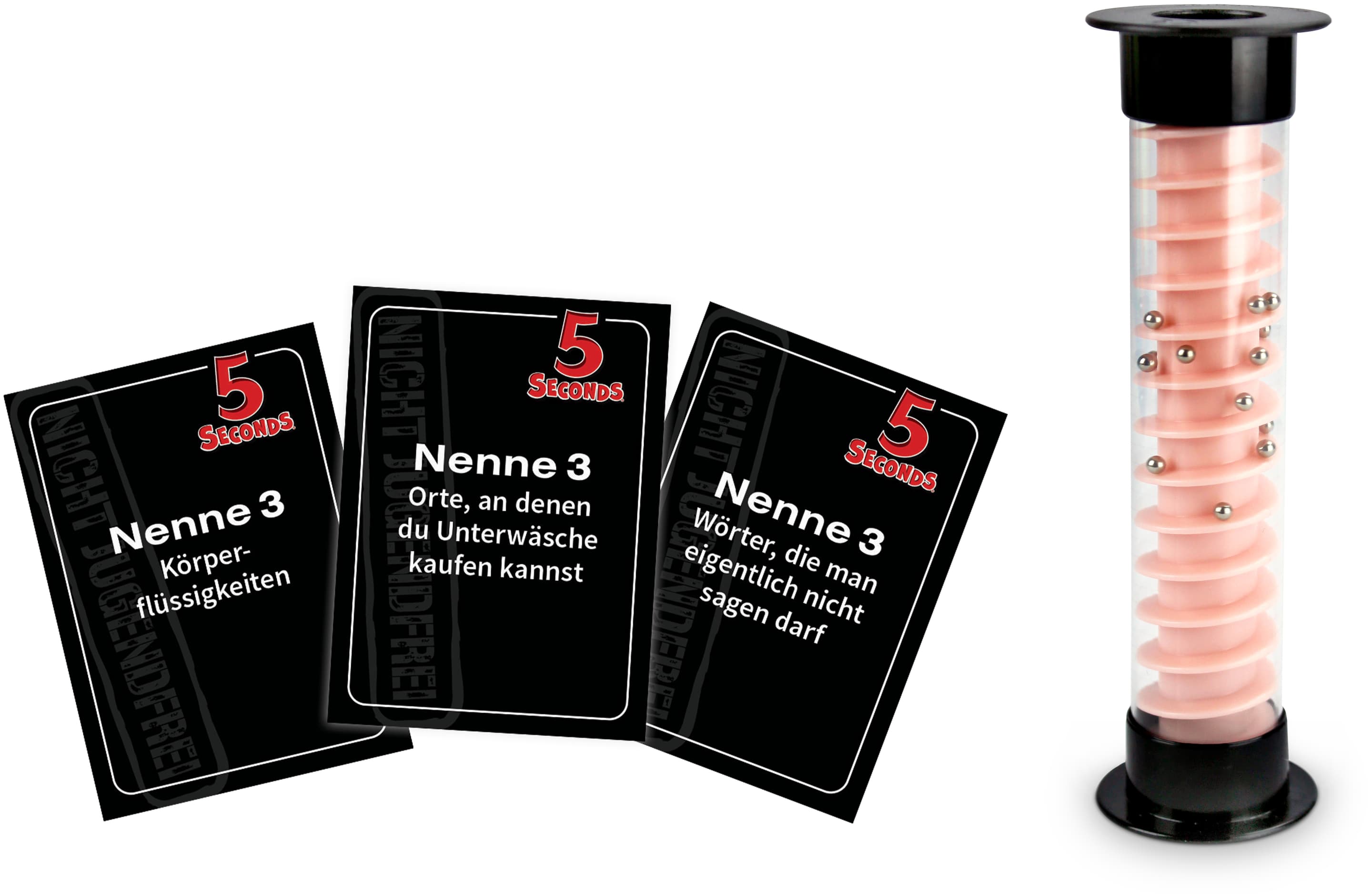 Es klingt so einfach: Nenne drei nächtliche Aktivitäten! Doch in dieser Erwachsenen-Version wird es erst richtig spannend. Kannst du die richtigen Begriffe nennen, ohne dass dir die Zunge stolpert und dein Puls steigt? Alle Augen sind auf dich gerichtet, die Uhr tickt gnadenlos – du hast nur fünf Sekunden, um tief in deinem Gedächtnis zu graben und die Antwort herauszuschießen! Ein rasantes Partyspiel für 3 oder mehr Spieler, bei dem es garantiert heiß hergeht!