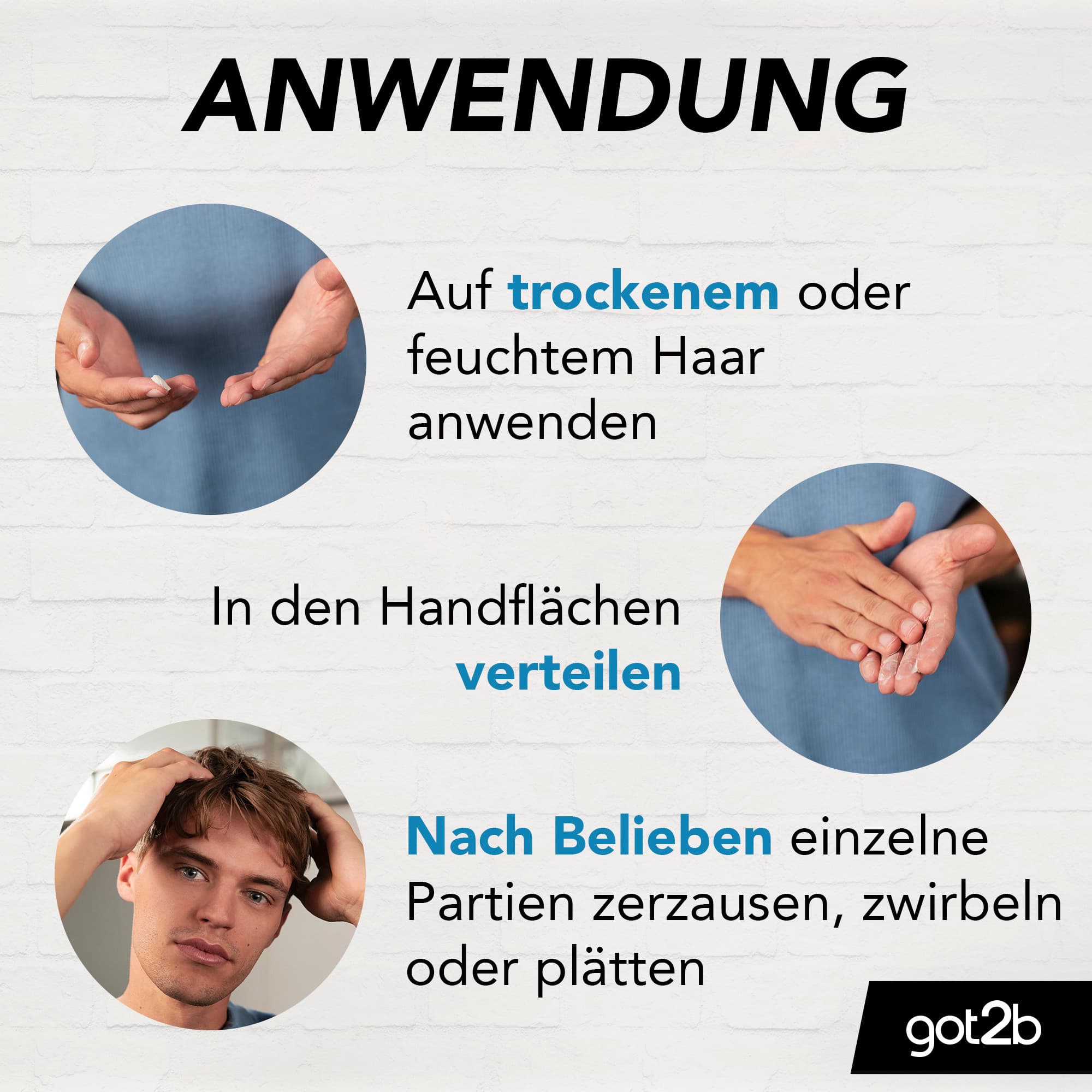 AnwendungshinweisAuf trockenem oder feuchtem Haar. In den Handflächen verteilen und nach Belieben einzelne Partien zerzausen, zwirbeln oder plätten.