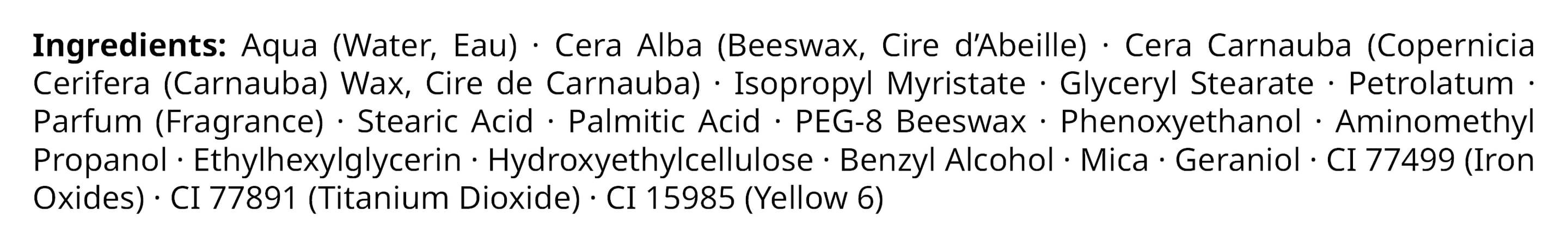 Inhaltsstoffe Aqua (Water, Eau), Cera Alba (Beeswax, Cire d'Abeille), Cera Carnauba (Copernicia Cerifera (Carnauba) Wax, Cire de Carnauba), Isopropyl Myristate, Glyceryl Stearate, Petrolatum, Parfum (Fragrance), Stearic Acid, Palmitic Acid, PEG-8 Beeswax, Phenoxyethanol, Aminomethyl Propanol, Ethylhexylglycerin, Hydroxyethylcellulose, Benzyl Alcohol, Mica, Geraniol, CI 77499 (Iron Oxides), CI 77891 (Titanium Dioxide), CI 15985 (Yellow 6)