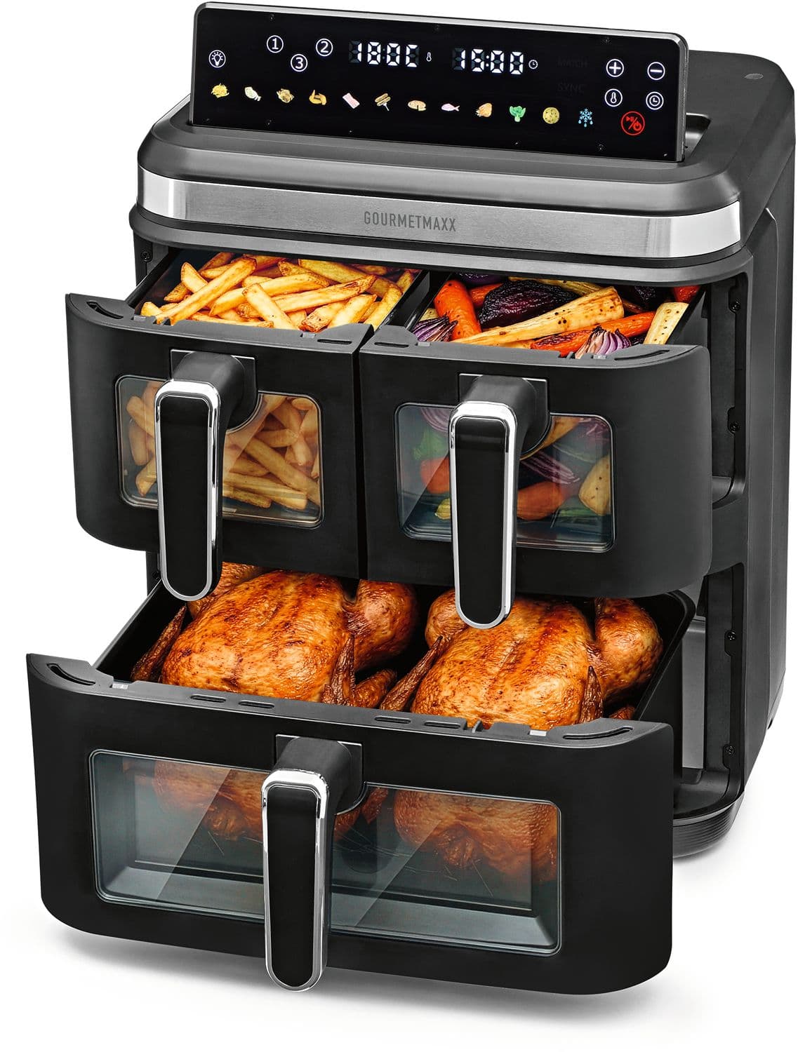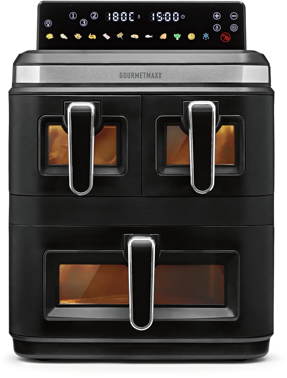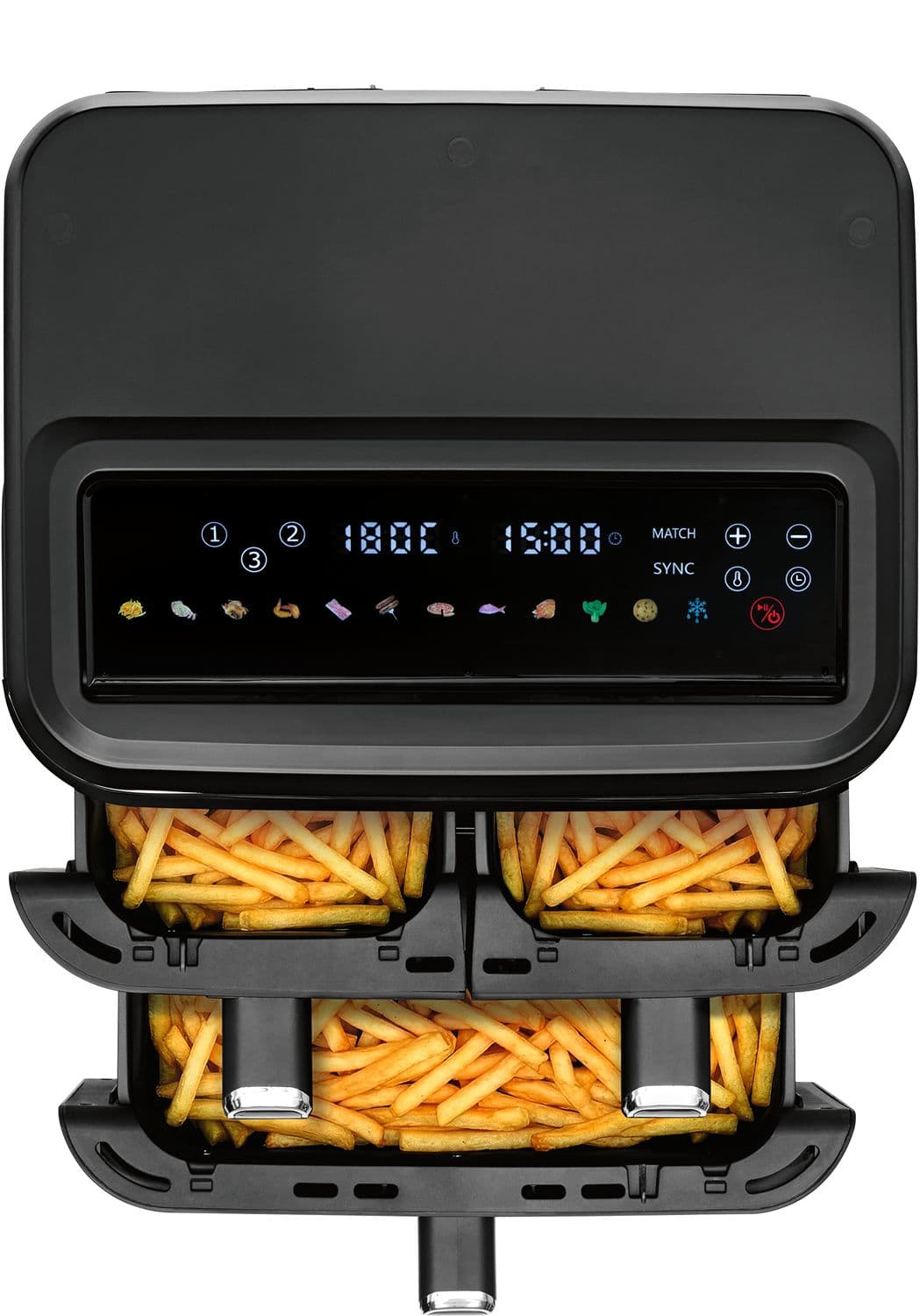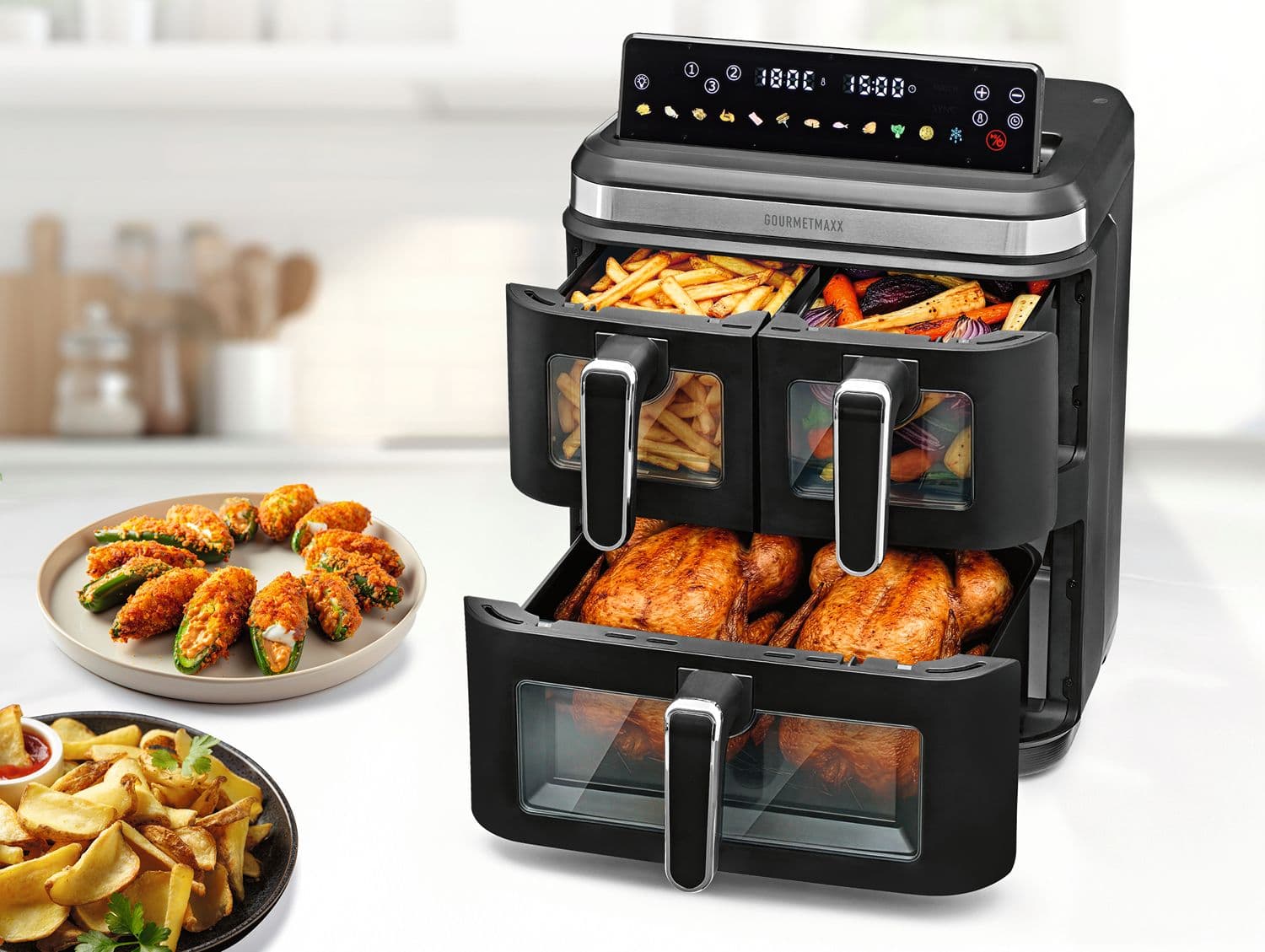 Diese Heißluftfritteuse eignet sich ideal für die Zubereitung verschiedenster Speisen im Alltag. Dank der drei getrennten Kammern können mehrere Gerichte gleichzeitig zubereitet werden, was besonders praktisch im Küchenalltag ist. Das integrierte Sichtfenster ermöglicht es, den Garvorgang jederzeit bequem zu beobachten, ohne das Gerät öffnen zu müssen. Eine praktische Lösung für alle, die flexibel und unkompliziert kochen möchten.