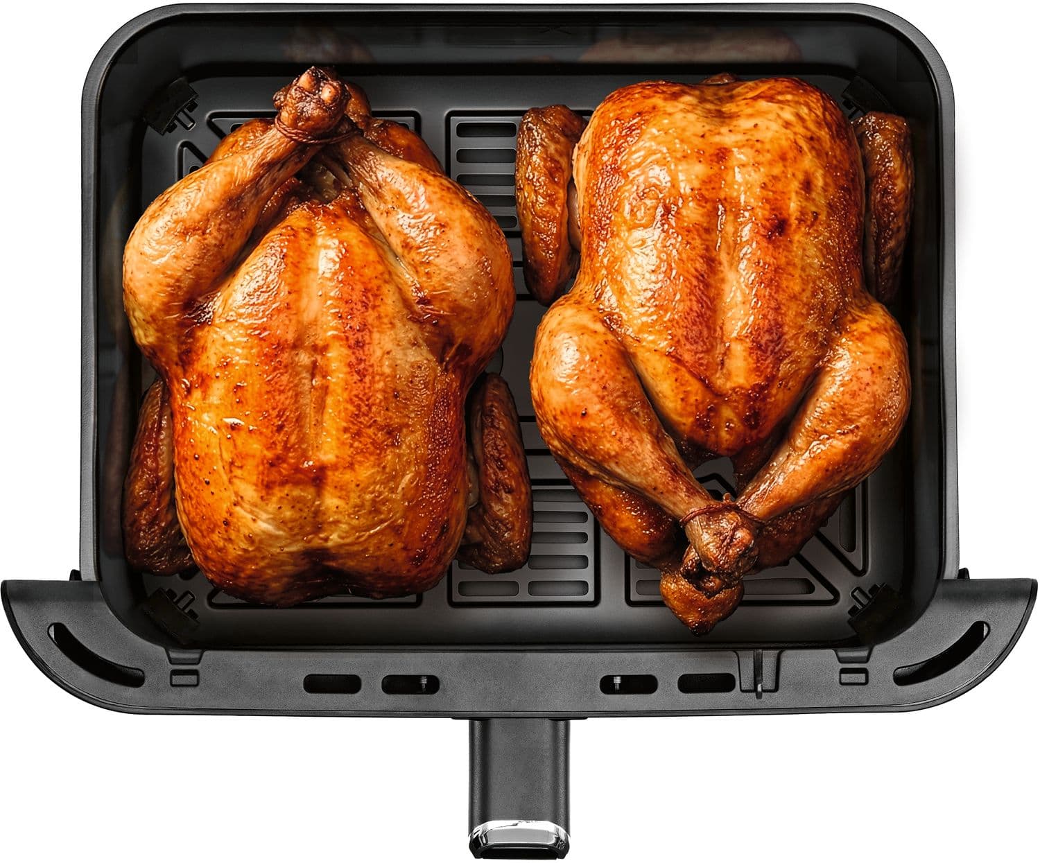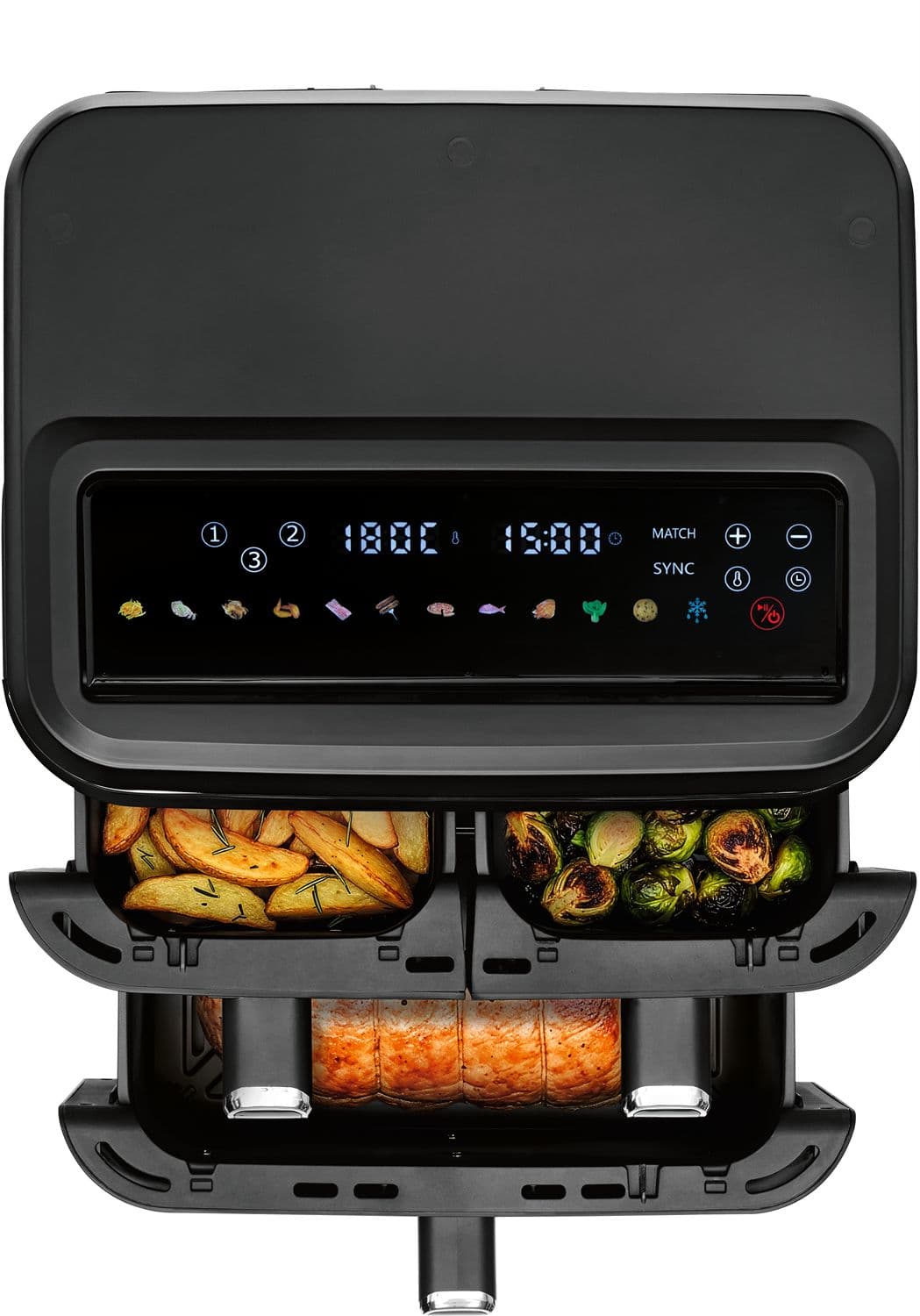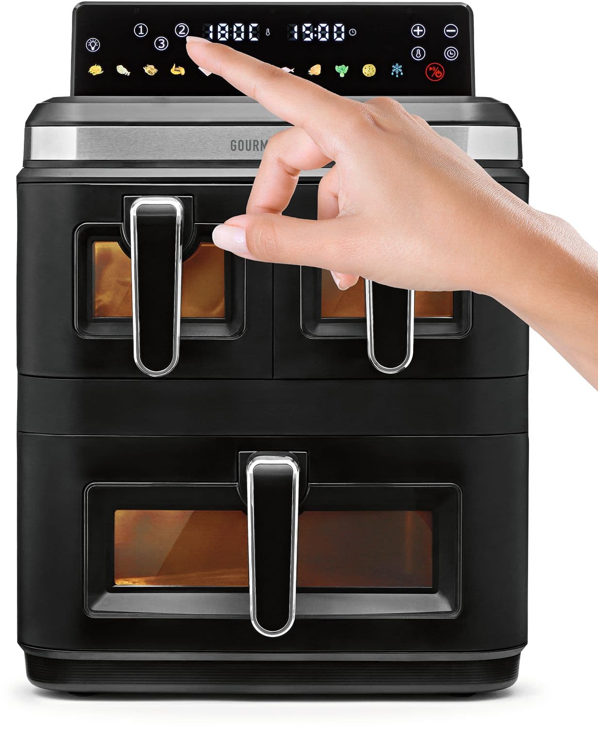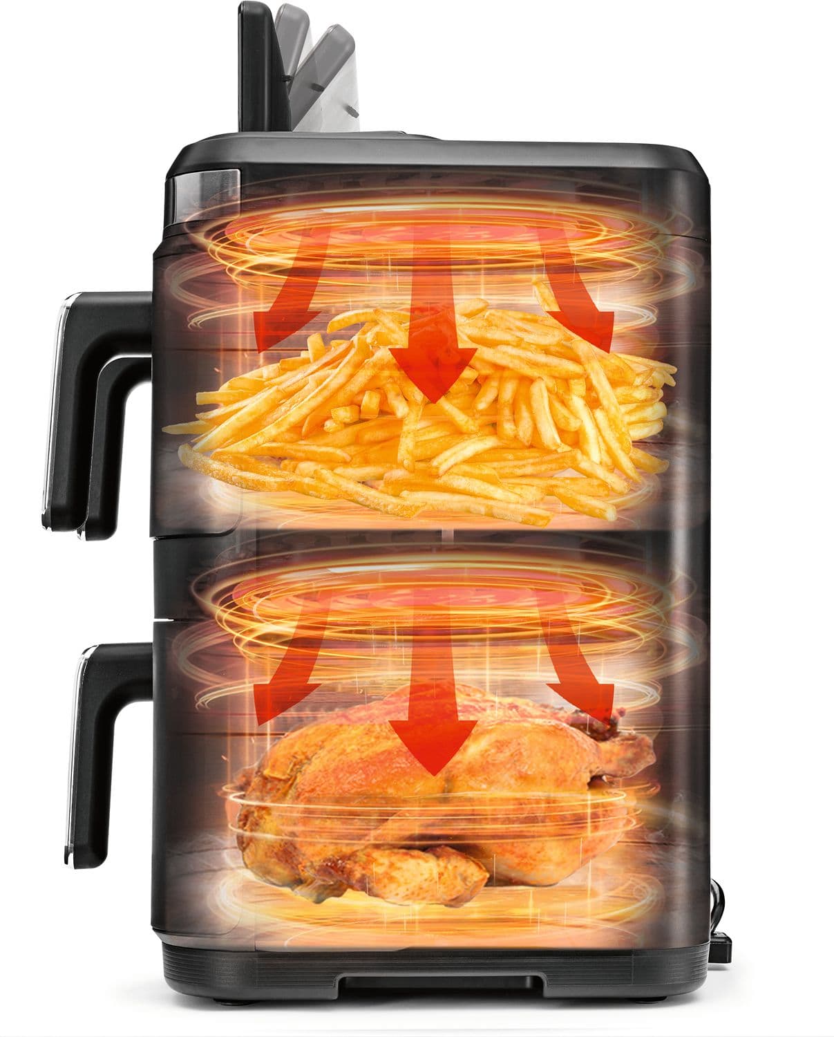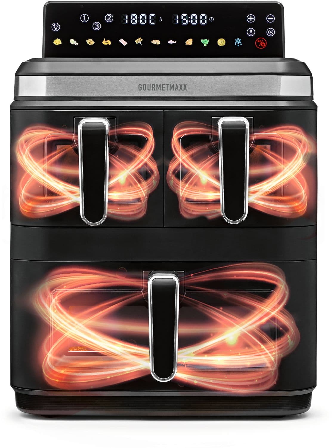 Diese Heißluftfritteuse eignet sich ideal für die Zubereitung verschiedenster Speisen im Alltag. Dank der drei getrennten Kammern können mehrere Gerichte gleichzeitig zubereitet werden, was besonders praktisch im Küchenalltag ist. Das integrierte Sichtfenster ermöglicht es, den Garvorgang jederzeit bequem zu beobachten, ohne das Gerät öffnen zu müssen. Eine praktische Lösung für alle, die flexibel und unkompliziert kochen möchten.