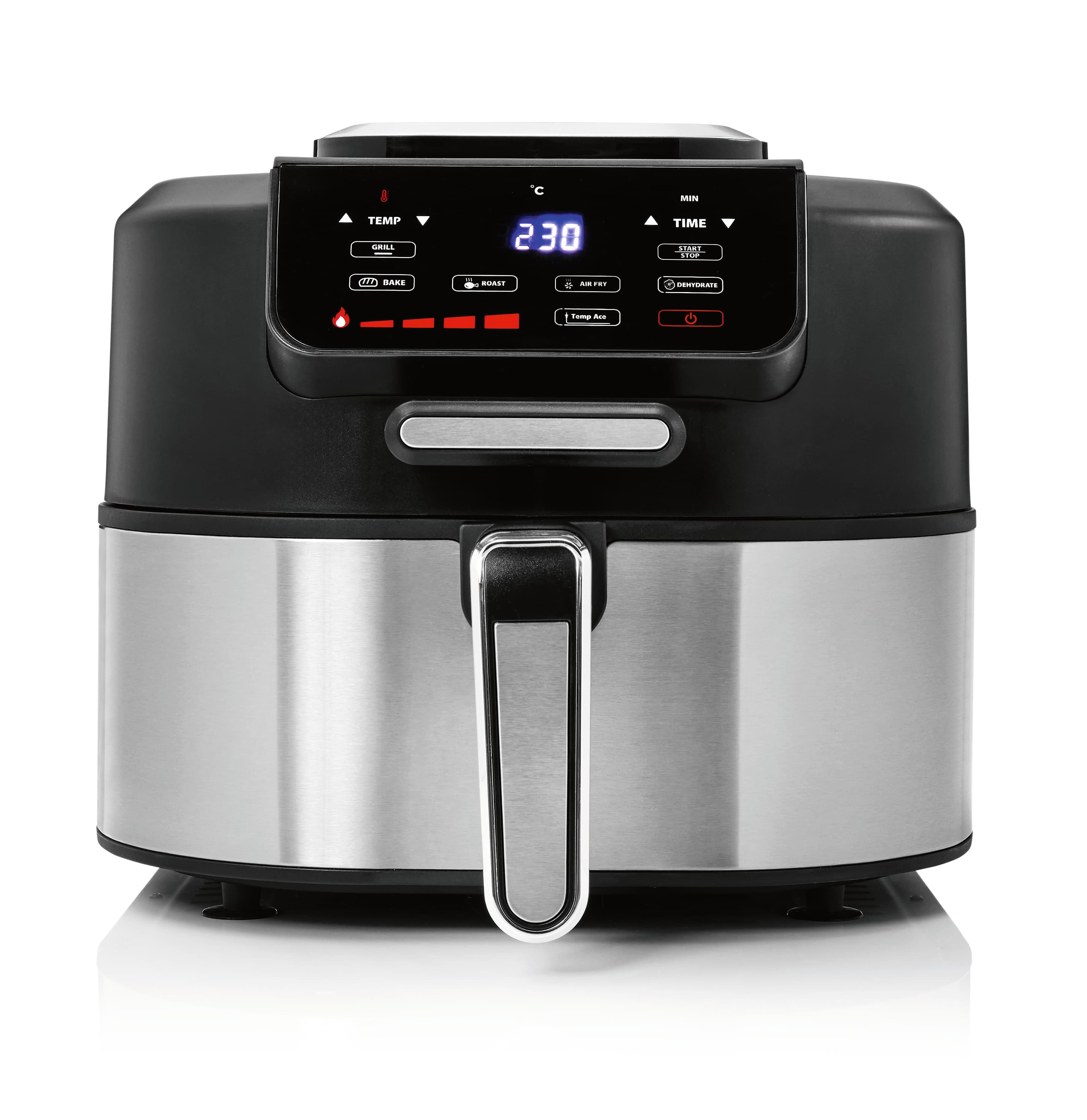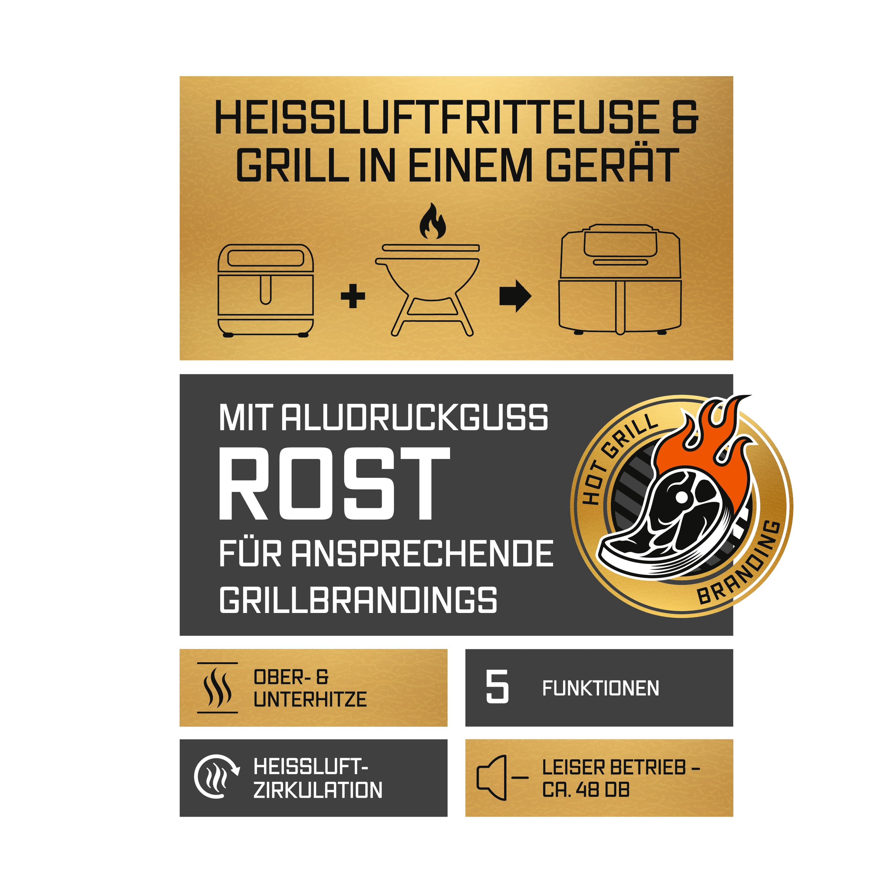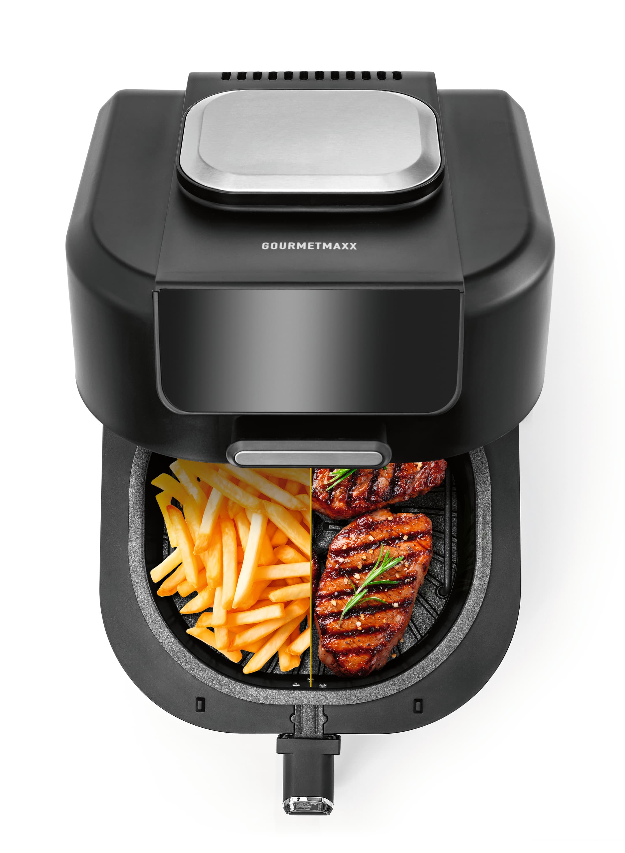 Ein Gerät zum Indoor-Grillen oder doch lieber die Heißuftfritteuse? Mit der GOURMETmaxx Heißluftfritteuse FryBBQ erhältst du beides und noch mehr für kreative Abwechslung auf deinen Teller. Ob Pommes, Steak, Kuchen, Grillgemüse oder Dörrobst: Wähle eine der 5 praktischen Funktionen; Heißluftfrittieren, Grillen, Backen, Braten oder Dörren auf dem 7-Zoll-LED-Touchdisplay und justiere Temperaturen und Garzeiten ganz nach deinem Geschmack. Besondere Highlights des 2000-Watt-Multi-Tools sind die integrierte Grillfunktion mit 4 Hitzestufen sowie der Aludruckguss-Rost, der für authentische Brandings sorgt. Dazu kommt das smarte Grillthermometer zur exakten Kerntemperaturkontrolle. So gelingt das Steak auf den Punkt! Die 360 Grad Heißluftzirkulation sorgt derweil für außen krosse und innen zarte Ergebnisse, während die großzügige Frittierkorb-Bodenfläche genug Platz für bis zu 5 Portionen Pommes oder bis zu 3 Nackensteaks auf einmal bietet. Praktische Features wie Ober- und Unterhitze, Vorheizfunktion, Memory-Speicher und der leise Betrieb (ca. 48 dB) runden das Paket ab. Alle Zubehörteile sind on top antihaftbeschichtet und spülmaschinengeeignet! Ob du saftige Rippchen grillen, knusprige Gemüsechips zaubern oder fluffigen Kuchen backen möchtest, die GOURMETmaxx Heißluftfritteuse FryBBQ ist dein 2-in-1-Allrounder, der Indoor-Grillen und Heißluftfritteuse vereint. Ein Gerät, viele Möglichkeiten - für kreativen und unkomplizierten Genuss jeden Tag!