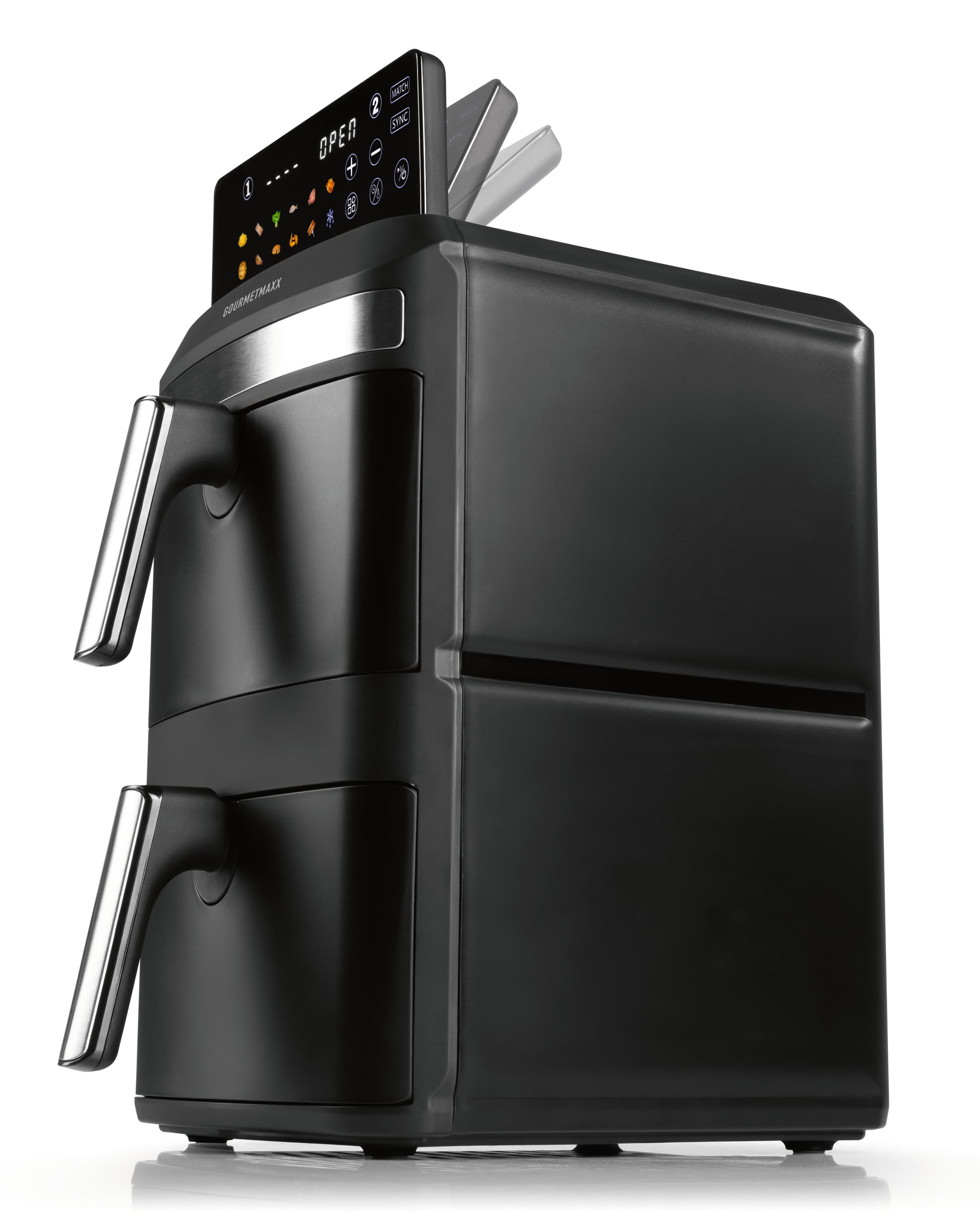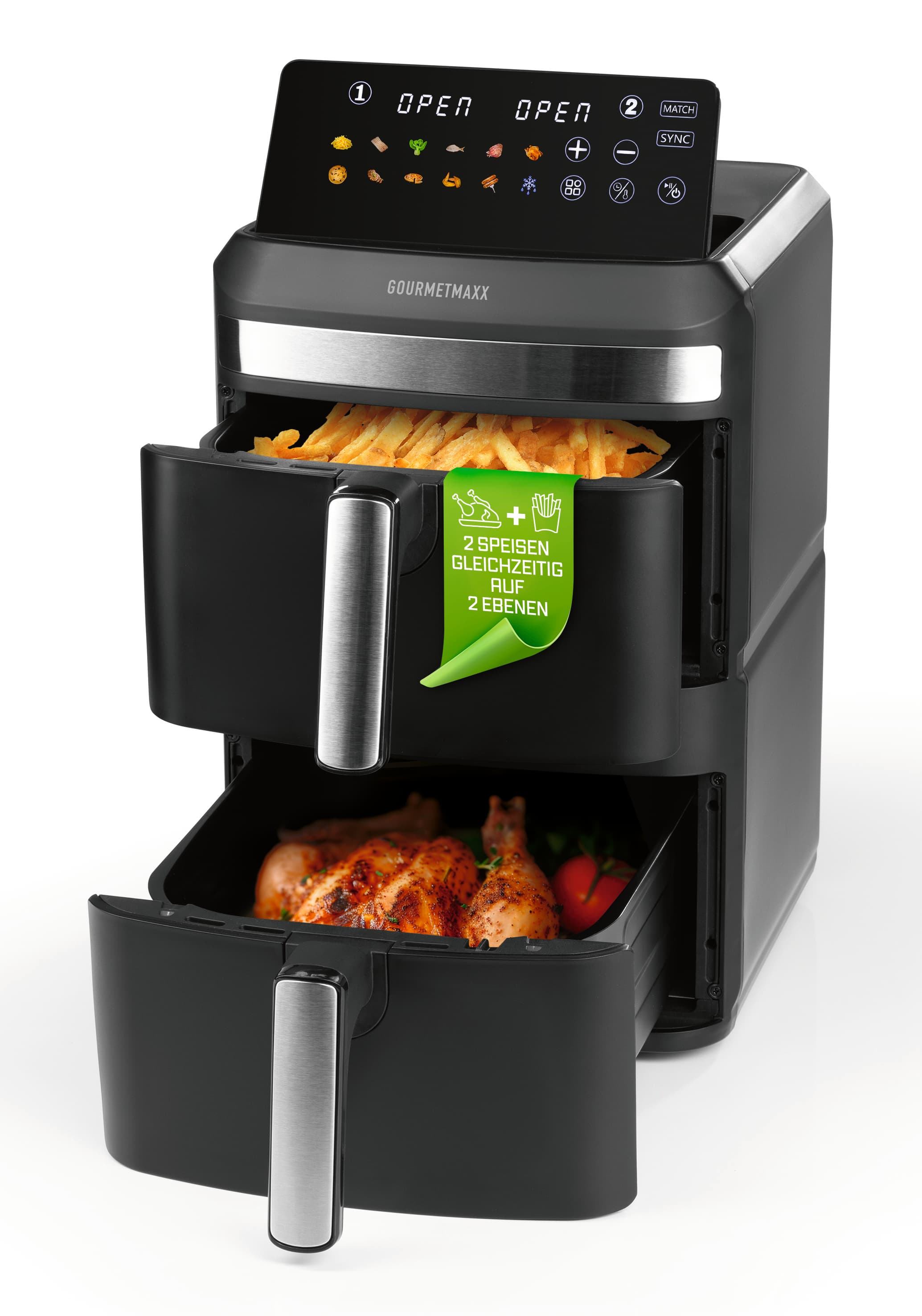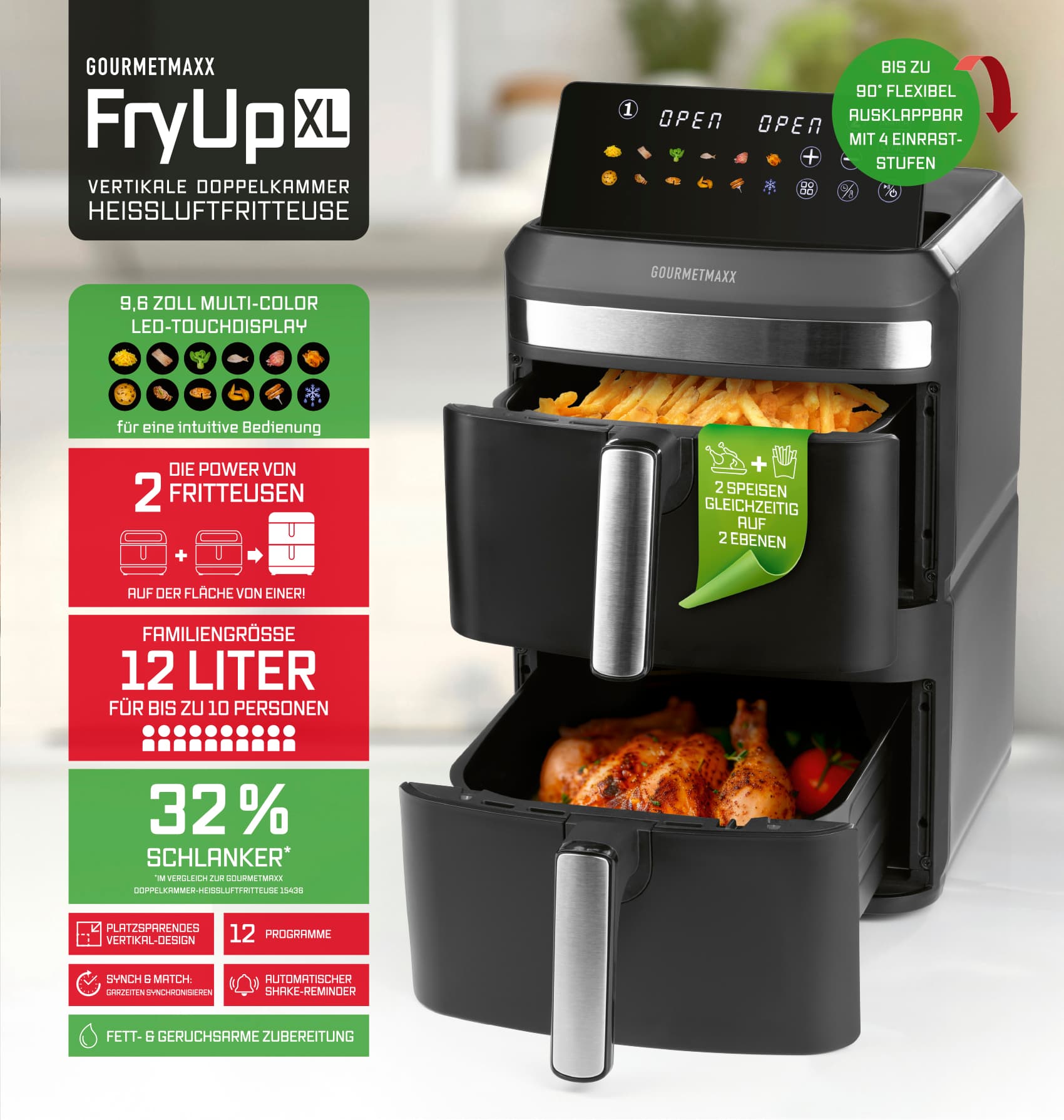 Entdecke die neue Generation von Heißluftfritteusen im vertikalen Design: Mit der GOURMETmaxx Vertikalen Doppelkammer-Heißluftfritteuse bringst du dank 12 Litern Gesamtvolumen (6 l pro Kammer) ganz einfach Lieblingsgerichte für bis zu 10 Personen auf den Tisch. Besonders smart: Das 9,6 Zoll große, farbige LED-Touchdisplay lässt sich bis zu 90° ausklappen und in 4 verschiedenen Winkeln arretieren – für optimale Ablesbarkeit aus vielen Positionen. Farbige Icons und präzise Touchsteuerung machen die Bedienung intuitiv und modern. Sicherer Stand inklusive: mit rutschfesten Füßen bleibt alles an seinem Platz. Mit der SYNC- und MATCH-Funktion passt du die beiden unabhängigen Garzonen flexibel an deine Bedürfnisse an: Unterschiedliche Speisen gleichzeitig fertig oder doppelte Menge in gleicher Zeit – du entscheidest. Die 12 voreingestellten Programme nehmen dir die Einstellung ab und sorgen für perfekte Ergebnisse bei Pommes, Pizza, Fisch, Gemüse und mehr. Dank leistungsstarker 2800 W, Temperaturen bis 200 °C, Timerfunktion (0–60 Min.) und Oberhitze in jeder Kammer mit eigenem Ventilator gart dein Essen schnell und gleichmäßig – außen knusprig, innen saftig. Und nach dem Genuss? Einfach Frittierkorb und Einlegerost in die Spülmaschine – fertig Entfalte dein ganzes Kochpotenzial mit der GOURMETmaxx Vertikalen Doppelkammer-Heißluftfritteuse im platzsparenden Design – intuitiv bedienbar, kross im Ergebnis, perfekt für große Mengen und komplette Menüs.