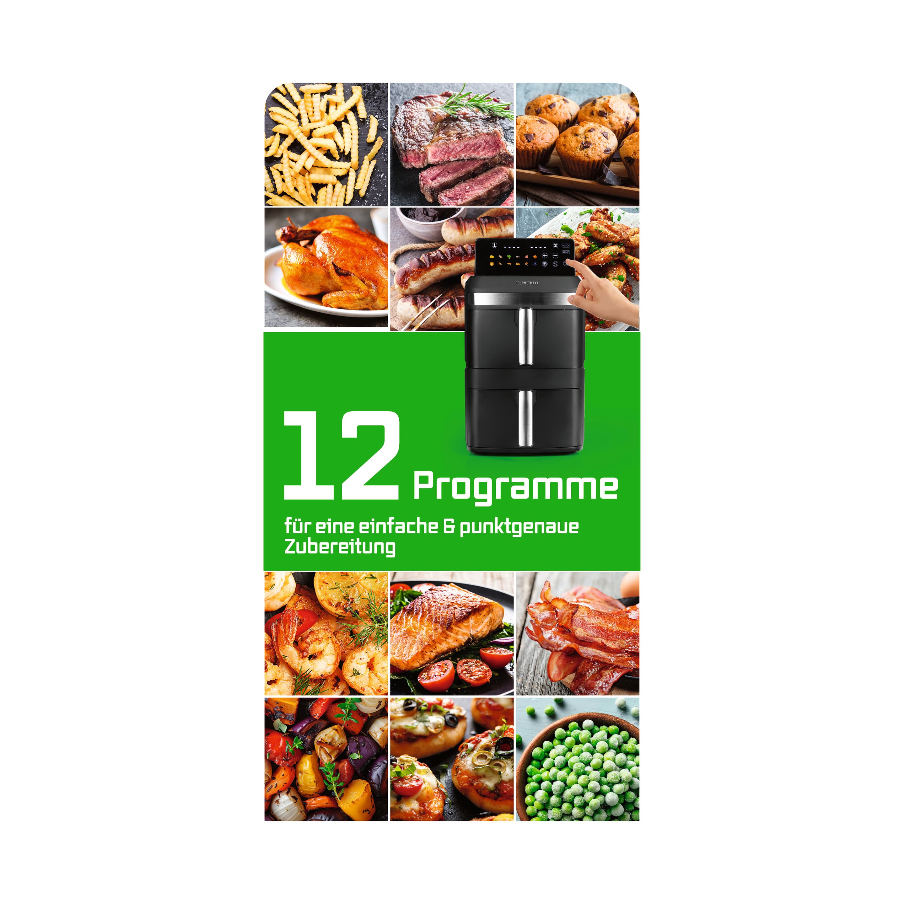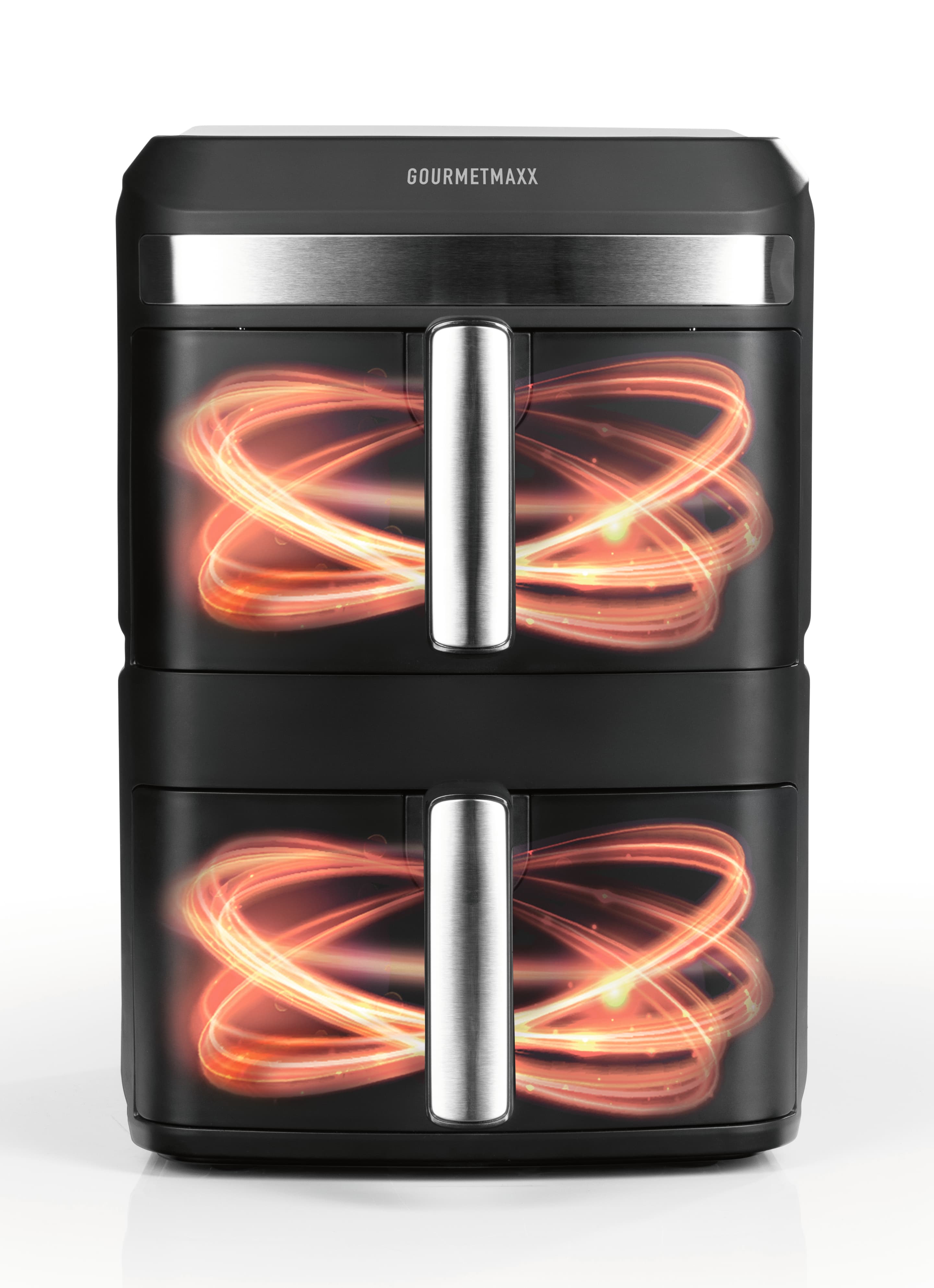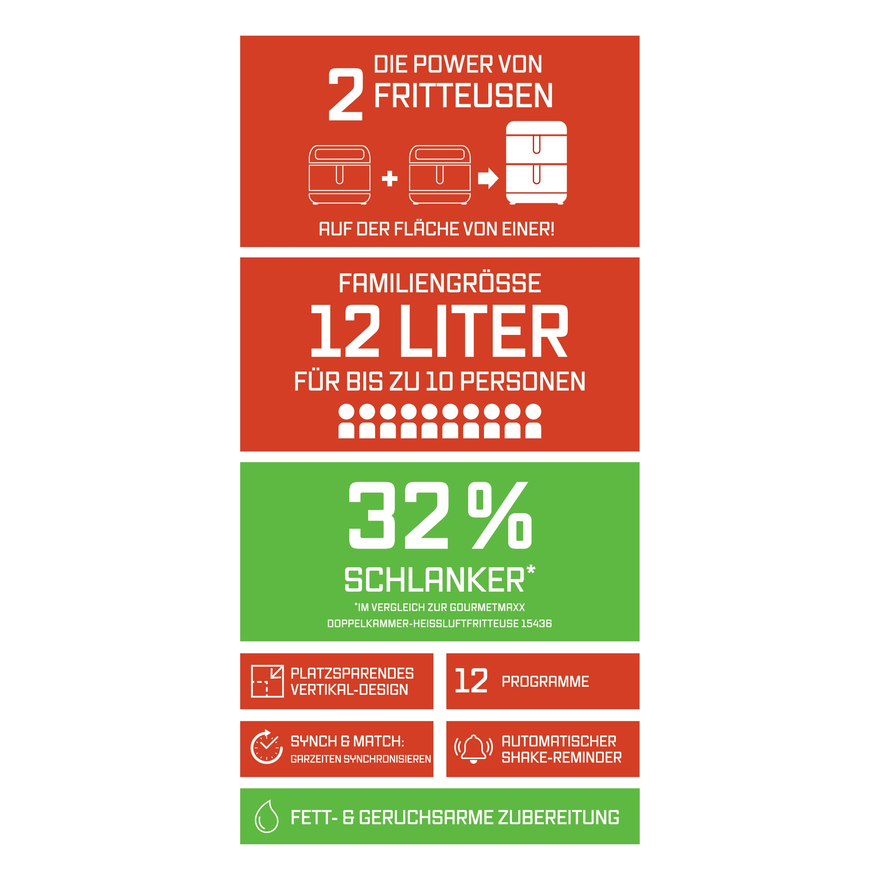 Entdecke die neue Generation von Heißluftfritteusen im vertikalen Design: Mit der GOURMETmaxx Vertikalen Doppelkammer-Heißluftfritteuse bringst du dank 12 Litern Gesamtvolumen (6 l pro Kammer) ganz einfach Lieblingsgerichte für bis zu 10 Personen auf den Tisch. Besonders smart: Das 9,6 Zoll große, farbige LED-Touchdisplay lässt sich bis zu 90° ausklappen und in 4 verschiedenen Winkeln arretieren – für optimale Ablesbarkeit aus vielen Positionen. Farbige Icons und präzise Touchsteuerung machen die Bedienung intuitiv und modern. Sicherer Stand inklusive: mit rutschfesten Füßen bleibt alles an seinem Platz. Mit der SYNC- und MATCH-Funktion passt du die beiden unabhängigen Garzonen flexibel an deine Bedürfnisse an: Unterschiedliche Speisen gleichzeitig fertig oder doppelte Menge in gleicher Zeit – du entscheidest. Die 12 voreingestellten Programme nehmen dir die Einstellung ab und sorgen für perfekte Ergebnisse bei Pommes, Pizza, Fisch, Gemüse und mehr. Dank leistungsstarker 2800 W, Temperaturen bis 200 °C, Timerfunktion (0–60 Min.) und Oberhitze in jeder Kammer mit eigenem Ventilator gart dein Essen schnell und gleichmäßig – außen knusprig, innen saftig. Und nach dem Genuss? Einfach Frittierkorb und Einlegerost in die Spülmaschine – fertig Entfalte dein ganzes Kochpotenzial mit der GOURMETmaxx Vertikalen Doppelkammer-Heißluftfritteuse im platzsparenden Design – intuitiv bedienbar, kross im Ergebnis, perfekt für große Mengen und komplette Menüs.