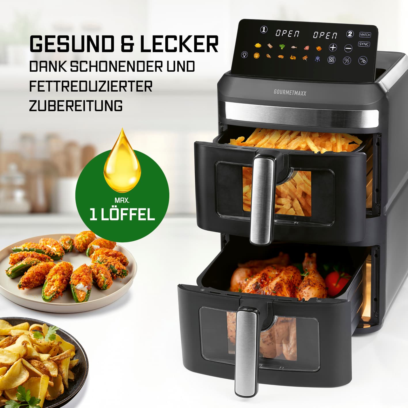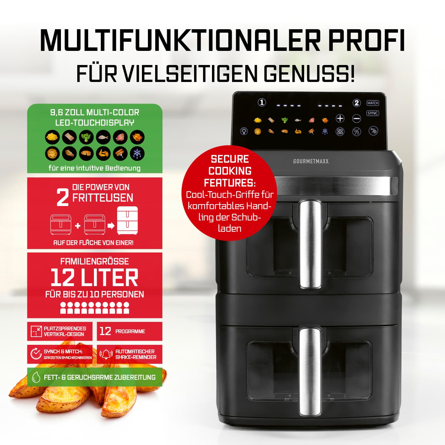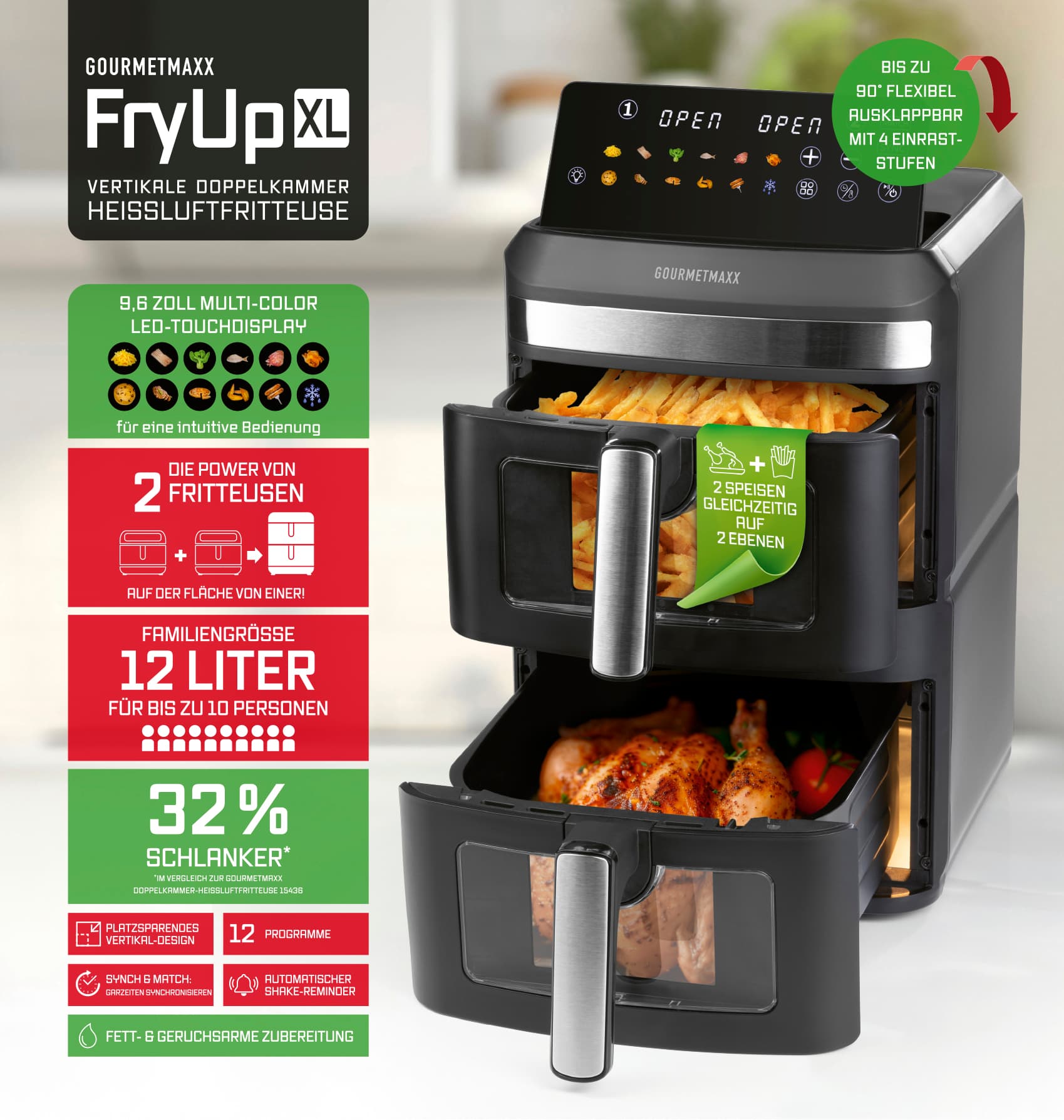 Entdecke die neue Generation von Heißluftfritteusen im vertikalen Design: Mit der GOURMETmaxx Vertikalen Doppelkammer-Heißluftfritteuse bringst du dank 12 Litern Gesamtvolumen (6 l pro Kammer) ganz einfach Lieblingsgerichte für bis zu 10 Personen auf den Tisch. Mit zwei praktischen Sichtfenstern in den Frittierkörben hast du dein Gargut immer perfekt im Blick! Besonders smart: Das 9,6 Zoll große, farbige LED-Touchdisplay lässt sich bis zu 90° ausklappen und in 4 verschiedenen Winkeln arretieren – für optimale Ablesbarkeit aus vielen Positionen. Farbige Icons und präzise Touchsteuerung machen die Bedienung intuitiv und modern. Sicherer Stand inklusive: mit rutschfesten Füßen bleibt alles an seinem Platz. Mit der SYNC- und MATCH-Funktion passt du die beiden unabhängigen Garzonen flexibel an deine Bedürfnisse an: Unterschiedliche Speisen gleichzeitig fertig oder doppelte Menge in gleicher Zeit – du entscheidest. Die 12 voreingestellten Programme nehmen dir die Einstellung ab und sorgen für perfekte Ergebnisse bei Pommes, Pizza, Fisch, Gemüse und mehr. Dank leistungsstarker 2800 W, Temperaturen bis 200 °C, Timerfunktion (0–60 Min.) und Oberhitze in jeder Kammer mit eigenem Ventilator gart dein Essen schnell und gleichmäßig – außen knusprig, innen saftig. Und nach dem Genuss? Einfach Frittierkorb und Einlegerost in die Spülmaschine – fertig Entfalte dein ganzes Kochpotenzial mit der GOURMETmaxx Vertikalen Doppelkammer-Heißluftfritteuse im platzsparenden Design – intuitiv bedienbar, kross im Ergebnis, perfekt für große Mengen und komplette Menüs.