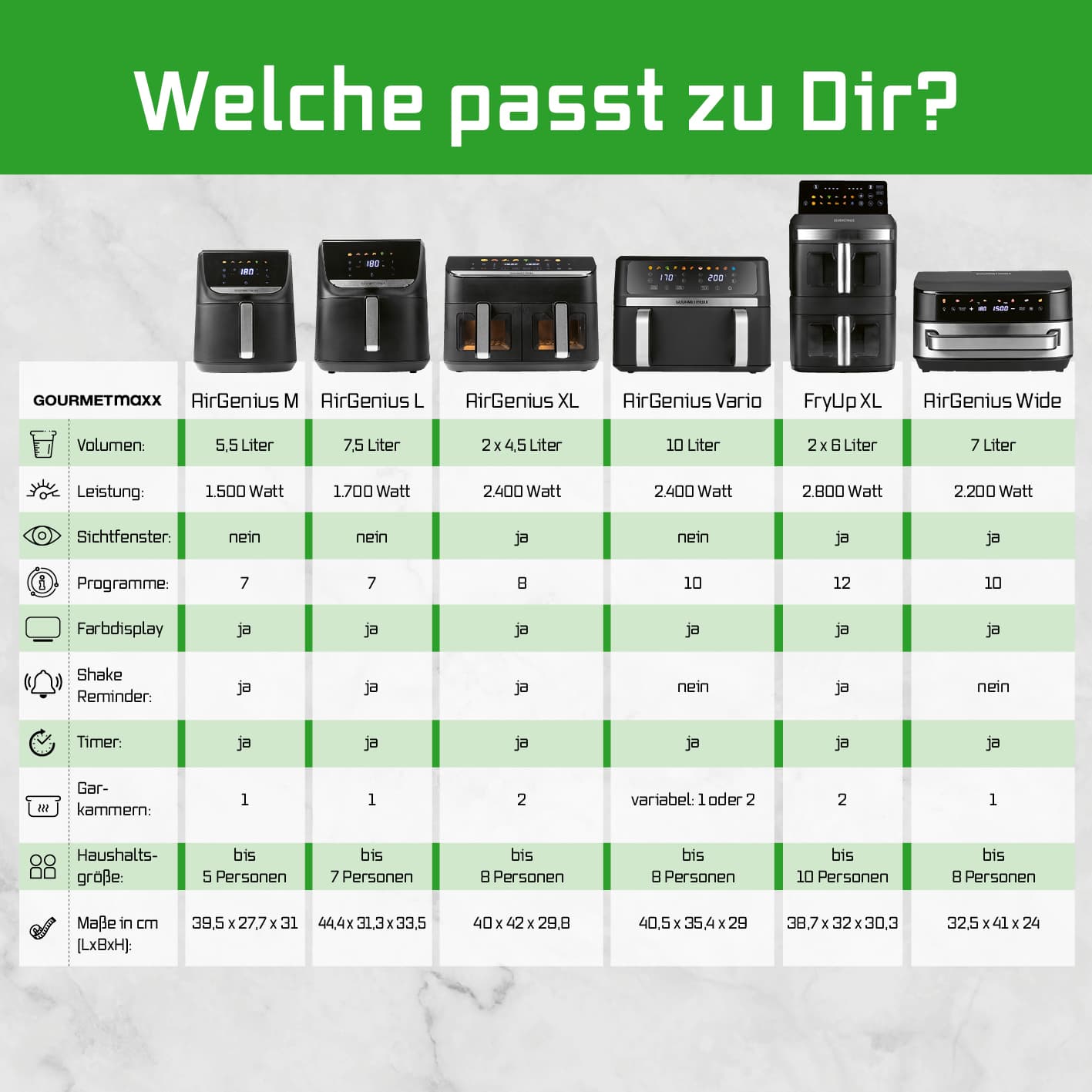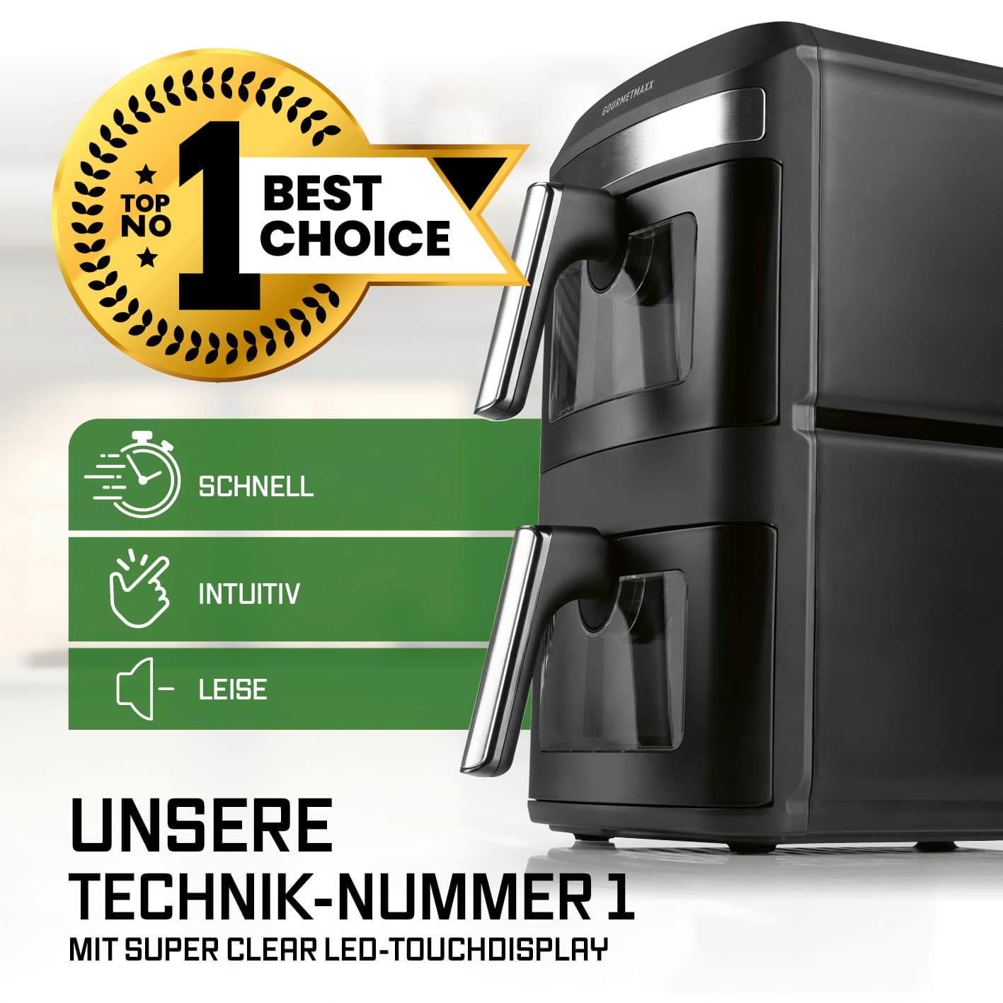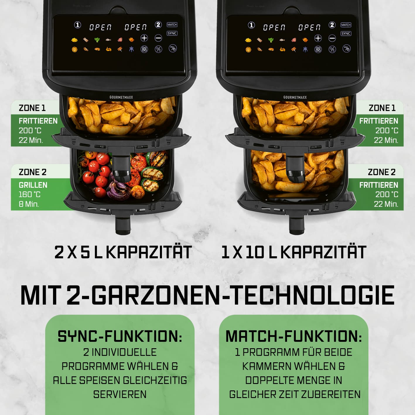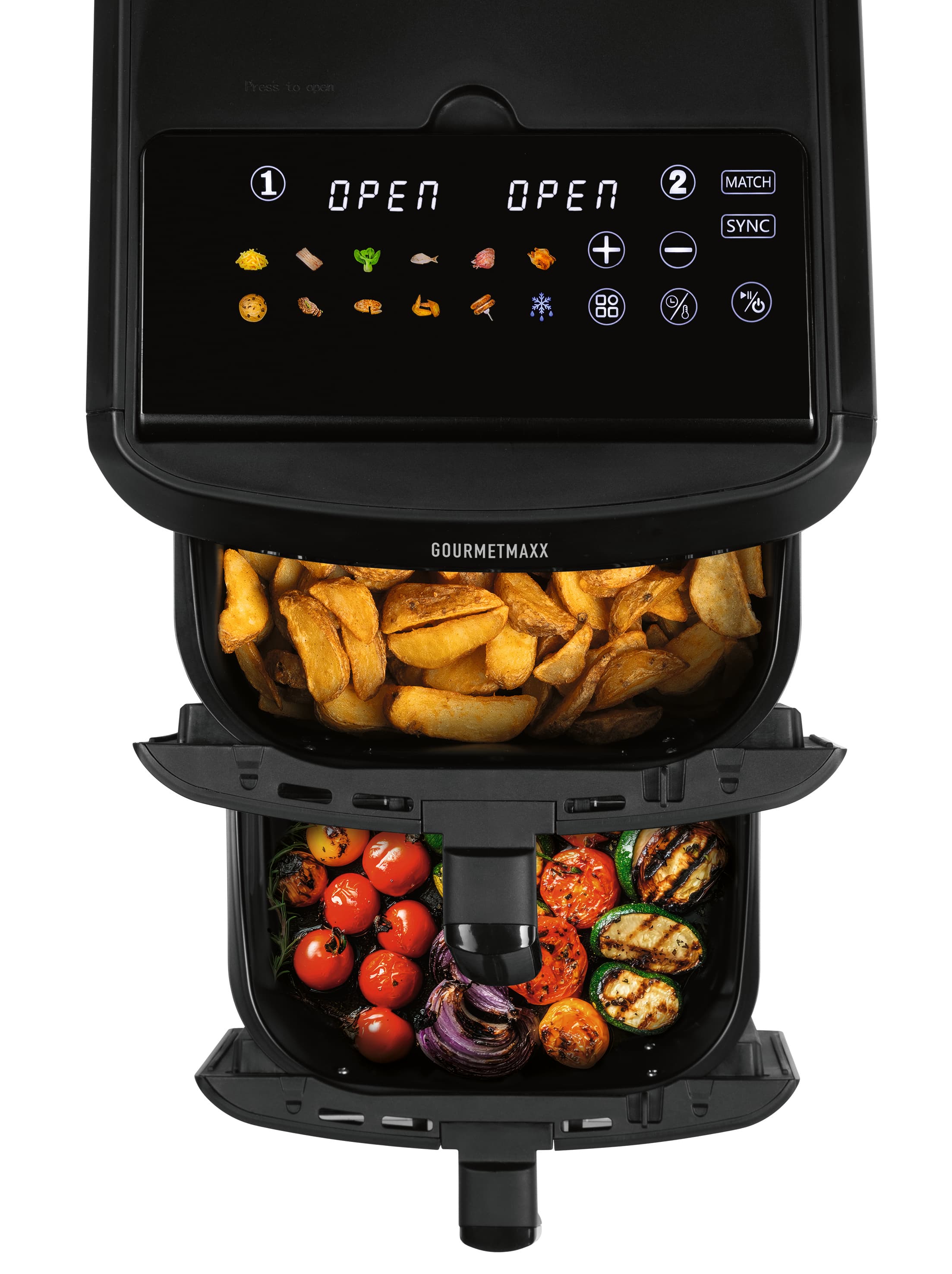 Entdecke die neue Generation von Heißluftfritteusen im vertikalen Design: Mit der GOURMETmaxx Vertikalen Doppelkammer-Heißluftfritteuse bringst du dank 12 Litern Gesamtvolumen (6 l pro Kammer) ganz einfach Lieblingsgerichte für bis zu 10 Personen auf den Tisch. Mit zwei praktischen Sichtfenstern in den Frittierkörben hast du dein Gargut immer perfekt im Blick! Besonders smart: Das 9,6 Zoll große, farbige LED-Touchdisplay lässt sich bis zu 90° ausklappen und in 4 verschiedenen Winkeln arretieren – für optimale Ablesbarkeit aus vielen Positionen. Farbige Icons und präzise Touchsteuerung machen die Bedienung intuitiv und modern. Sicherer Stand inklusive: mit rutschfesten Füßen bleibt alles an seinem Platz. Mit der SYNC- und MATCH-Funktion passt du die beiden unabhängigen Garzonen flexibel an deine Bedürfnisse an: Unterschiedliche Speisen gleichzeitig fertig oder doppelte Menge in gleicher Zeit – du entscheidest. Die 12 voreingestellten Programme nehmen dir die Einstellung ab und sorgen für perfekte Ergebnisse bei Pommes, Pizza, Fisch, Gemüse und mehr. Dank leistungsstarker 2800 W, Temperaturen bis 200 °C, Timerfunktion (0–60 Min.) und Oberhitze in jeder Kammer mit eigenem Ventilator gart dein Essen schnell und gleichmäßig – außen knusprig, innen saftig. Und nach dem Genuss? Einfach Frittierkorb und Einlegerost in die Spülmaschine – fertig Entfalte dein ganzes Kochpotenzial mit der GOURMETmaxx Vertikalen Doppelkammer-Heißluftfritteuse im platzsparenden Design – intuitiv bedienbar, kross im Ergebnis, perfekt für große Mengen und komplette Menüs.