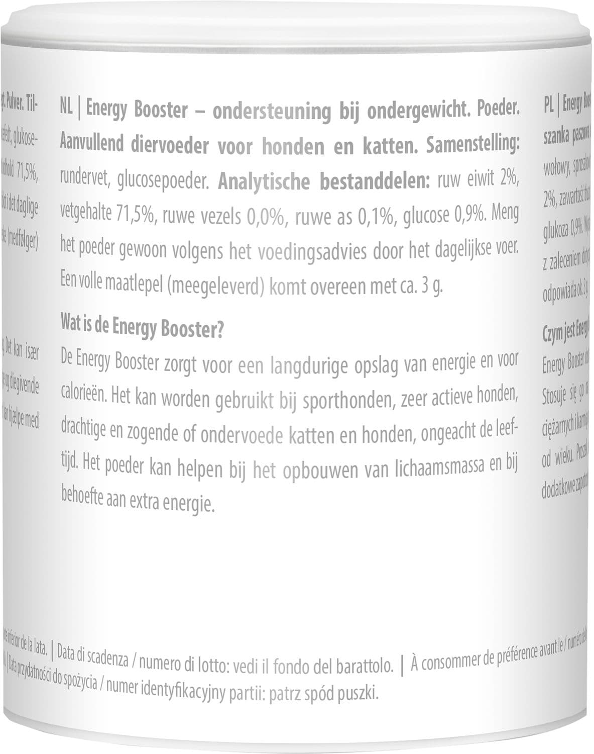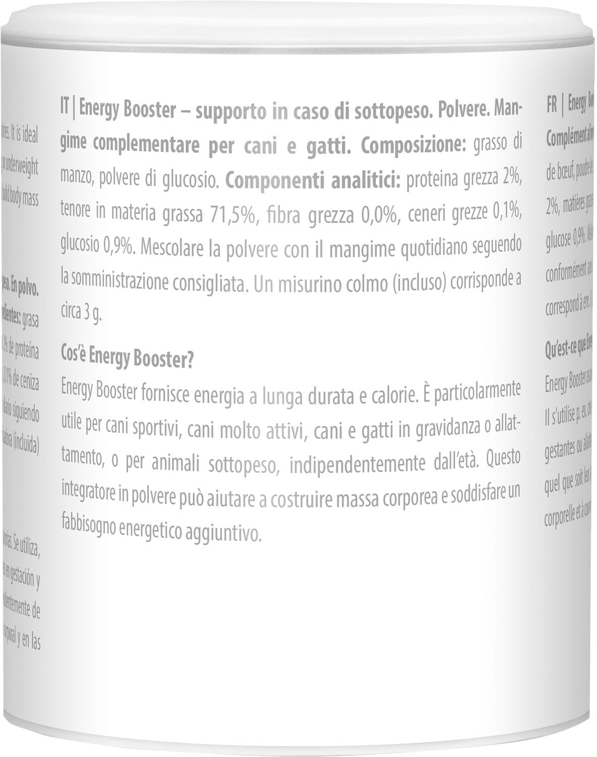Der Energy Booster liefert Langzeit-Speicher-Energie und Kalorien. Er kommt z. B. bei Sporthunden, sehr aktiven Hunden, trächtigen und säugenden oder unterernährten Hunden und Katzen, egal welchen Alters, zum Einsatz. Das Pulver kann beim Aufbau von Körpermasse und bei zusätzlichem Energiebedarf helfen.