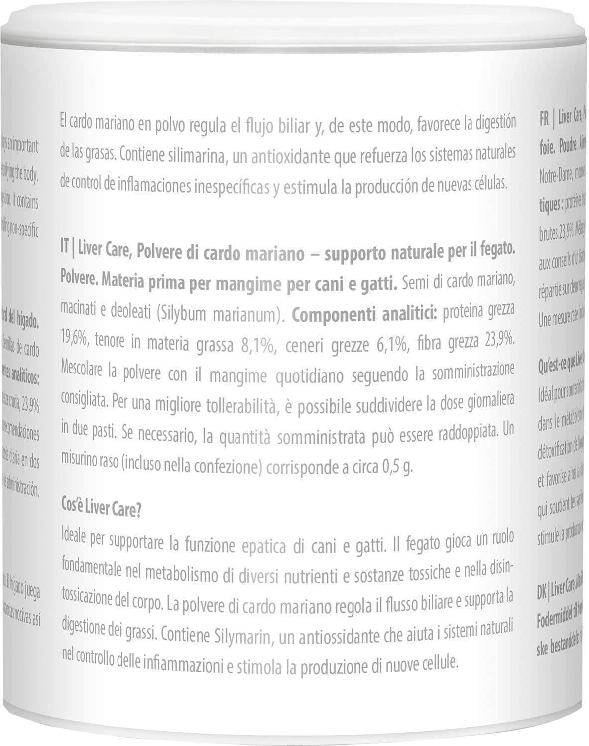 Mariendistelpulver reguliert den Gallenfluss und unterstützt dadurch die Fettverdauung. Es enthält Silymarin, ein Antioxidans, welches die natürlichen Systeme zur Kontrolle von unspezifischen Entzündungen unterstützt und die Produktion neuer Zellen stimuliert.